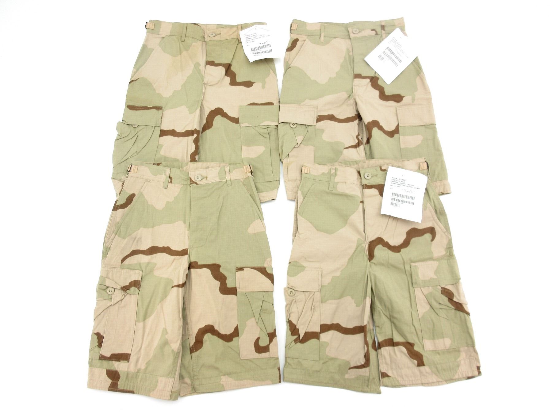 LOT INCLUDES; (4) DESERT CAMO PATTERN COMBAT SHORTS, SIZE XS-LONG, VARIOUS LABELS & MARKINGS ON ALL, BUTTON-FRONTS, SHOWS SLIGHT WEAR ON SOME (STAINS). SEE PHOTOS.