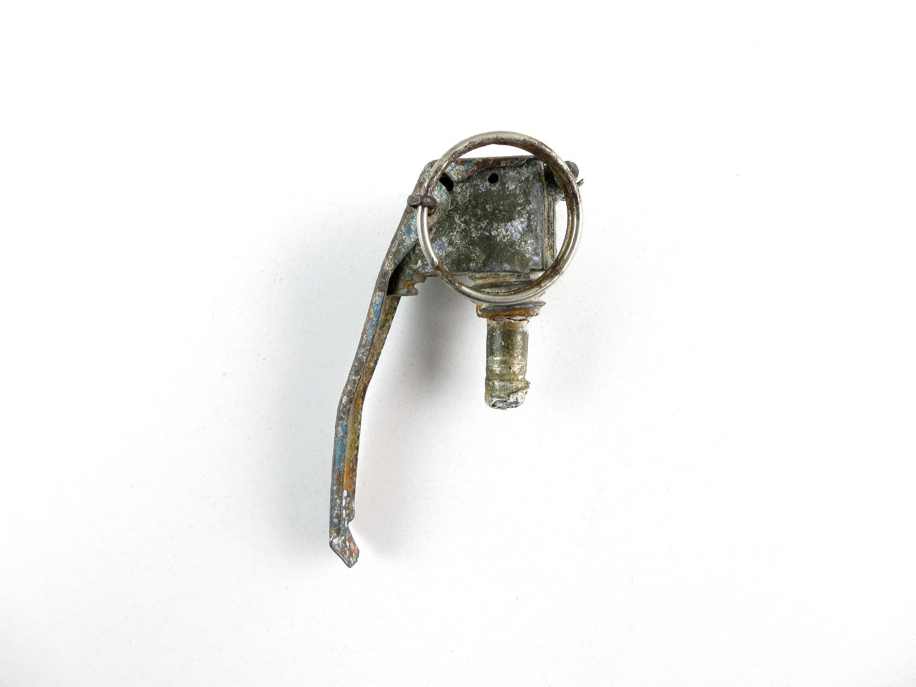 (1) METAL GRENADE FUZE, FITS PINEAPPLE GRENADES ETC., BLUE PRACTICE HANDLE WITH PULL RING & THREADED BODY, VARIOUS FAINT / UN-CLEAR MARKINGS ON HANDLE, OAL APPROX. 3.75". SEE PHOTOS.