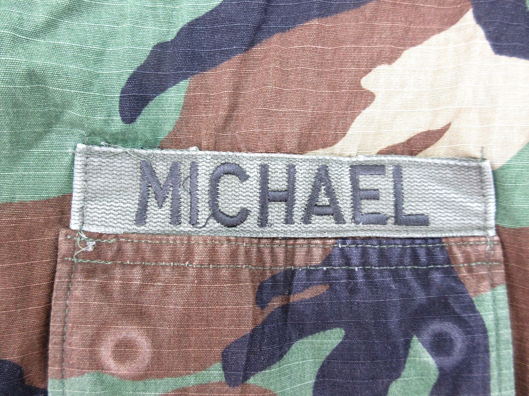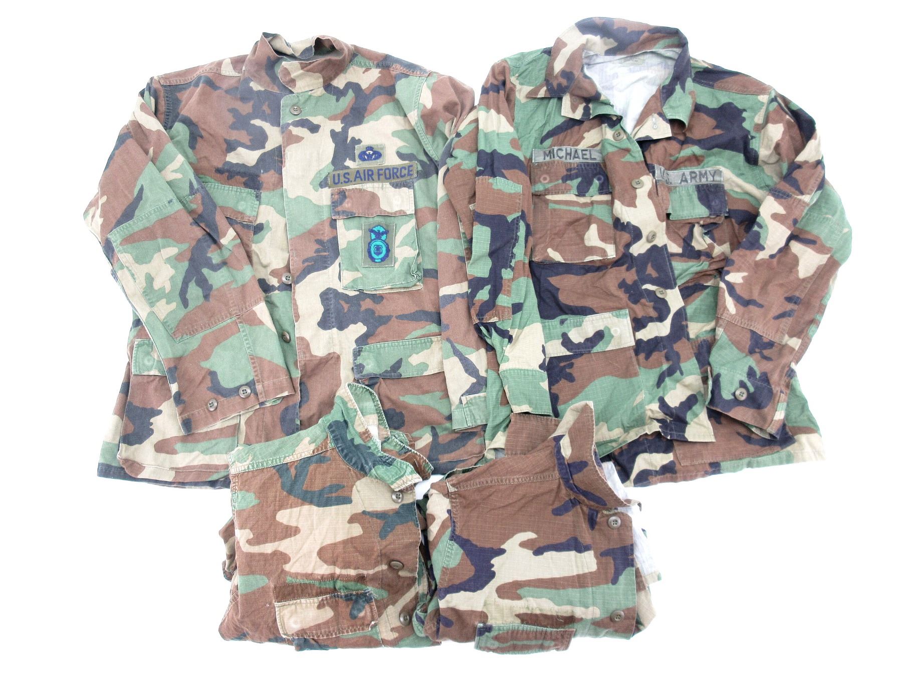 LOT INCLUDES; (4) WOODLAND CAMO PATTERN COMBAT COATS, SIZES M-REGULAR, M-LONG & ONE UNKNOWN SIZE, VARIOUS LABELS & MARKINGS ON ALL, BUTTON-FRONTS (ONE MISSING A BUTTON), SOME WITH VARIOUS BADGES, SHOWS WEAR, UNKNOWN SIZE COAT SHOULDER WIDTH APPROX. 19". SEE PHOTOS.