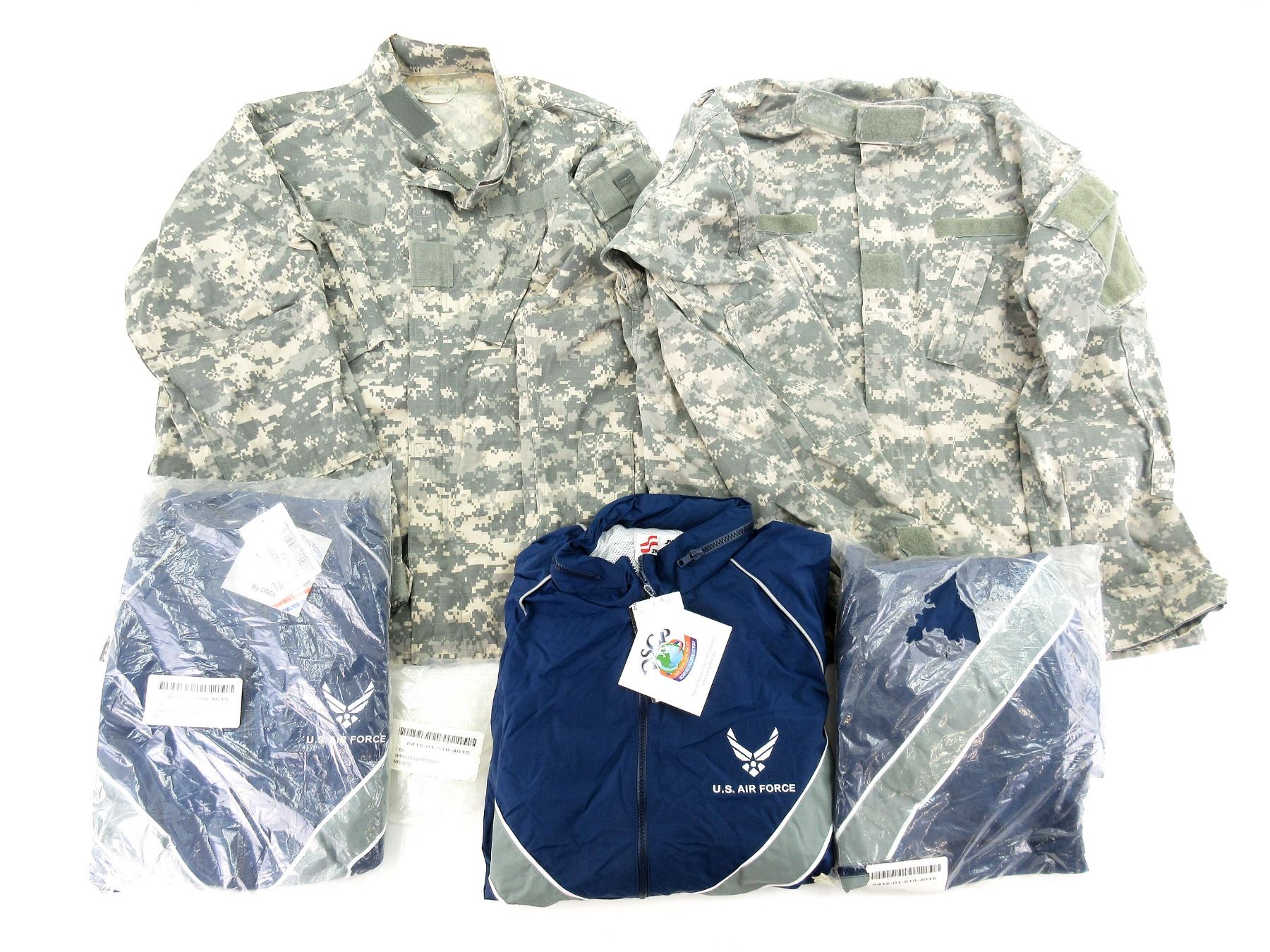 LOT INCLUDES; (3) PHYSICAL FITNESS JACKETS, SIZE XL LONG, MARKED: "JWOD, SKILCRAFT, X-LARGE/LONG, 8415-01-518-4615, JACKET, AF, PTU" ETC. & VARIOUS OTHER MARKINGS, APPEARS NOS & (2) UNIVERSAL CAMO PATTERN COMBAT COATS, SIZE XL-LONG, VARIOUS LABELS & MARKINGS ON BOTH, VELCRO / ZIPPERED-FRONTS (WORKS), SHOWS WEAR. SEE PHOTOS.