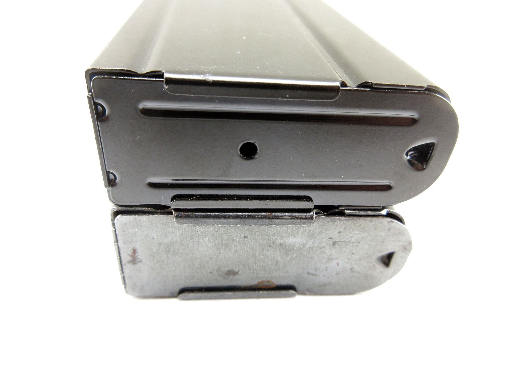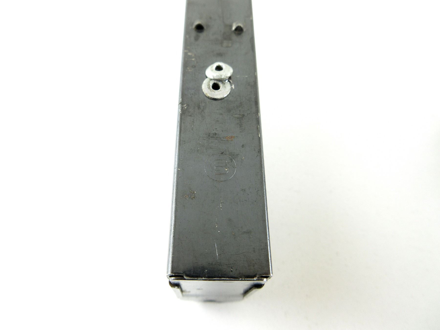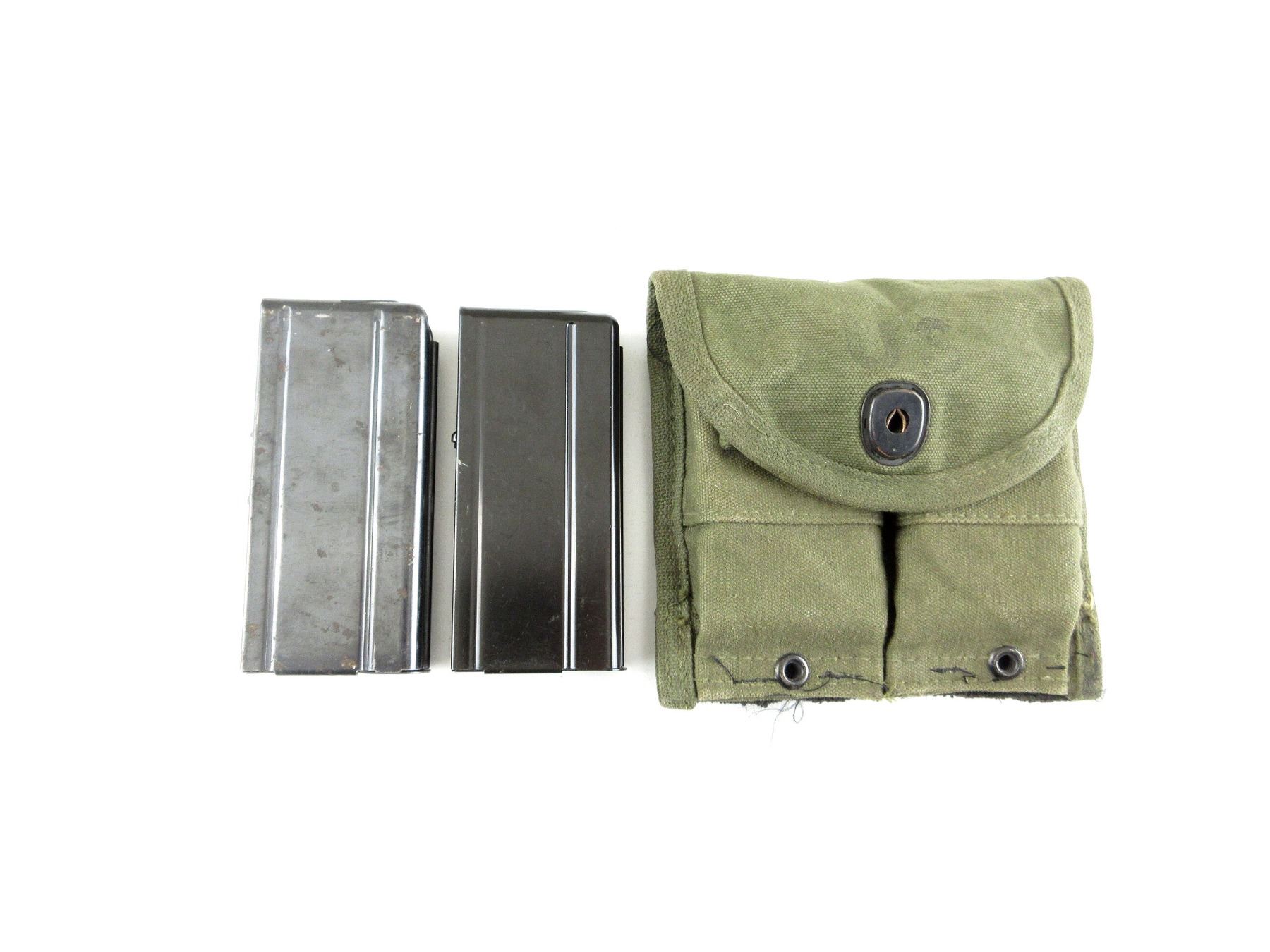 LOT INCLUDES; (1) M1 CARBINE RIFLE MAGAZINE, .30 M1, 5/15 ROUND PINNED MAG, BLUED STEEL CONSTRUCTION, MARKED: "B", (1) M1 CARBINE RIFLE MAGAZINE, .30 M1, 5/10 ROUND PINNED MAG, BLUED STEEL CONSTRUCTION, MARKED: "U", (1) U.S. MILITARY DOUBLE MAGAZINE POUCH, GREEN CANVAS CONSTRUCTION, FRONT MARKED: "U.S.", INSIDE MARKED WITH VARIOUS FAINT / UNCLEAR MARKINGS, WITH BRASS FITTINGS. SEE PHOTOS. PAL REQUIRED.