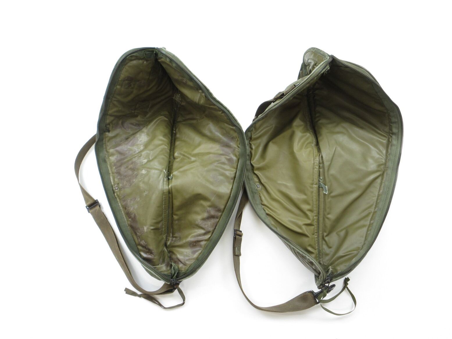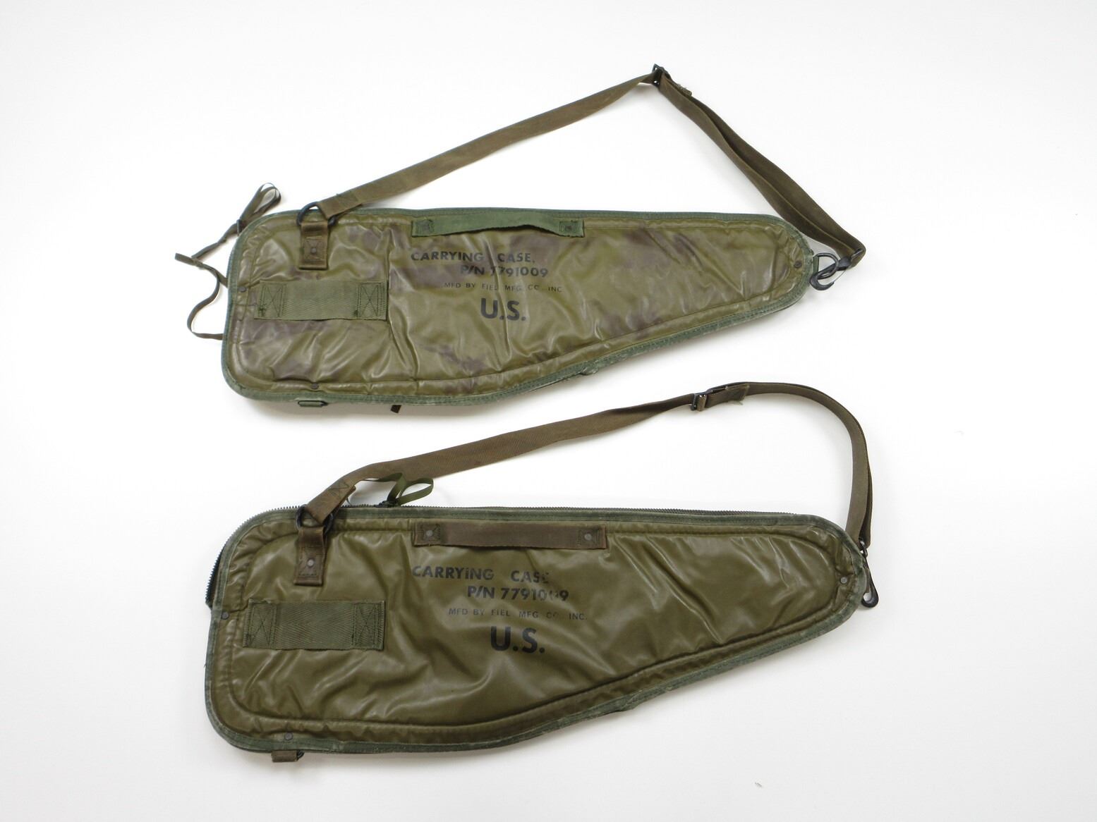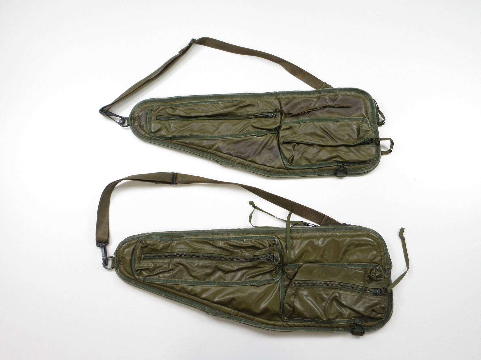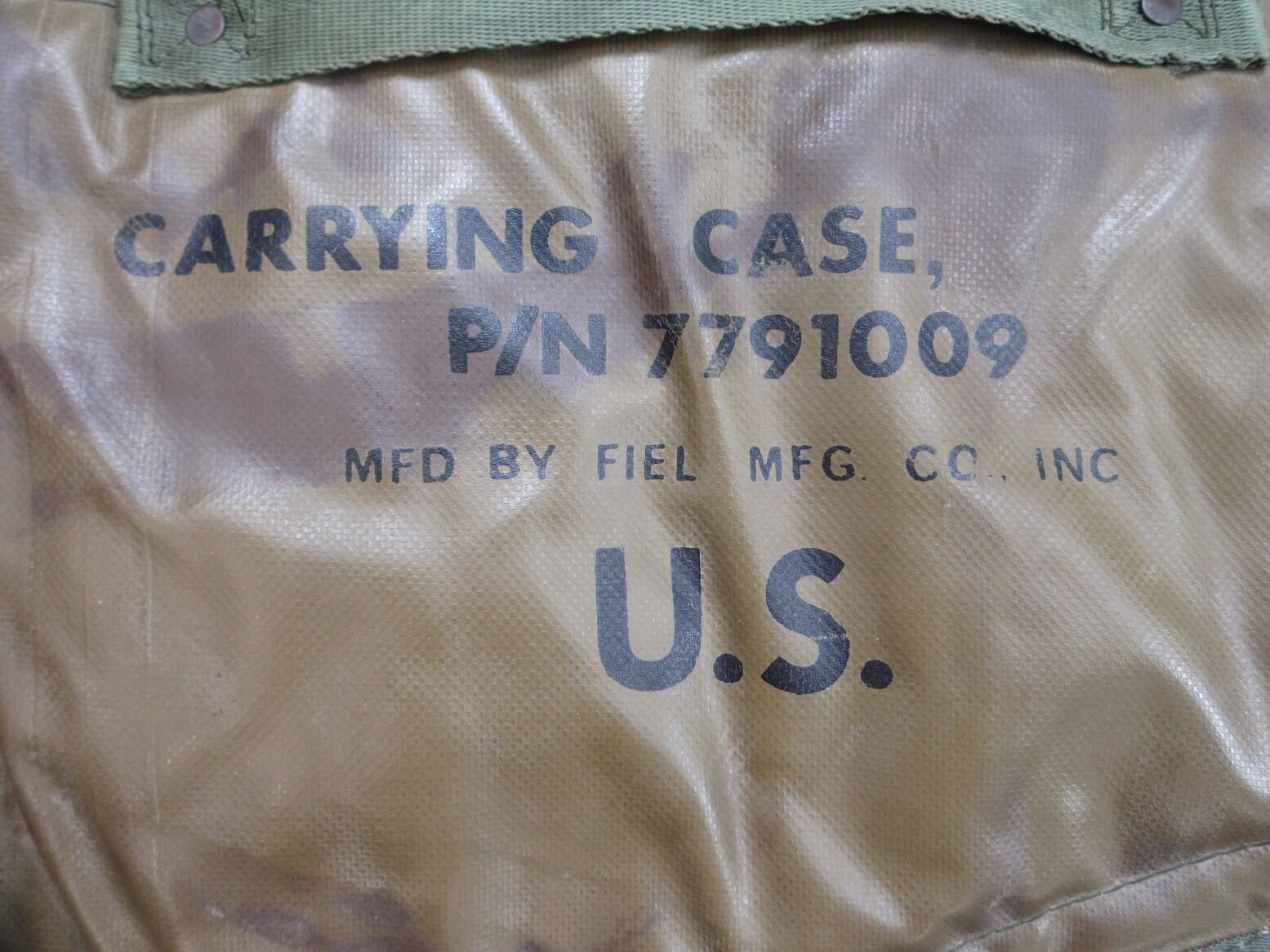LOT INCLUDES; (2) GREEN RUBBERIZED CANVAS WITH ZIPPERS (WORK) & SHOULDER STRAP, MARKED: "CARRYING CASE, P/N 7791009, MFD BY FIEL MFG. CO. INC., U.S.", OAL APPROX. 28.5". SEE PHOTOS.