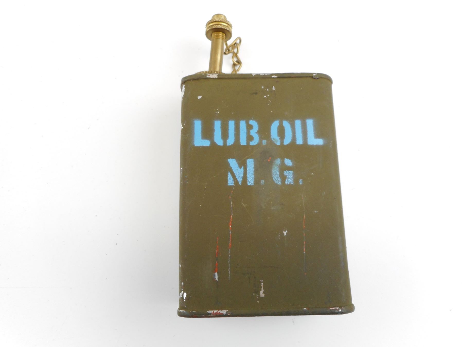 U.S. MILITARY MG OIL CAN , MARKED LUB. OIL M.G., STEEL WITH BRASS SPOUT, NOT OTHER VISIBLE MARKINGS, APPROX. SIZE 5 X 3 1/2 X 2