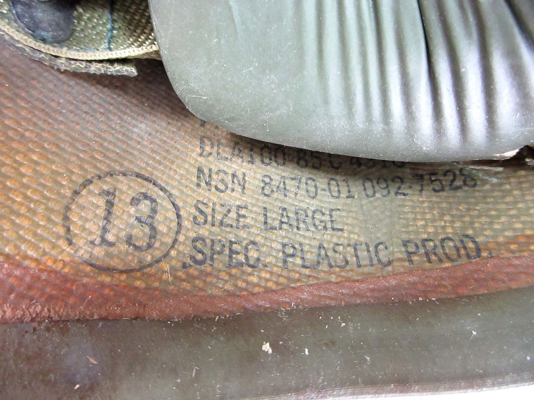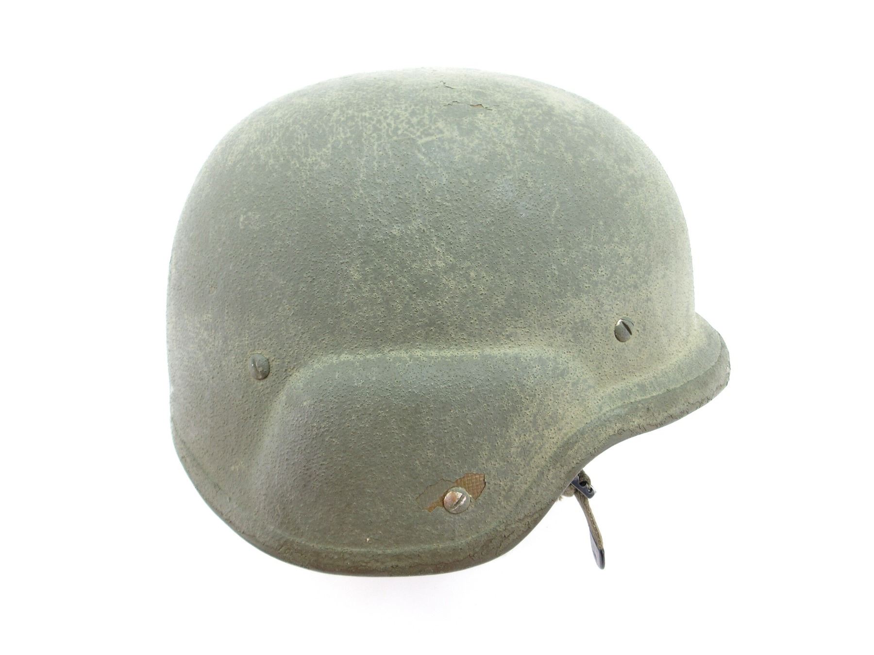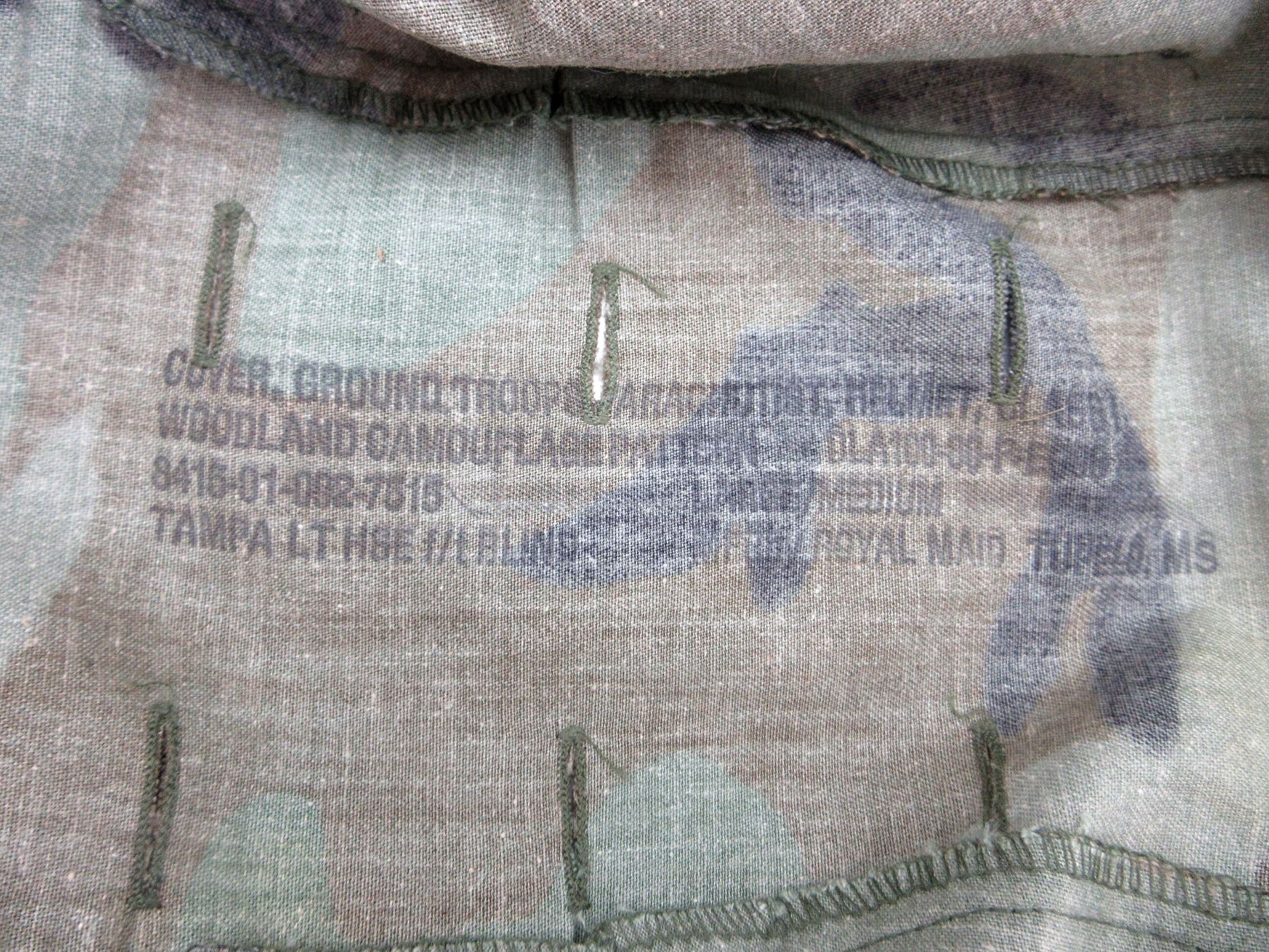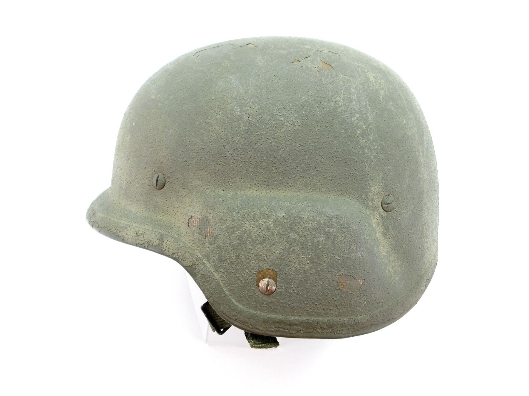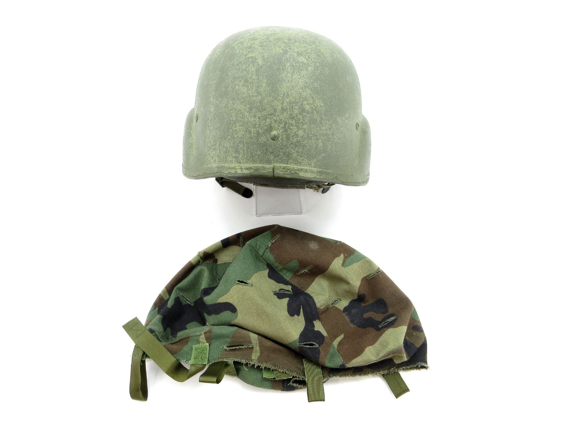 (1) GREEN KEVLAR PASGT HELMET EDGED WITH RUBBER STRIP, LEATHER & NYLON LINER ATTACHED BY SIX SCREWS, LARGE PIECE OF FOAM PAD ON INNER BACK OF HELMET, CANVAS & NYLON CHIN STRAP, METAL FITTINGS ON CHIN STRAP, HELMET MARKED: "PASGT HELMET, DLA100-85-C-4318, NSN 8470-01-092-7528, SIZE LARGE, SPEC. PLASTIC PROD.", "13" IN A CIRCLE & VARIOUS OTHER MARKINGS, LEATHER & NYLON HEAD LINER & (1) CAMO HELMET COVER, MARKED: "COVER, GROUND TROOPS, PARACHUTIST, HELMET, CLASS 1, WOODLAND CAMOUFLAGE PATTERN, 8415-01-0?2-7515, LARGE/MEDIUM" ETC., SIX VELCRO STRAPS TO ATTACH. SEE PHOTOS.