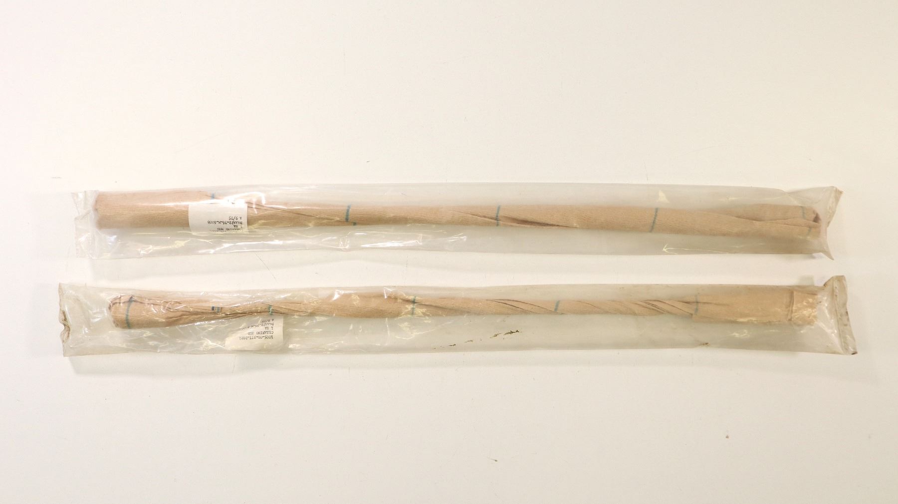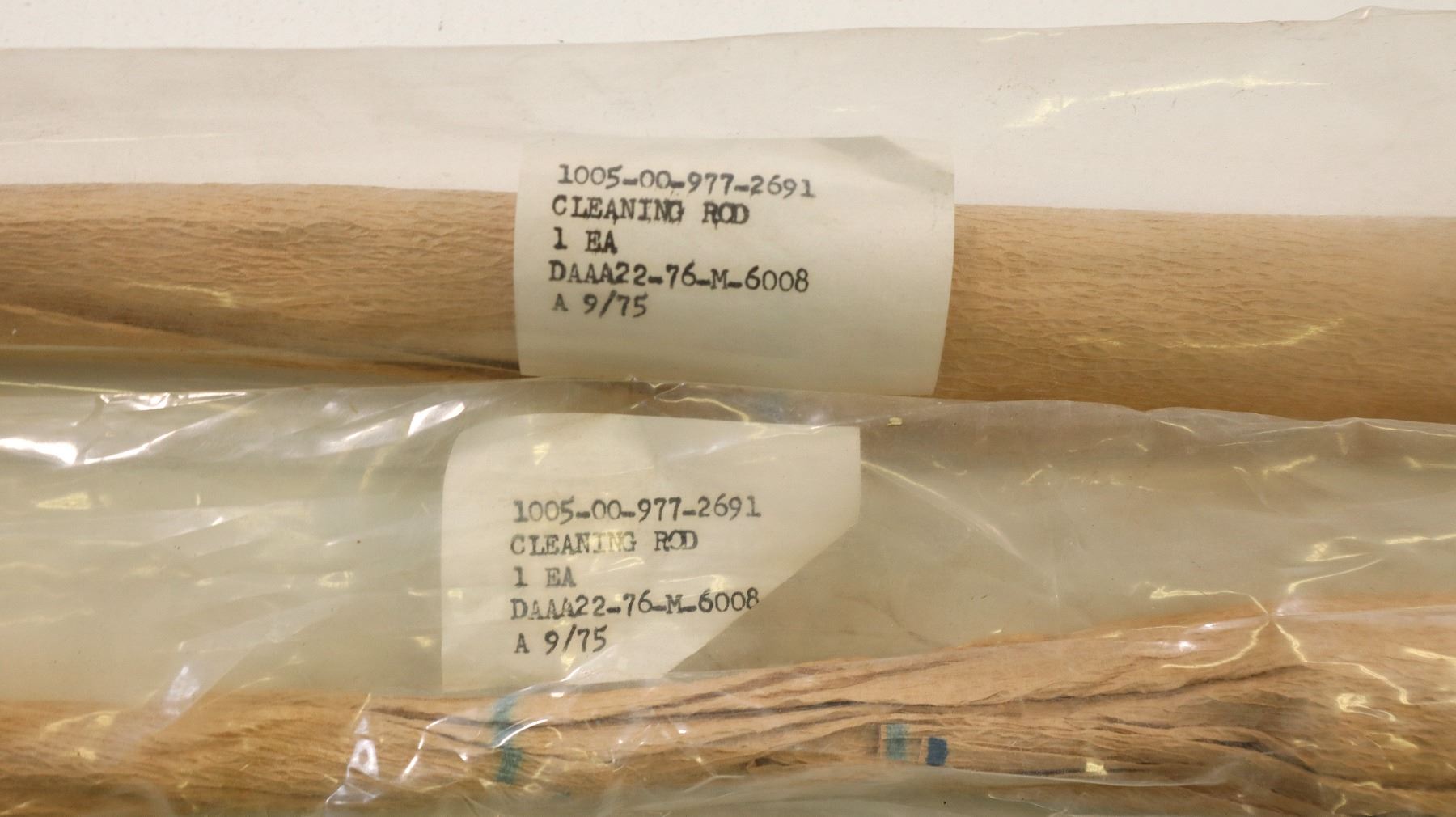 LOT INCLUDES; (2) CLEANING RODS, MARKED: "1005-00-977-2691, CLEANING ROD, 1 EA, DAAA22-76-M6008, A 9/75", THROUGH 30MM, OAL APPROX. 27.5", IN UN-OPENED PACKAGES. SEE PHOTOS.