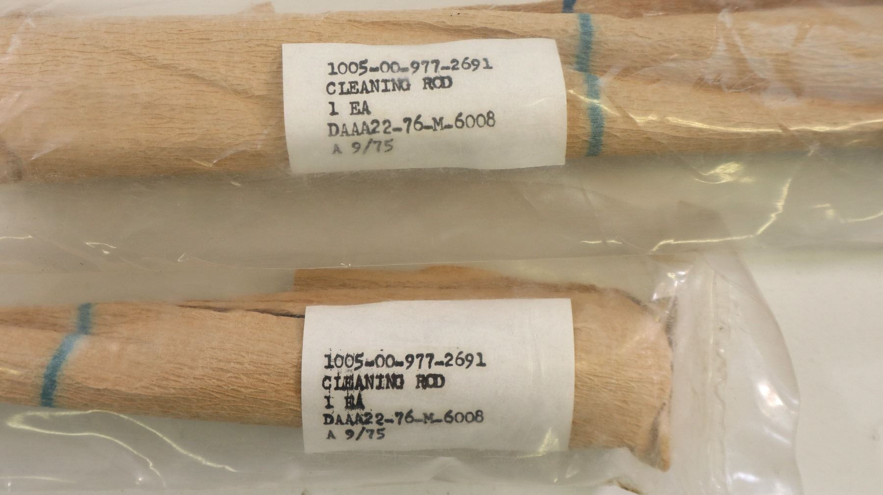 LOT INCLUDES; (2) CLEANING RODS, MARKED: "1005-00-977-2691, CLEANING ROD, 1 EA, DAAA22-76-M6008, A 9/75", THROUGH 30MM, OAL APPROX. 27.5", IN UN-OPENED PACKAGES. SEE PHOTOS.