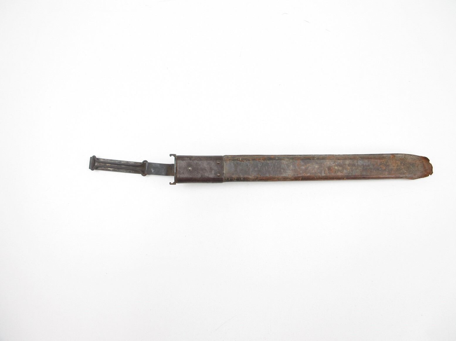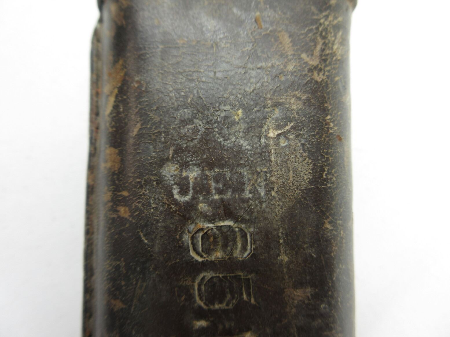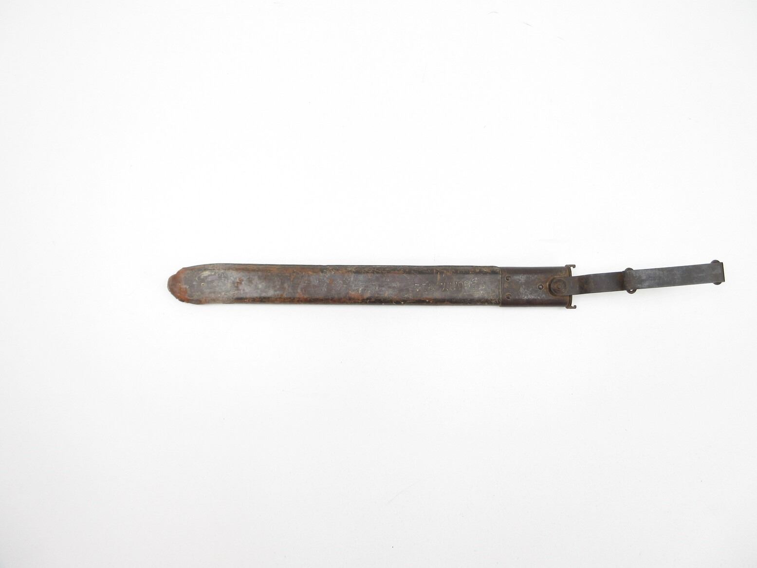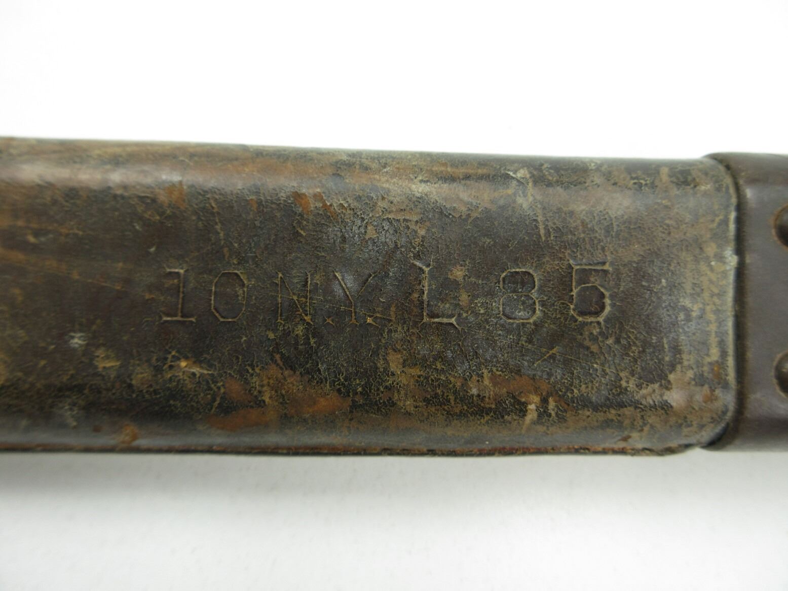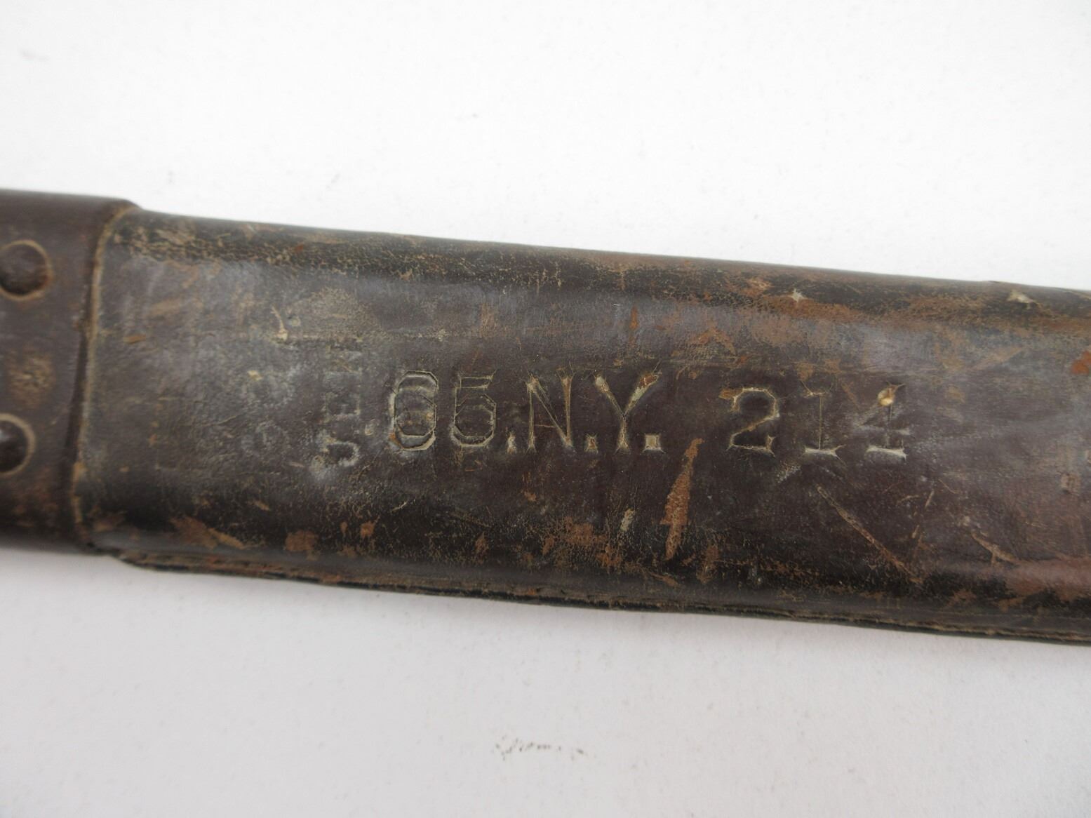 U.S. MILITARY SPRINGFIELD M1905 SCABBARD. (1) WOOD SCABBARD WITH LEATHER COVERING, NO BAYONET, LEATHER MARKED: "10 N.Y. L85", OTHER-SIDE MARKED: "??? JEN", "05.N.Y. 214", STEEL END WITH STEEL BELT LOOP & OAL APPROX. 17". SEE PHOTOS.