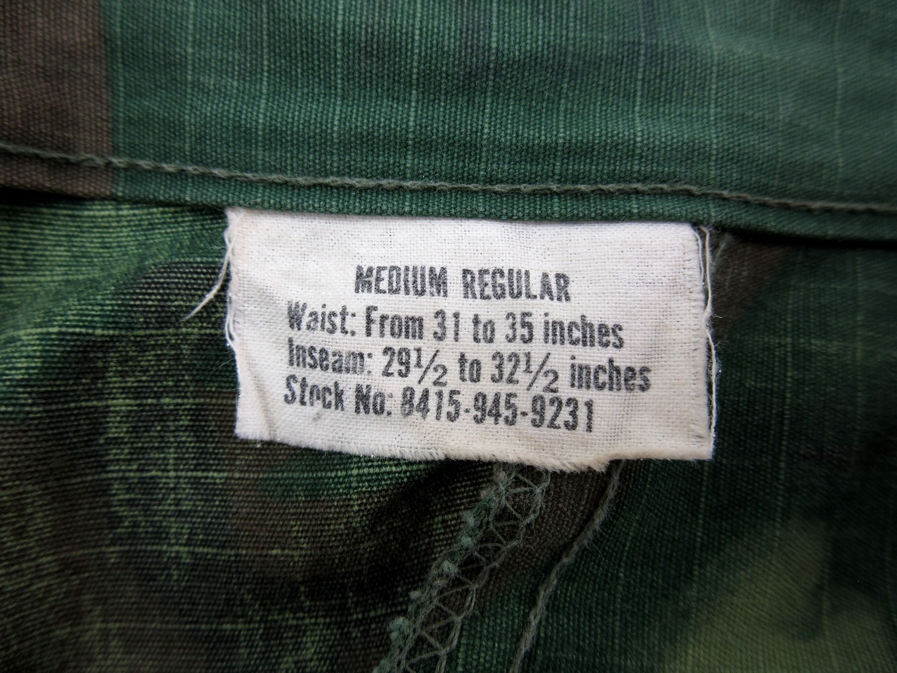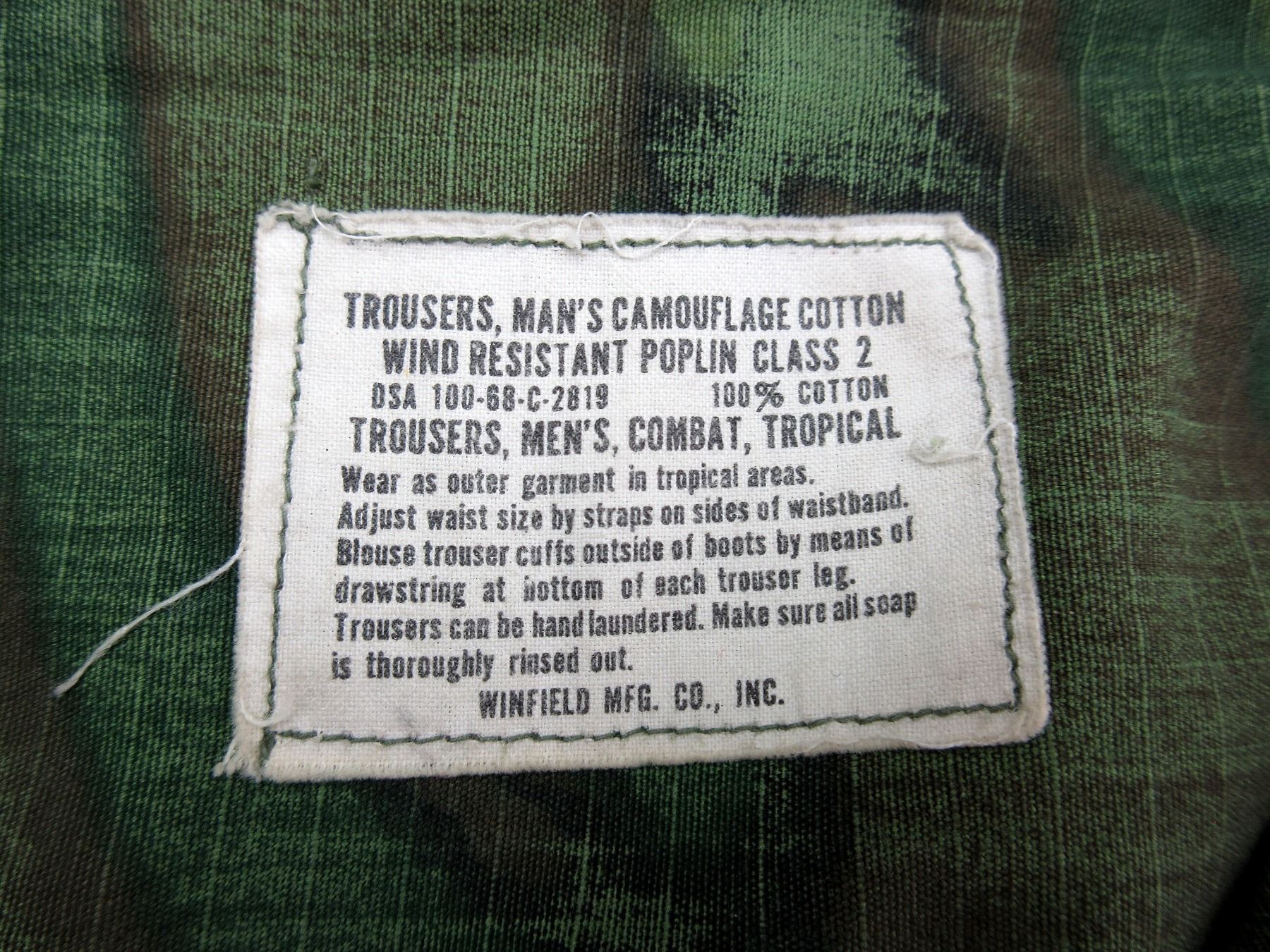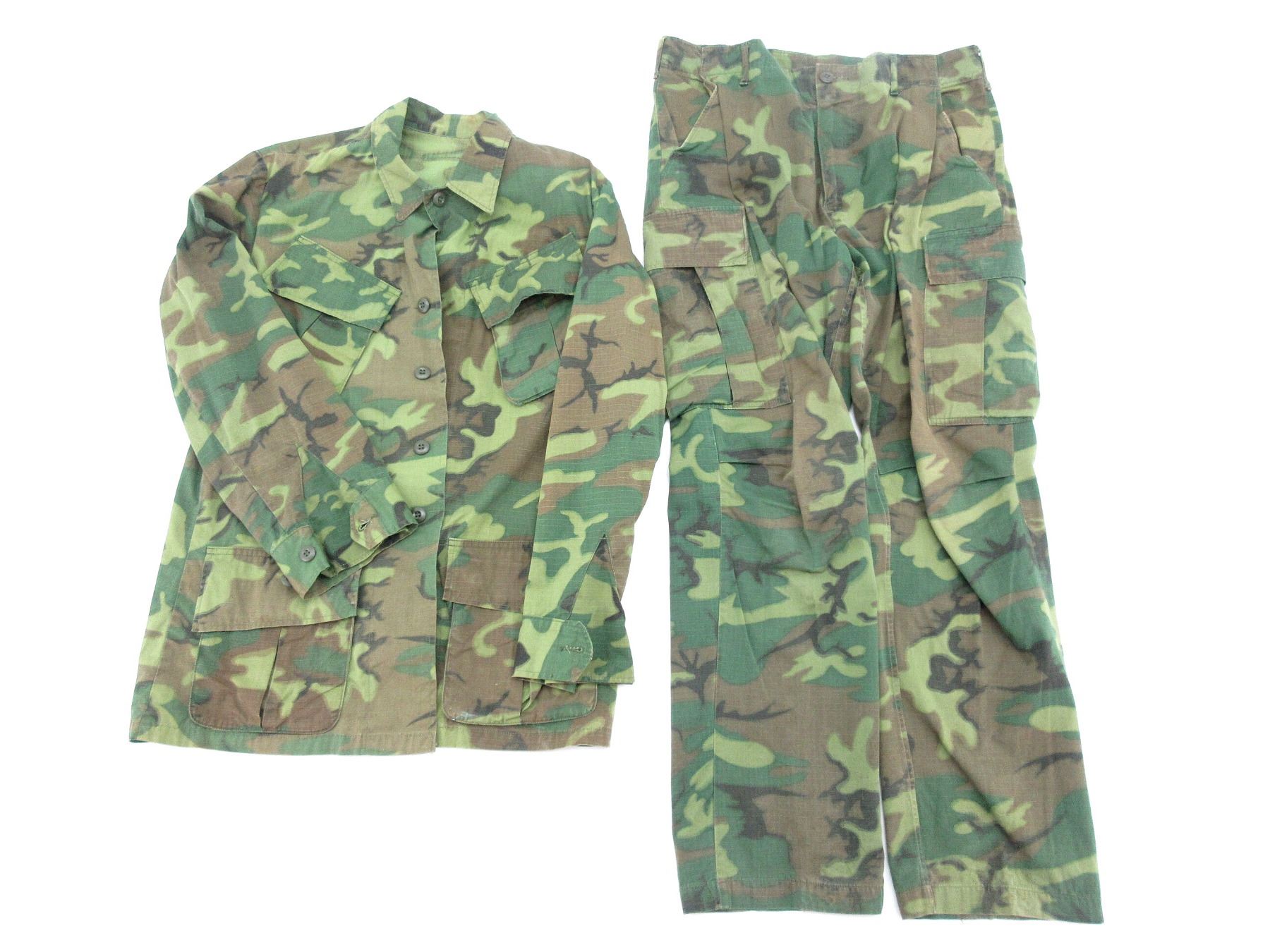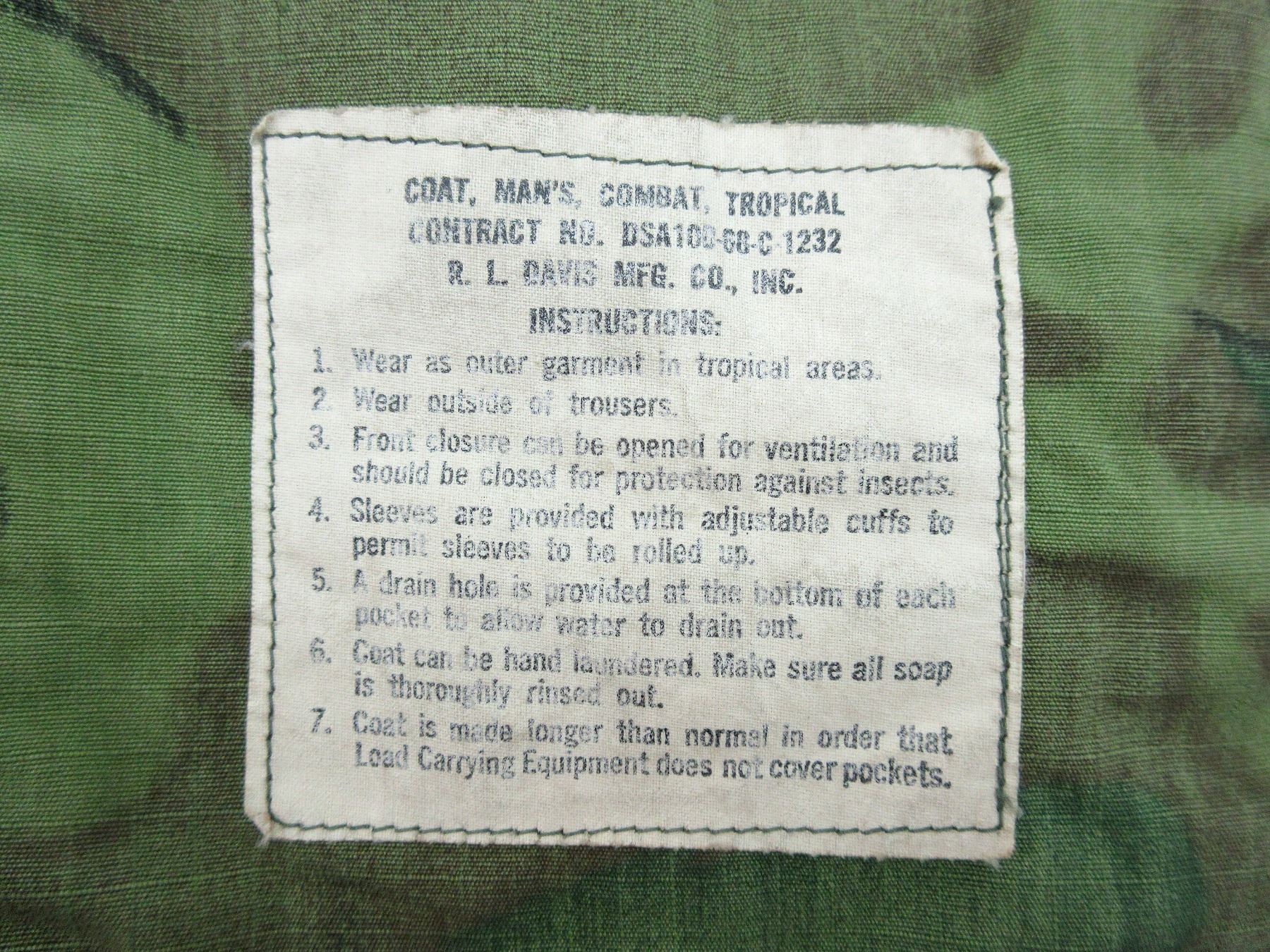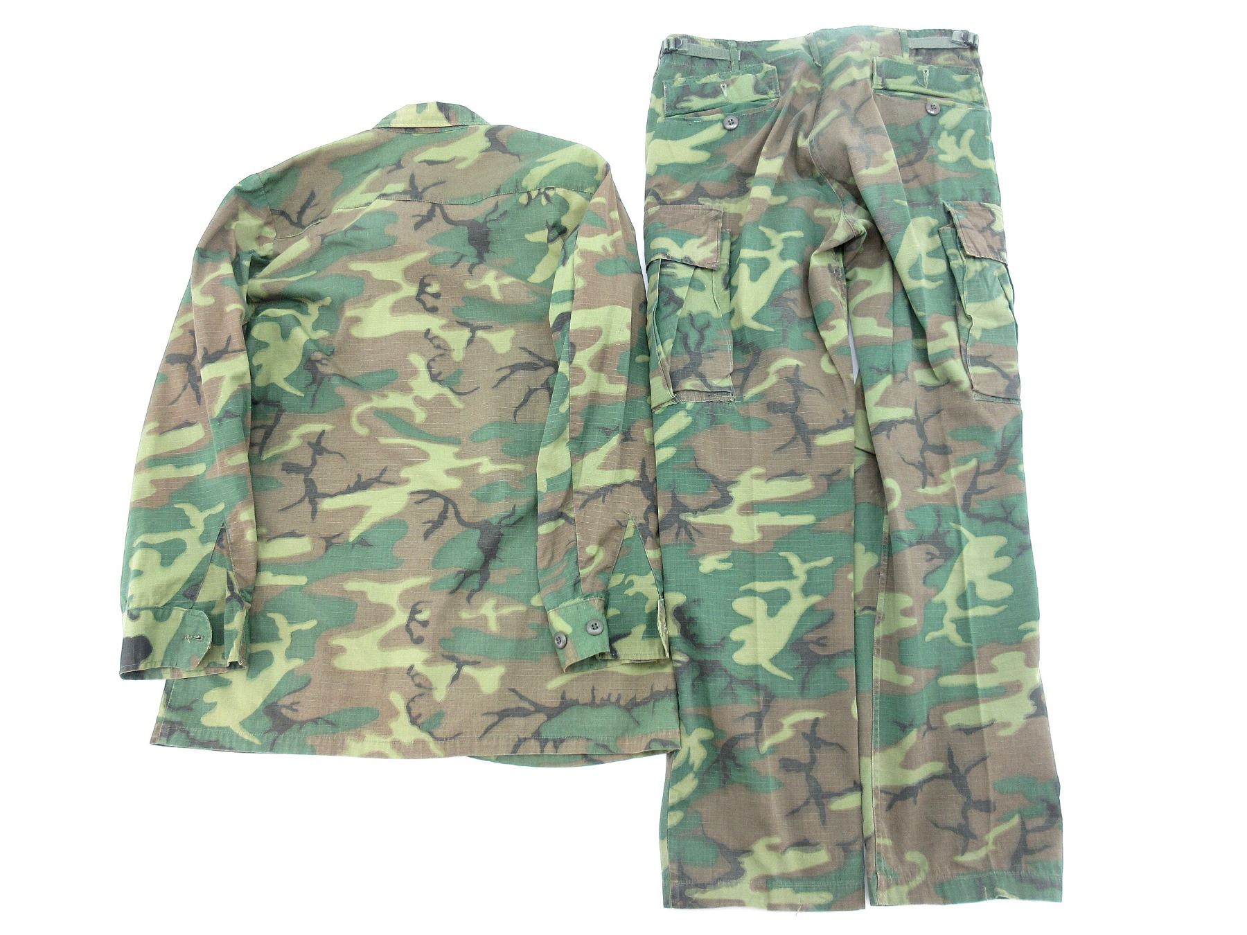 LOT INCLUDES; (1) CAMO COMBAT COAT, MARKED: "COAT, MAN'S, COMBAT, TROPICAL, CONTRACT NO. DSA100-68-C-1232, R.L. DAVIS MFG. CO., INC." ETC., BUTTON FLY-FRONT, SHOULDER WIDTH APPROX. 17" & (1) CAMO COMBAT TROUSERS, MARKED: "MEDIUM REGULAR, WAIST: FROM 31 TO 35 INCHES, INSEAM: 29 1/2 TO 31 1/2 INCHES" ETC. & "TROUSERS, MAN'S CAMOUFLAGE COTTON, WIND RESISTANT POPLIN CLASS 2, DSA 100-68-C-2819, 100% COTTON, TROUSERS, MEN'S, COMBAT, TROPICAL" ETC., ZIPPERED-FLY (WORKS). SEE PHOTOS.