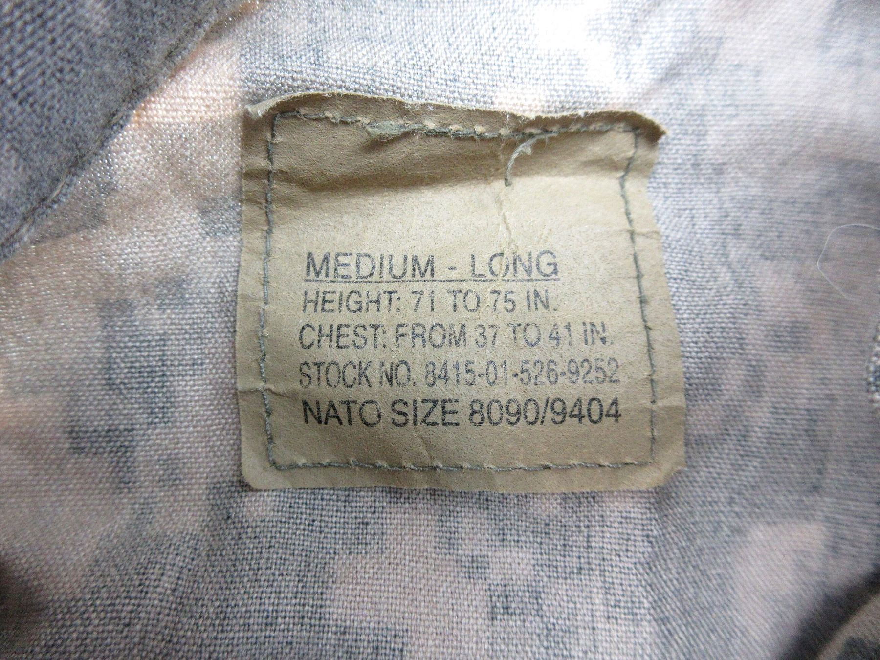 LOT INCLUDES; (4) UNIVERSAL CAMO PATTERN COMBAT COATS, SIZE M-LONG, VARIOUS LABELS & MARKINGS ON ALL, VELCRO / ZIPPERED-FRONTS (WORKS), SHOWS WEAR. SEE PHOTOS.