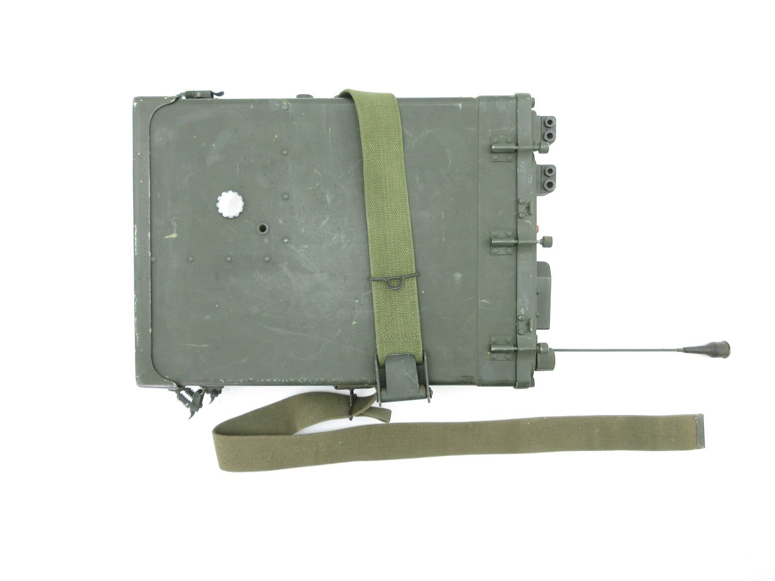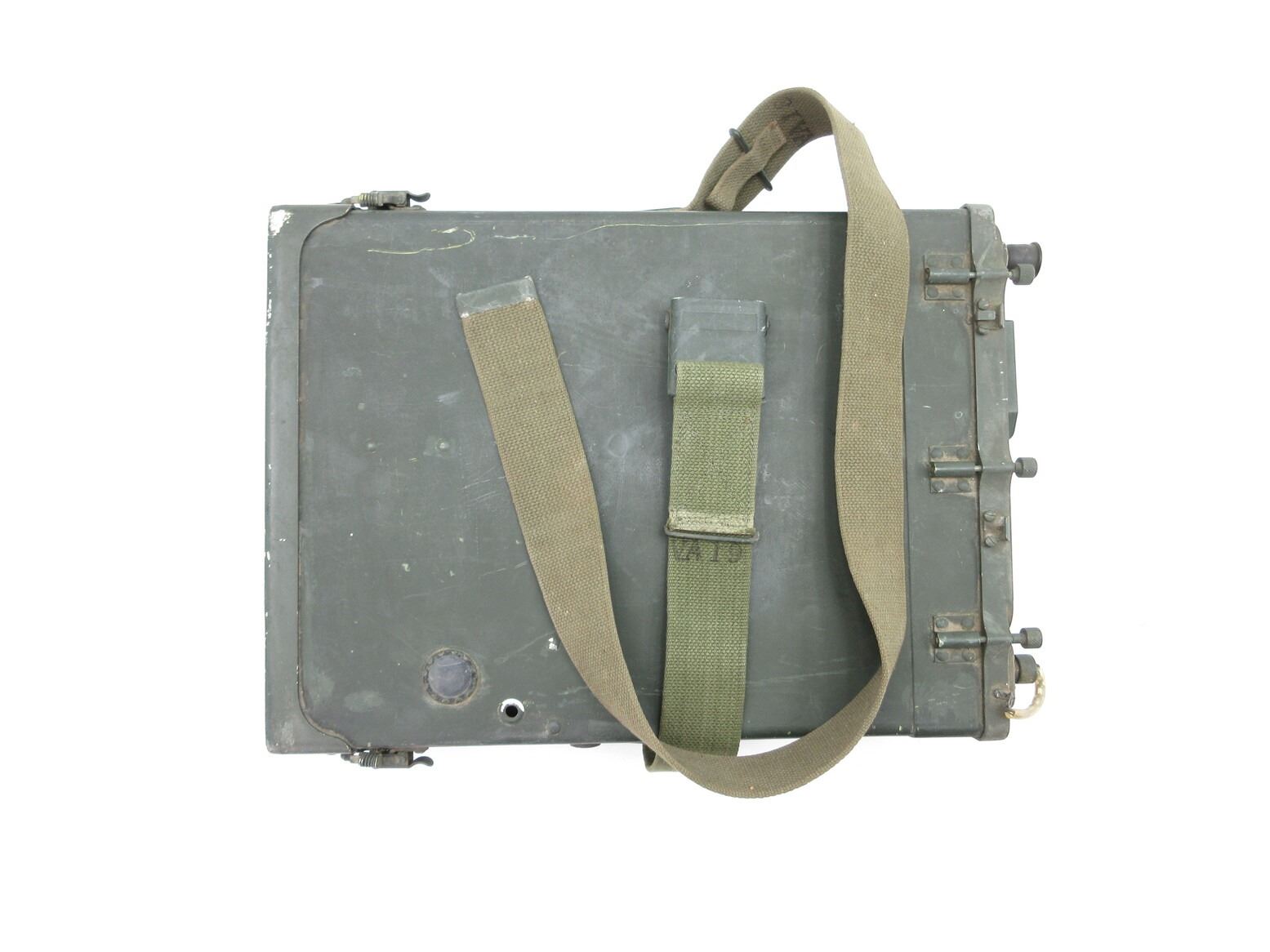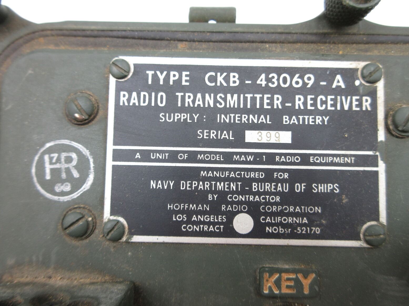 (1) MAW-1 TRANSMITTER-RECEIVER, MARKED: "TYPE CKB-43069-A, RADIO TRANSMITTER-RECEIVER, SERIAL 399" ETC., 10 CHANNELS, MISSING TOP CAP, BOTTOM OPENS UP, NO CABLES, CANVAS CARRY / SHOULDER STRAP, UN-TESTED & APPROX. 13" X 5.5" X 20". SEE PHOTOS.
