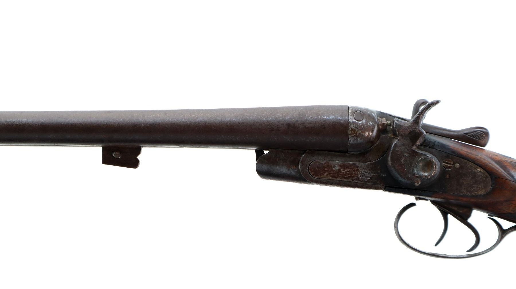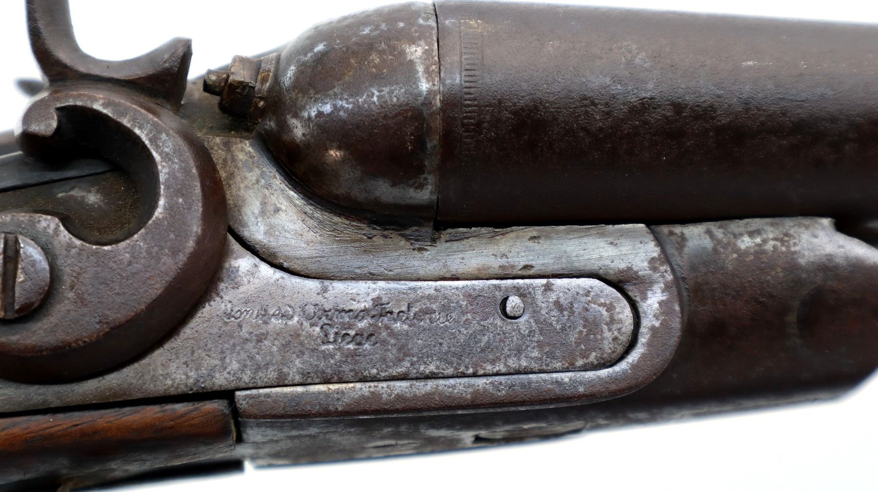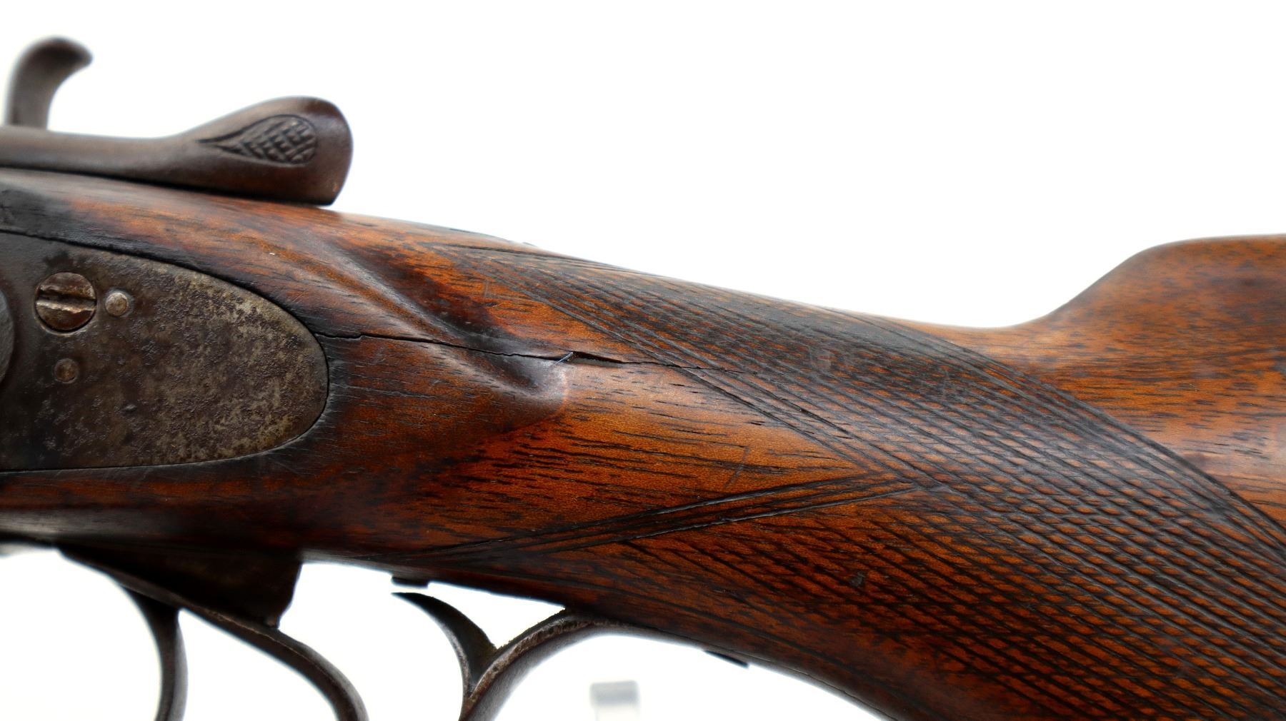 Main Description: Brass bead, Damascus barrels with smooth rib that are loose on face, side locks with spur hammers right side functions left side does not hold cock, hammer is a welded on replacement, extractor, double triggers. Missing complete forearm assembly. Has a one piece wood stock, checkered pistol grip which is chipped, cracked and damaged behind receiver and locks, missing butt plate and screws, stock chipped at toe.