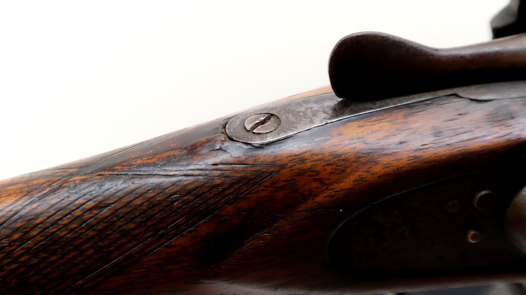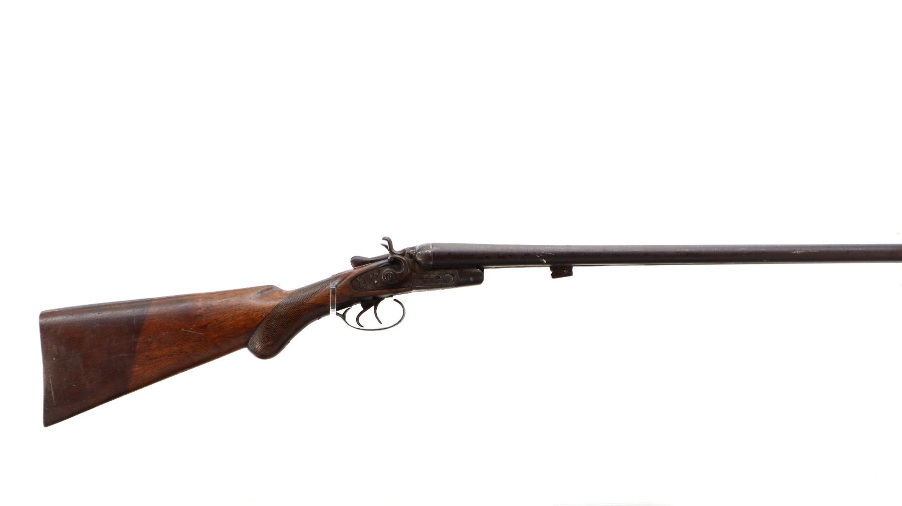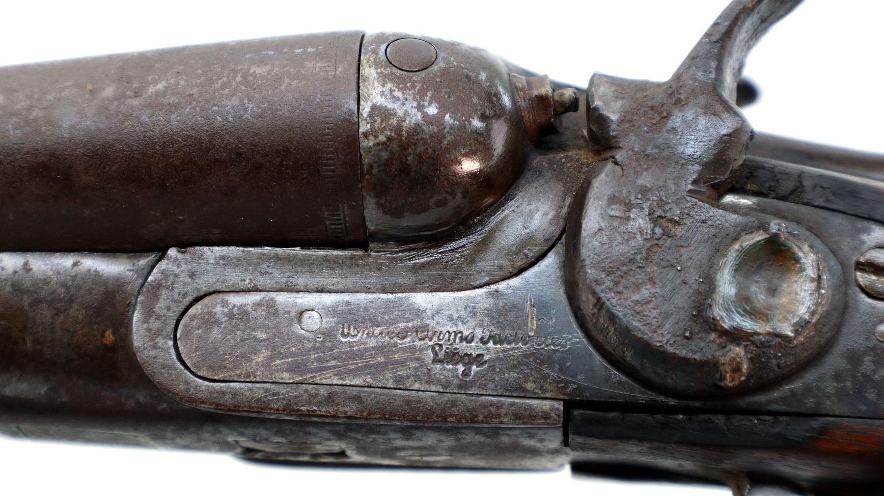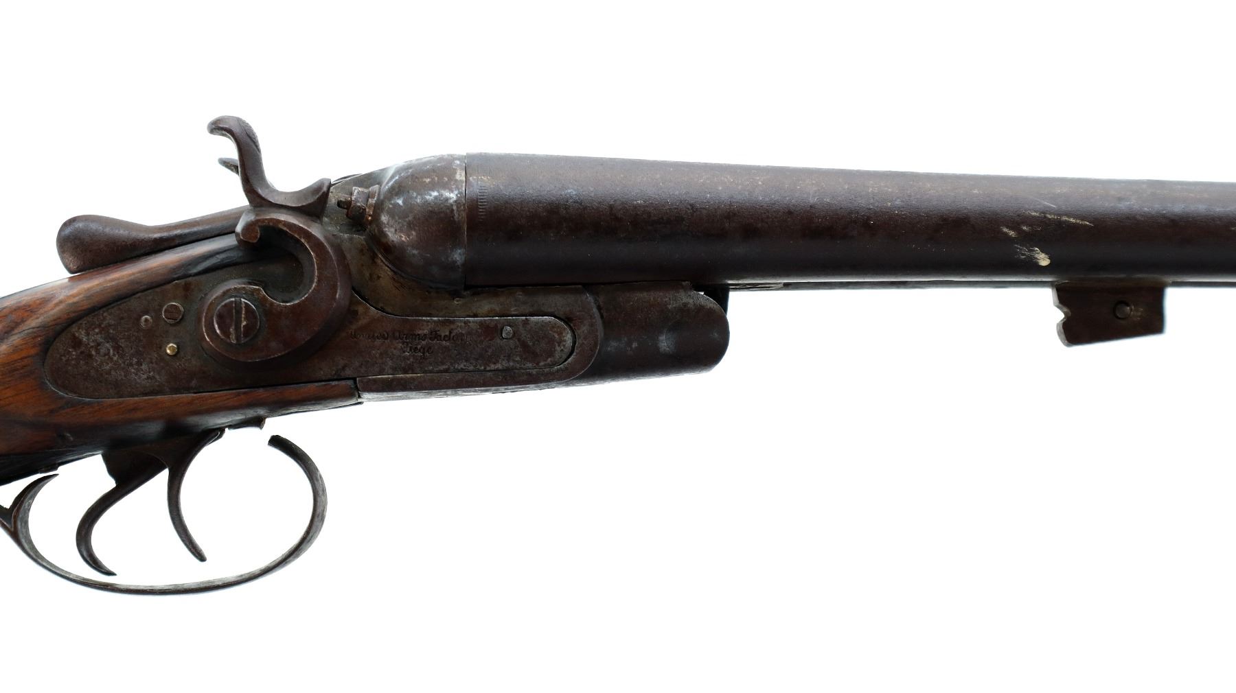 Main Description: Brass bead, Damascus barrels with smooth rib that are loose on face, side locks with spur hammers right side functions left side does not hold cock, hammer is a welded on replacement, extractor, double triggers. Missing complete forearm assembly. Has a one piece wood stock, checkered pistol grip which is chipped, cracked and damaged behind receiver and locks, missing butt plate and screws, stock chipped at toe.