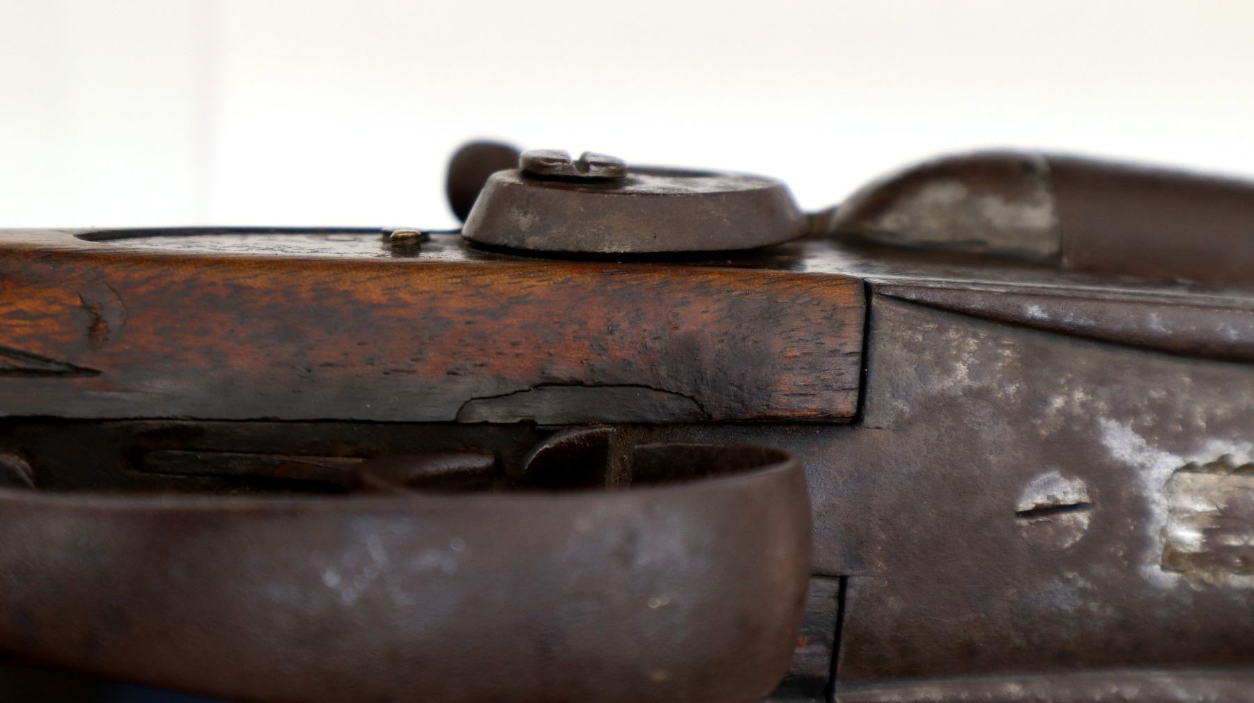 Wear: Metal finish turning brown with pitting, rust overall, scratches, handling marks and wear. Stock shows marks, scratches and wear.