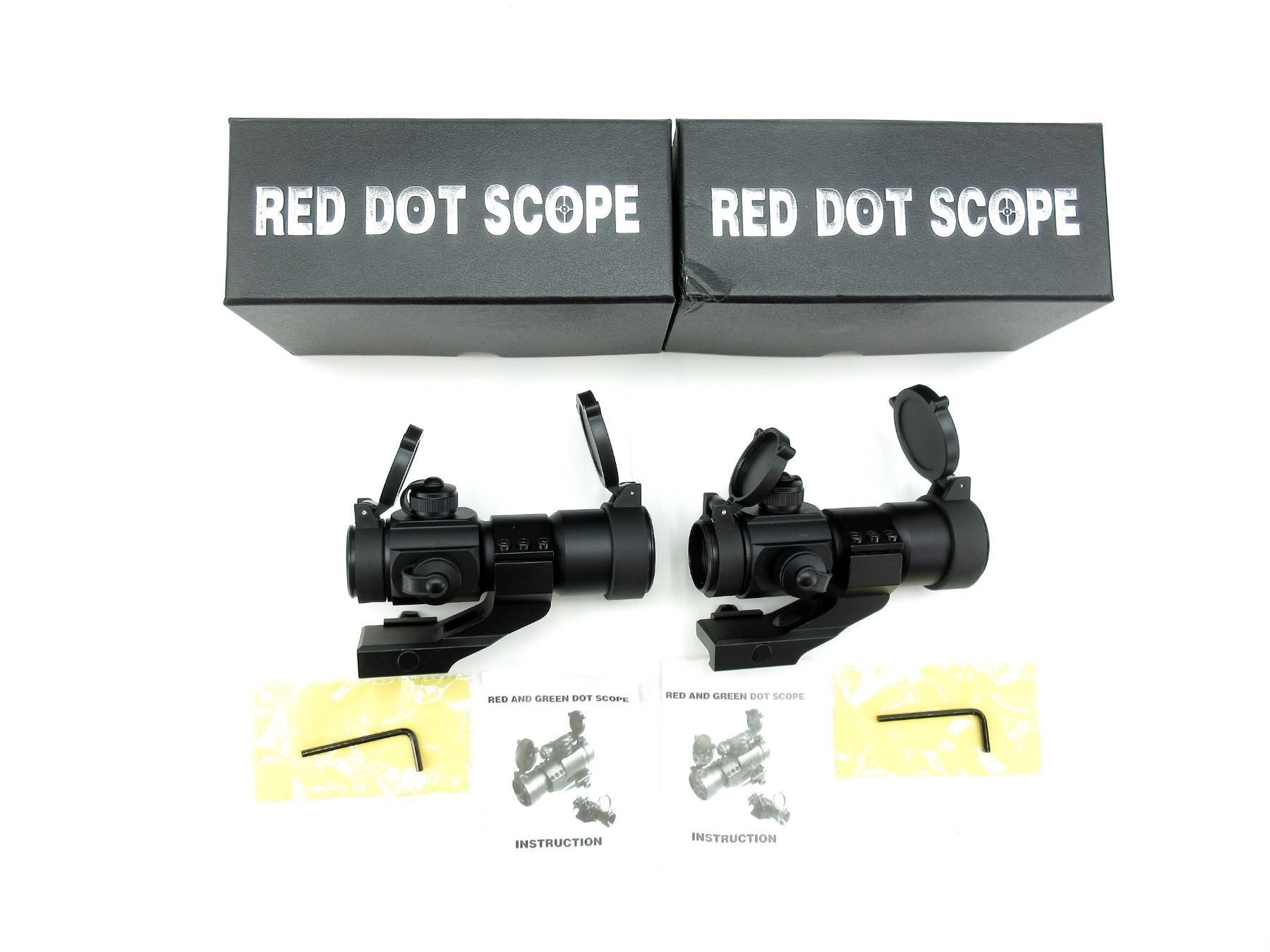 LOT INCLUDES; (1) RED / GREEN DOT SIGHT, CLEAR OPTICS, WORKING RED / GREEN DOT RETICLE, WITH VARIOUS BRIGHTNESS SETTINGS, 40MM TUBE DIAMETER, WINDAGE & ELEVATION KNOBS TURN, WITH MOUNTING BASE, FLIP UP LENS COVERS & INSTRUCTION MANUAL, INCLUDES ORIGINAL BOX, (1) RED / GREEN DOT SIGHT, CLEAR OPTICS, RED / GREEN DOT RETICLE, WITH VARIOUS BRIGHTNESS SETTINGS, 40MM TUBE DIAMETER, WINDAGE & ELEVATION KNOBS TURN, BATTERY CAP DOES NOT COME OFF, UNTESTED, WITH MOUNTING BASE, FLIP UP LENS COVERS & INSTRUCTION MANUAL, INCLUDES ORIGINAL BOX. SEE PHOTOS.