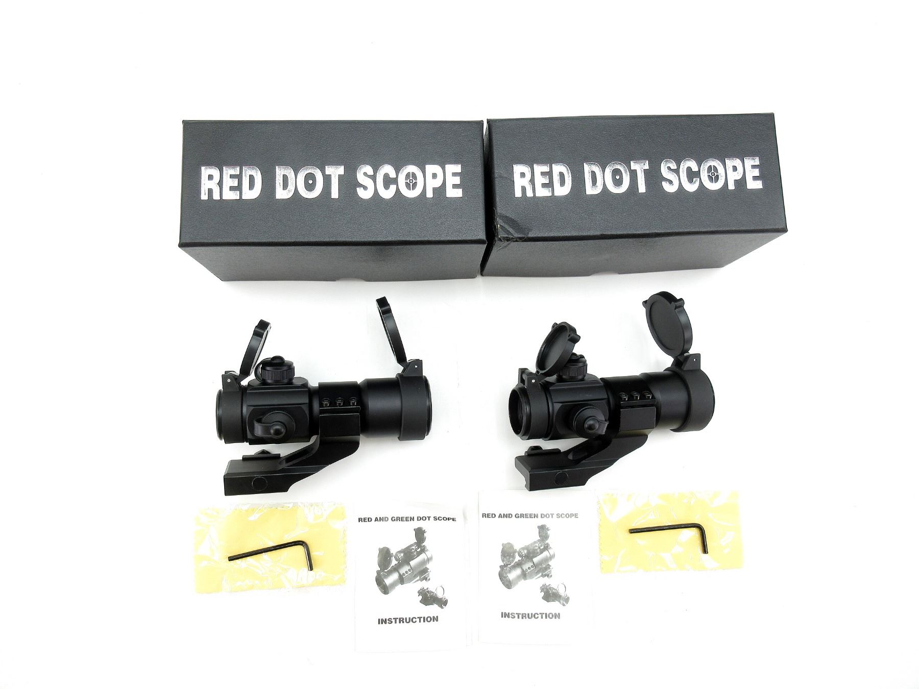LOT INCLUDES; (1) RED / GREEN DOT SIGHT, CLEAR OPTICS, WORKING RED / GREEN DOT RETICLE, WITH VARIOUS BRIGHTNESS SETTINGS, 40MM TUBE DIAMETER, WINDAGE & ELEVATION KNOBS TURN, WITH MOUNTING BASE, FLIP UP LENS COVERS & INSTRUCTION MANUAL, INCLUDES ORIGINAL BOX, (1) RED / GREEN DOT SIGHT, CLEAR OPTICS, RED / GREEN DOT RETICLE, WITH VARIOUS BRIGHTNESS SETTINGS, 40MM TUBE DIAMETER, WINDAGE & ELEVATION KNOBS TURN, BATTERY CAP DOES NOT COME OFF, UNTESTED, WITH MOUNTING BASE, FLIP UP LENS COVERS & INSTRUCTION MANUAL, INCLUDES ORIGINAL BOX. SEE PHOTOS.