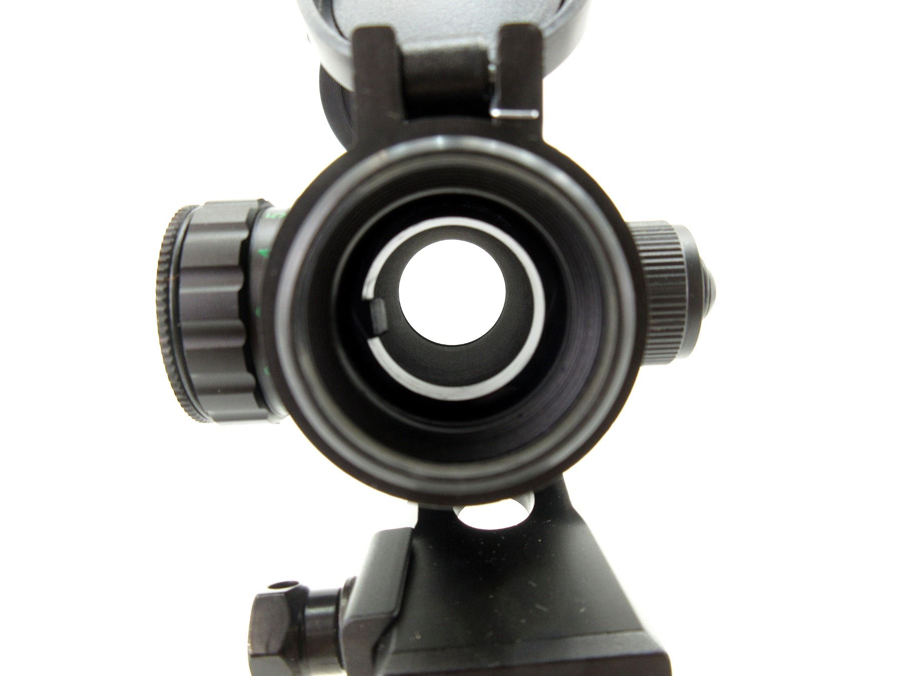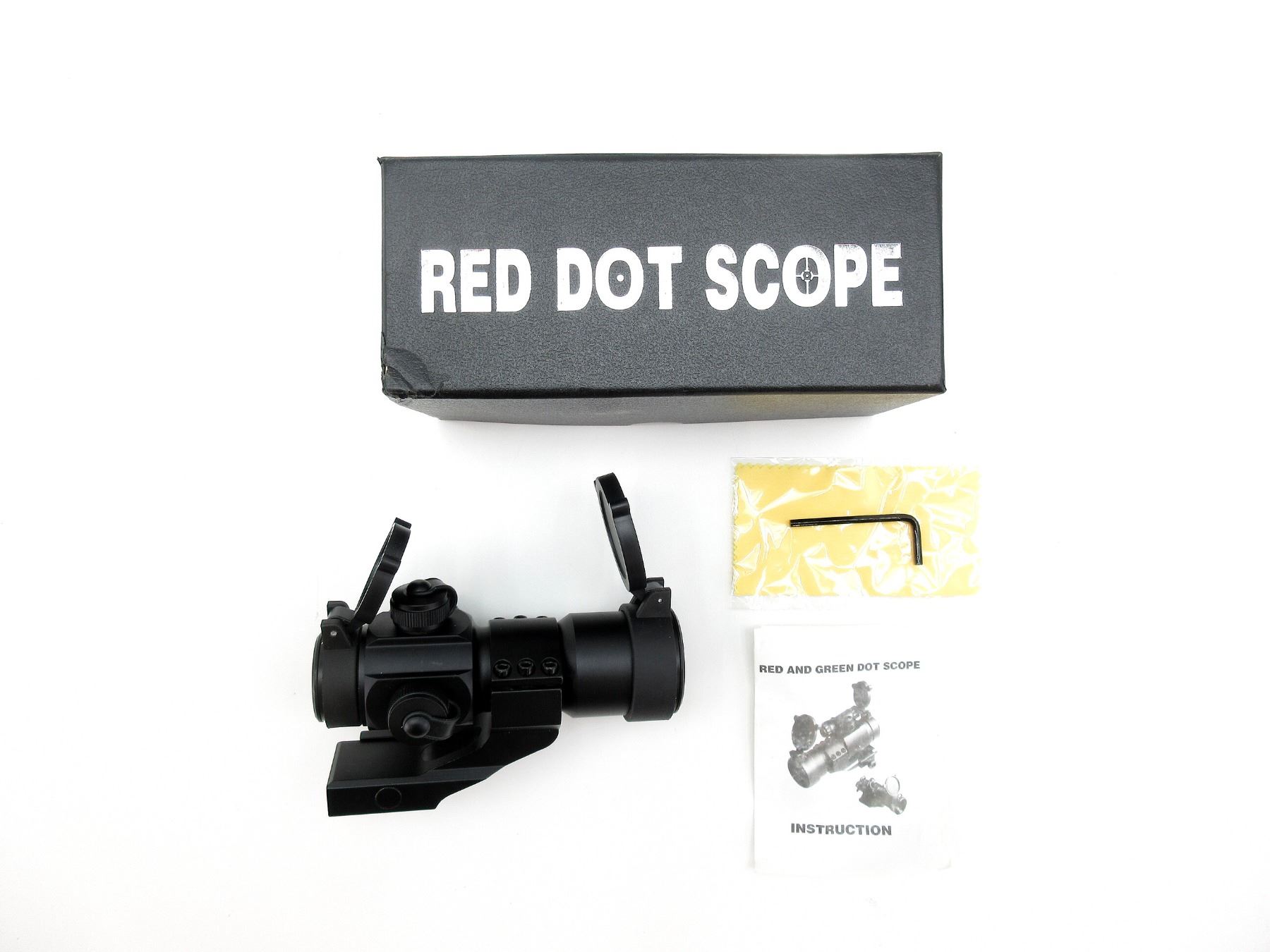 (1) CLEAR OPTICS, WORKING RED / GREEN DOT RETICLE, WITH VARIOUS BRIGHTNESS SETTINGS, 40MM TUBE DIAMETER, WINDAGE & ELEVATION KNOBS TURN, WITH MOUNTING BASE, FLIP UP LENS COVERS & INSTRUCTION MANUAL, INCLUDES ORIGINAL BOX. SEE PHOTOS.