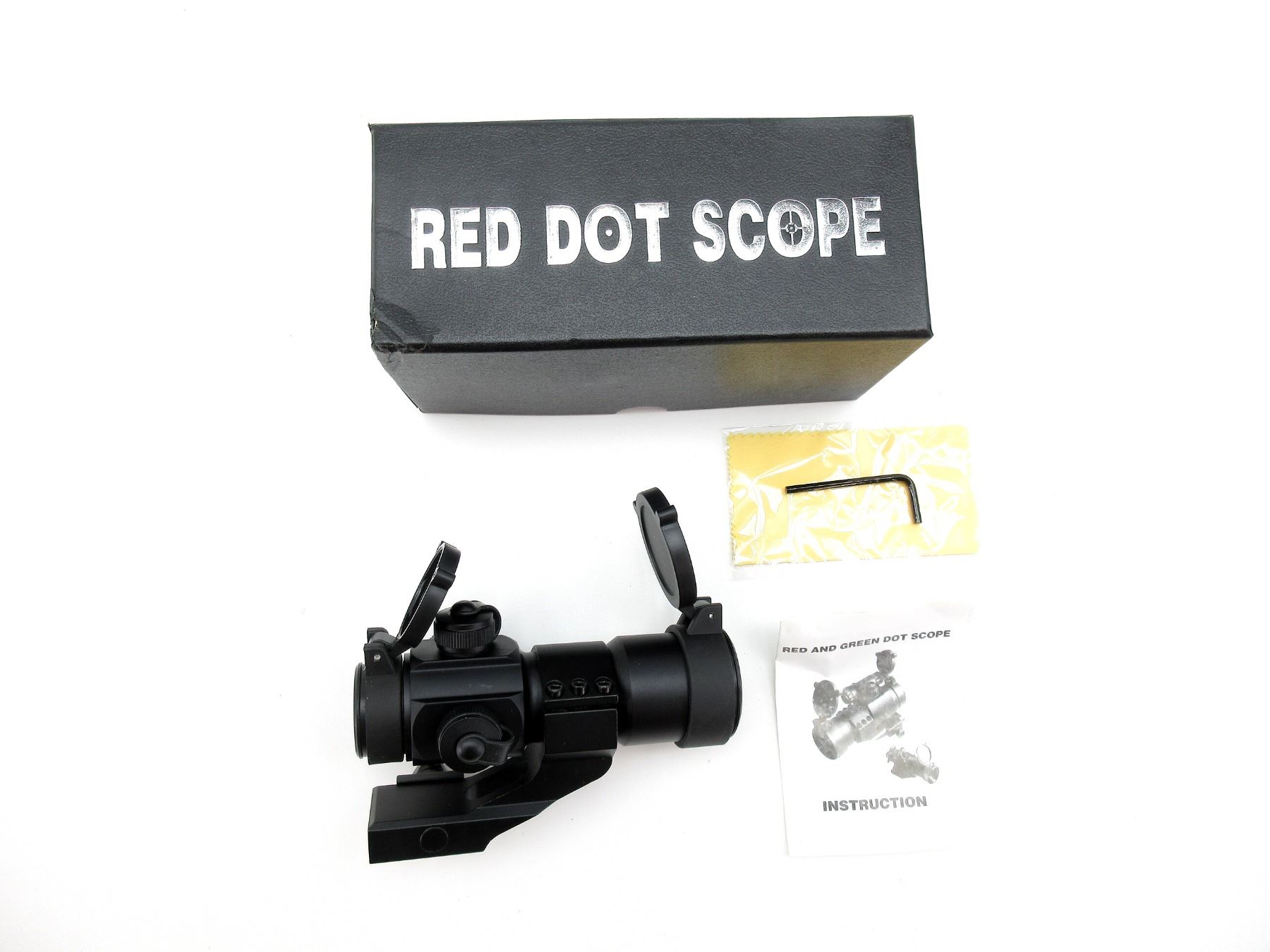 (1) CLEAR OPTICS, WORKING RED / GREEN DOT RETICLE, WITH VARIOUS BRIGHTNESS SETTINGS, 40MM TUBE DIAMETER, WINDAGE & ELEVATION KNOBS TURN, WITH MOUNTING BASE, FLIP UP LENS COVERS & INSTRUCTION MANUAL, INCLUDES ORIGINAL BOX. SEE PHOTOS.