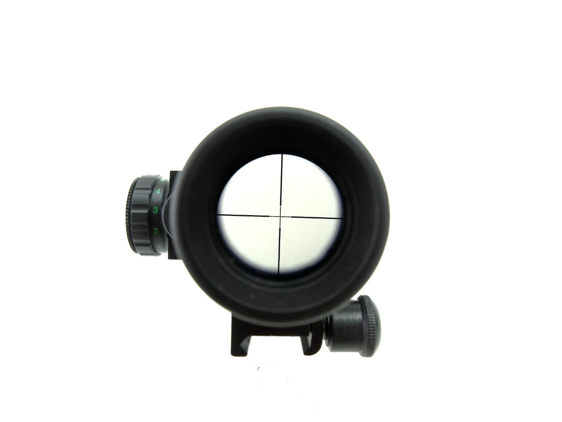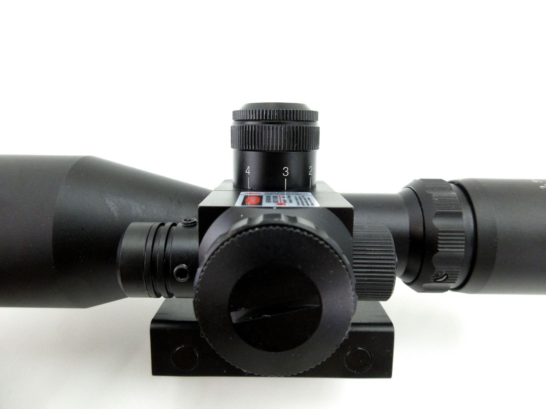 (1) CLEAR OPTICS, MIL-DOT RETICLE, WORKING RED / GREEN ILLUMINATION, WITH VARIOUS BRIGHTNESS SETTINGS, WORKING MAGNIFICATION RING, WINDAGE & ELEVATION KNOBS TURN, WORKING RED LASER, BUILT IN SUNSHADE, BIKINI STYLE LENS COVERS & MOUNTING RAIL, INCLUDES ORIGINAL BOX & INSTRUCTION MANUAL. SEE PHOTOS.