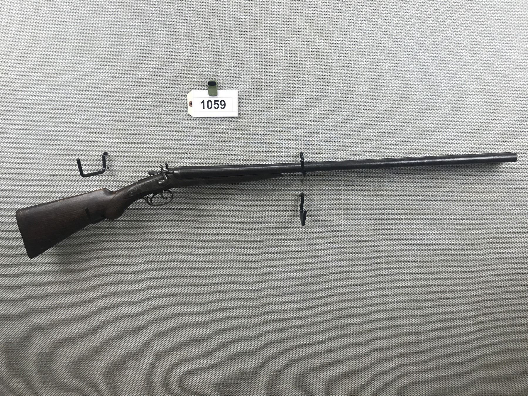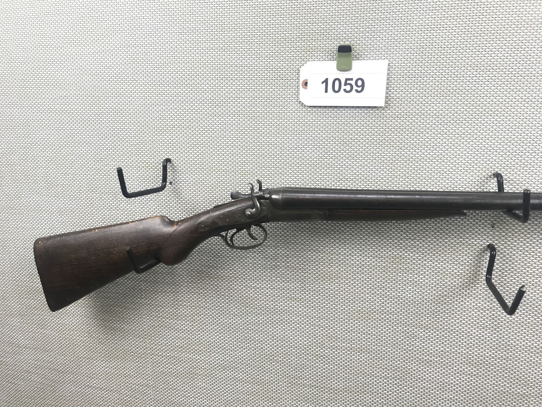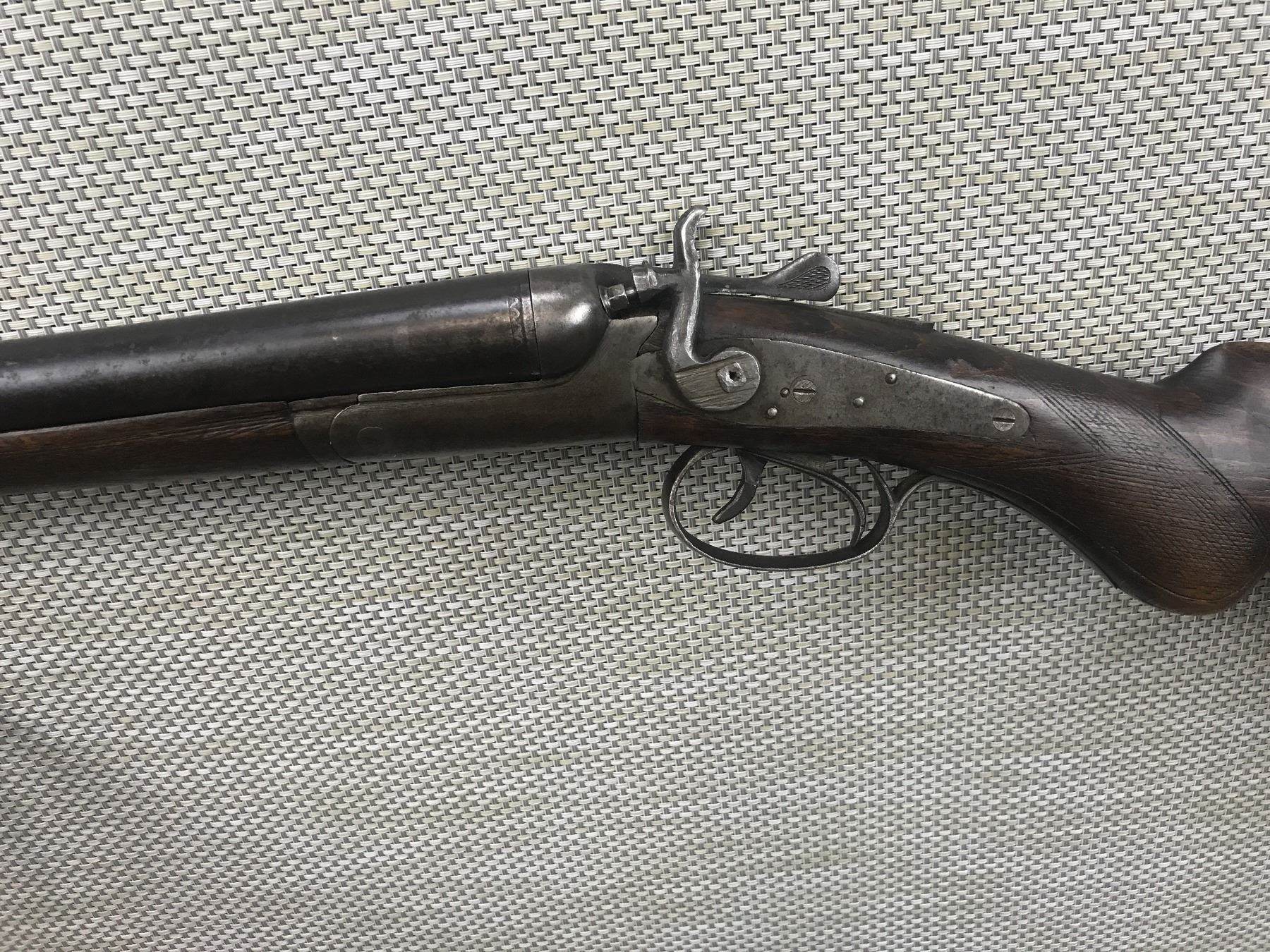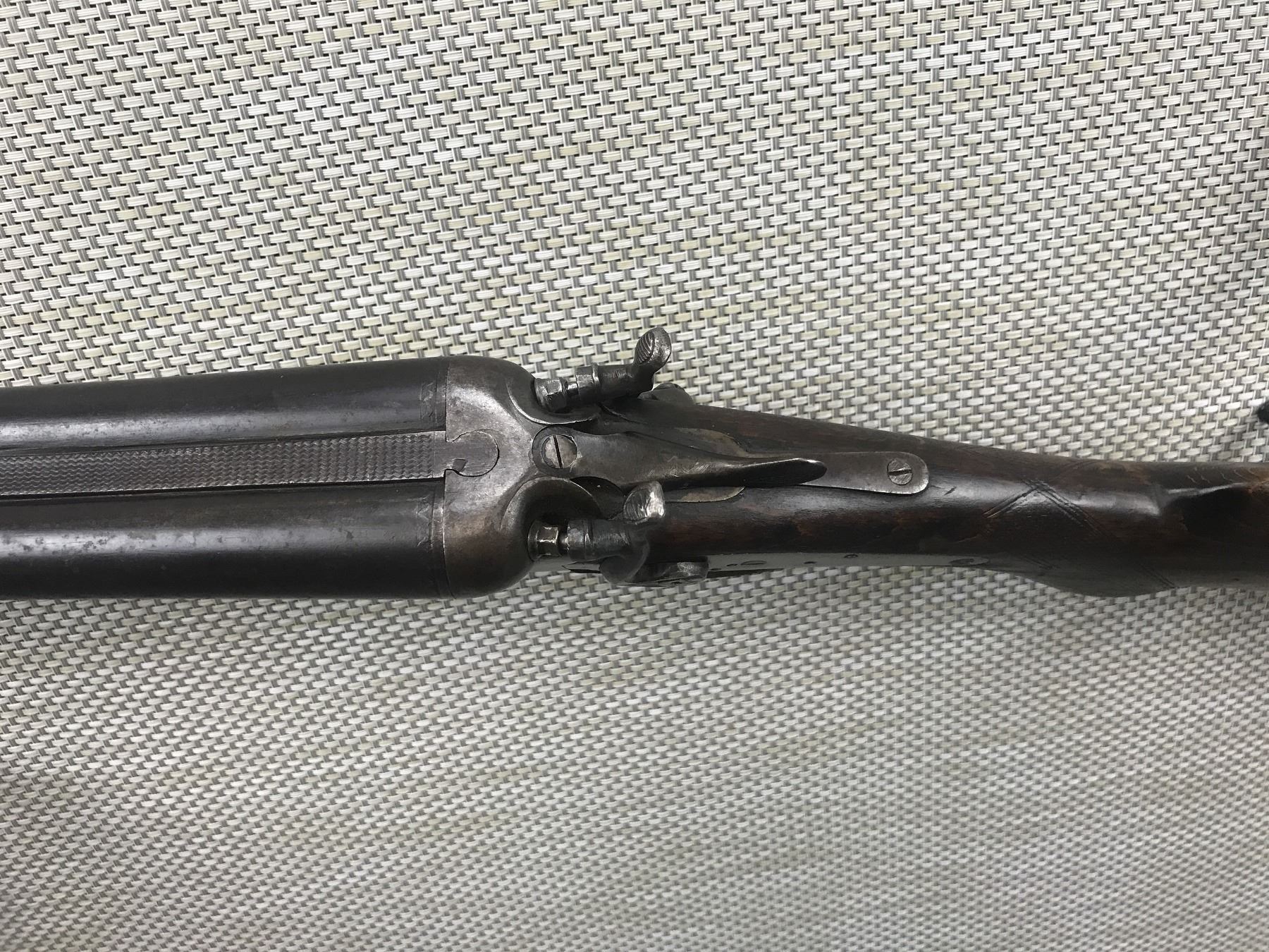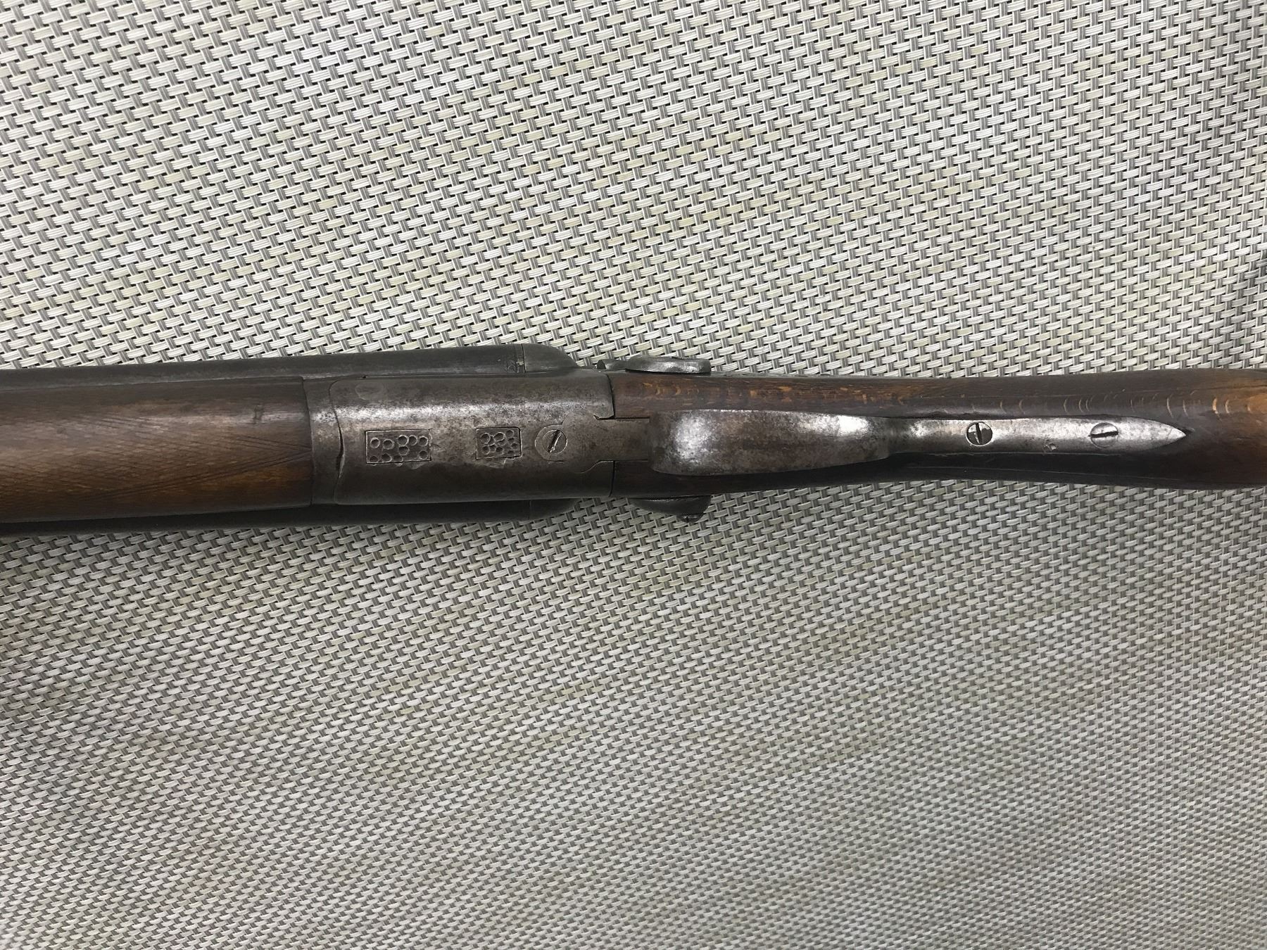 UNKNOWN BELGIAN , MODEL: SIDE BY SIDE DOUBLE HAMMERS DOUBLE TRIGGERS SHOTGUN , CALIBER: 12GA X 2 3/4" , GOOD BORES, REPLACED TRIGGER, FIXED FULL CHOKES, CHECKERED FOREND AND SEMI PISTOL GRIP BUTT STOCK WITH STEEL BUTT PLATE, SHOWS SOME HANDLING MARKS, MISSING LEFT HAMMER SCREW , BARREL LENGTH: 29 1/2" , SERIAL # N/A , STOCK # 8428 , CONDITION: 4/10 , CLASS: CANADIAN NON RESTRICTED CLASS
