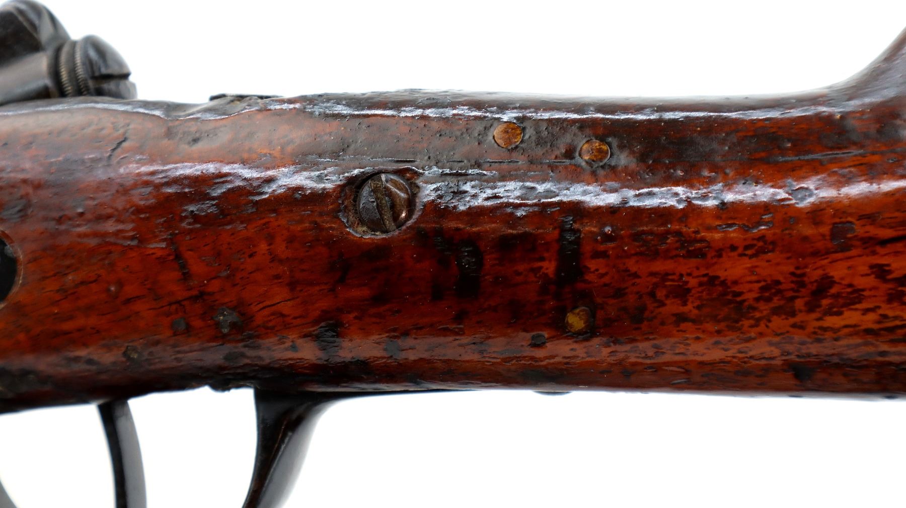 Main Description: Brass bead, round barrel, hex receiver, flat bolt handle, action does not stay cocked. One piece wood stock, forend tip is chipped and cracked, straight grip chipped cracked and repaired with a bolt, smooth steel butt plate, single barrel band.