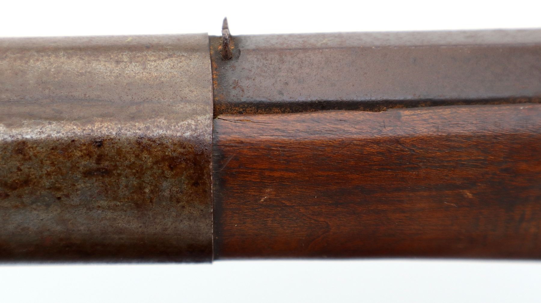 Main Description: Missing bead hole is present, 1/3rd octagon 2/3rd round barrel, muzzle is uneven, smooth lock and spur hammer that functions, lock is loose in the stock wrapped with tape. One piece half length wood stock, wrapped with metal bands, straight grip, chipped and broken cracked behind receiver, sheet steel butt plate attached with nails, replaced trigger guard, no ramrod.