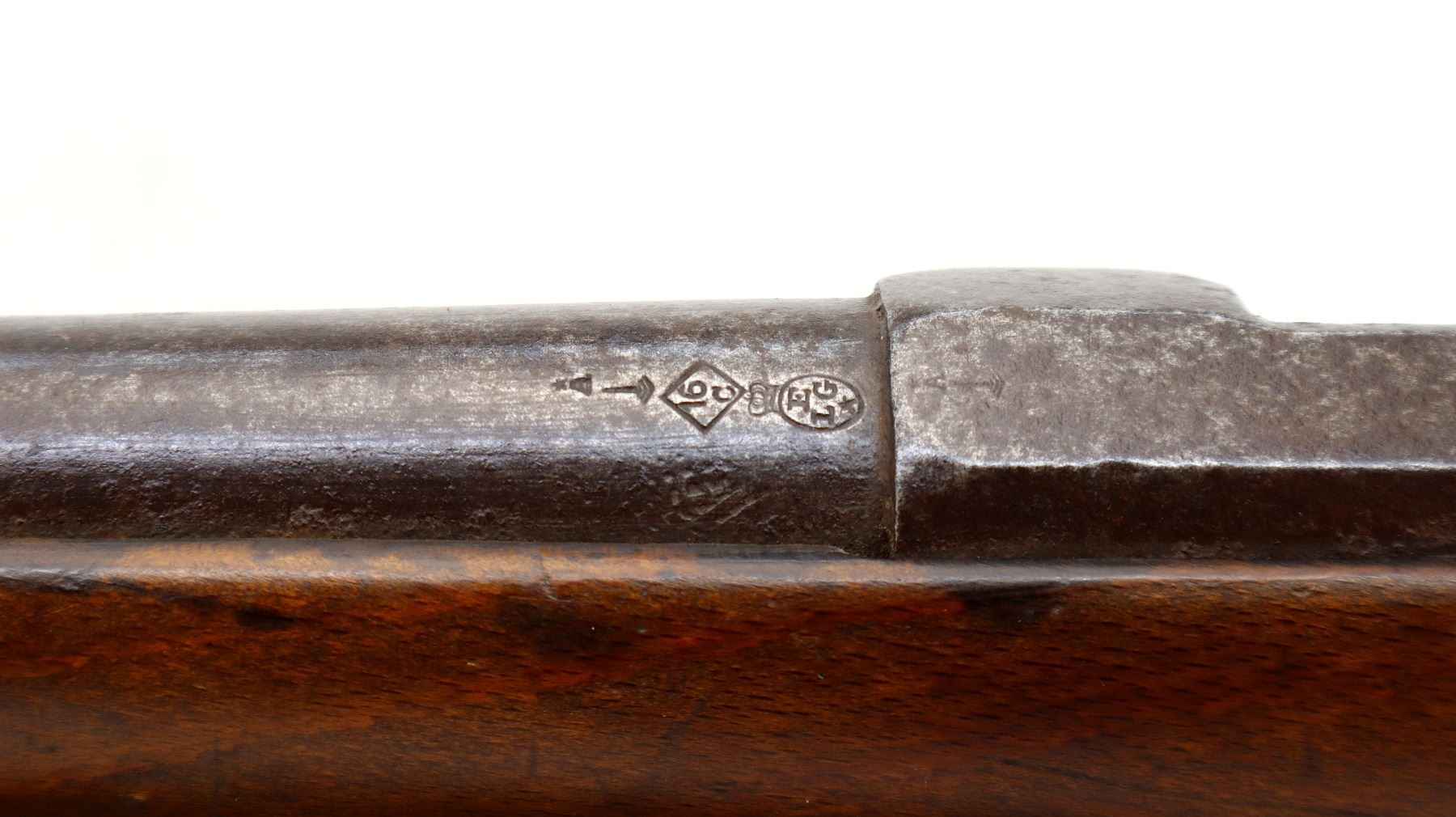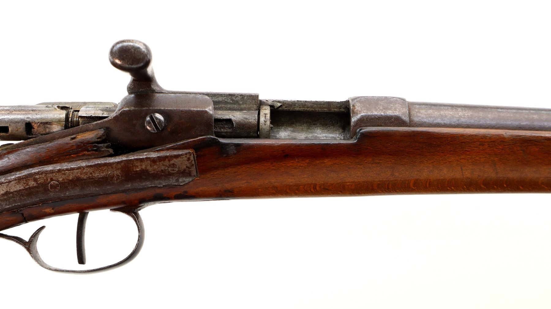Main Description: Missing bead, hole is present, round barrel, hex receiver, flat bolt knob, extractor is loose, cocking piece is broken, bolt does not function requires adjustment parts and repair. One piece wood stock, single forearm wedge, forearm is chipped and cracked, straight grip, chipped, cracked and broken repaired with steel plates. Missing butt plate and screws, stock chipped at heel.