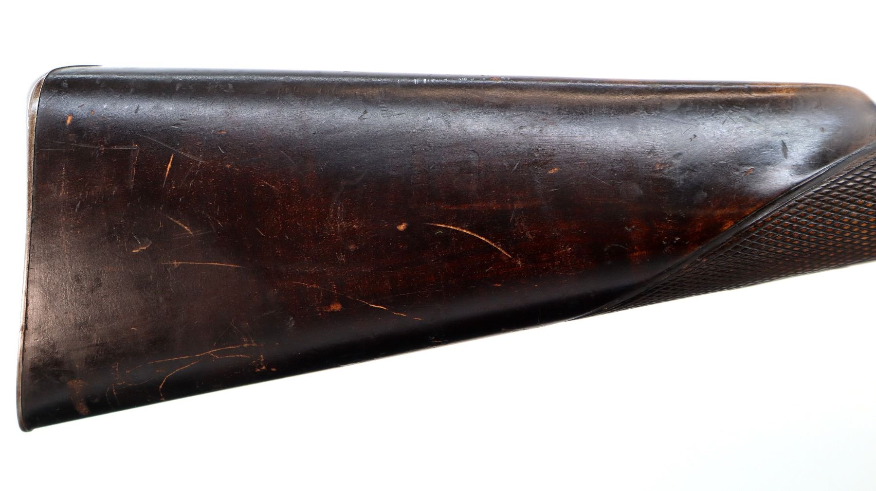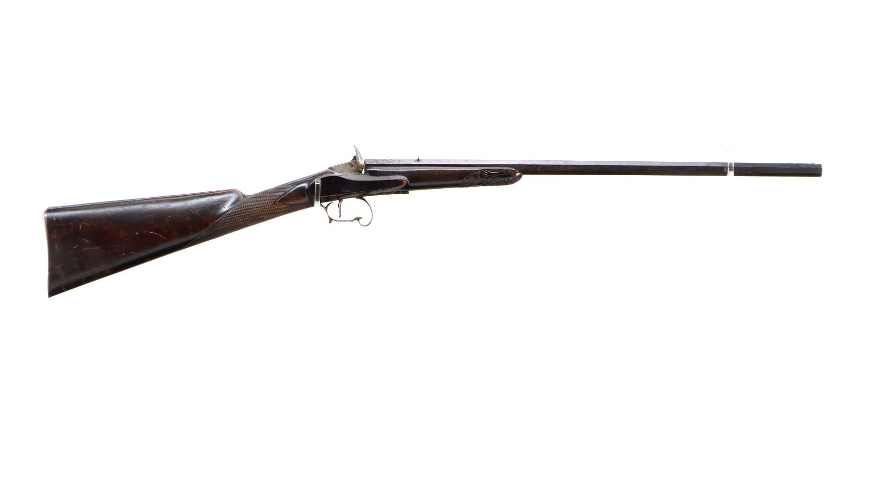 Main Description: Broken front sight, fixed u notched rear sight, blued octagon barrel with light engraving, smooth spur hammer. One piece wood stock, forend tip is carved, checkered straight grip, smooth steel butt plate.