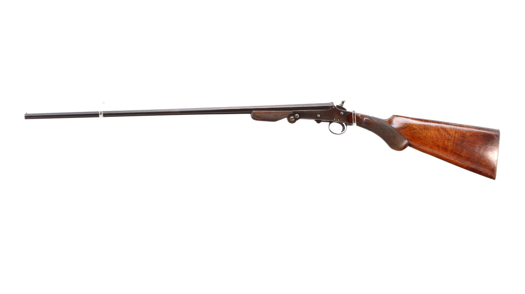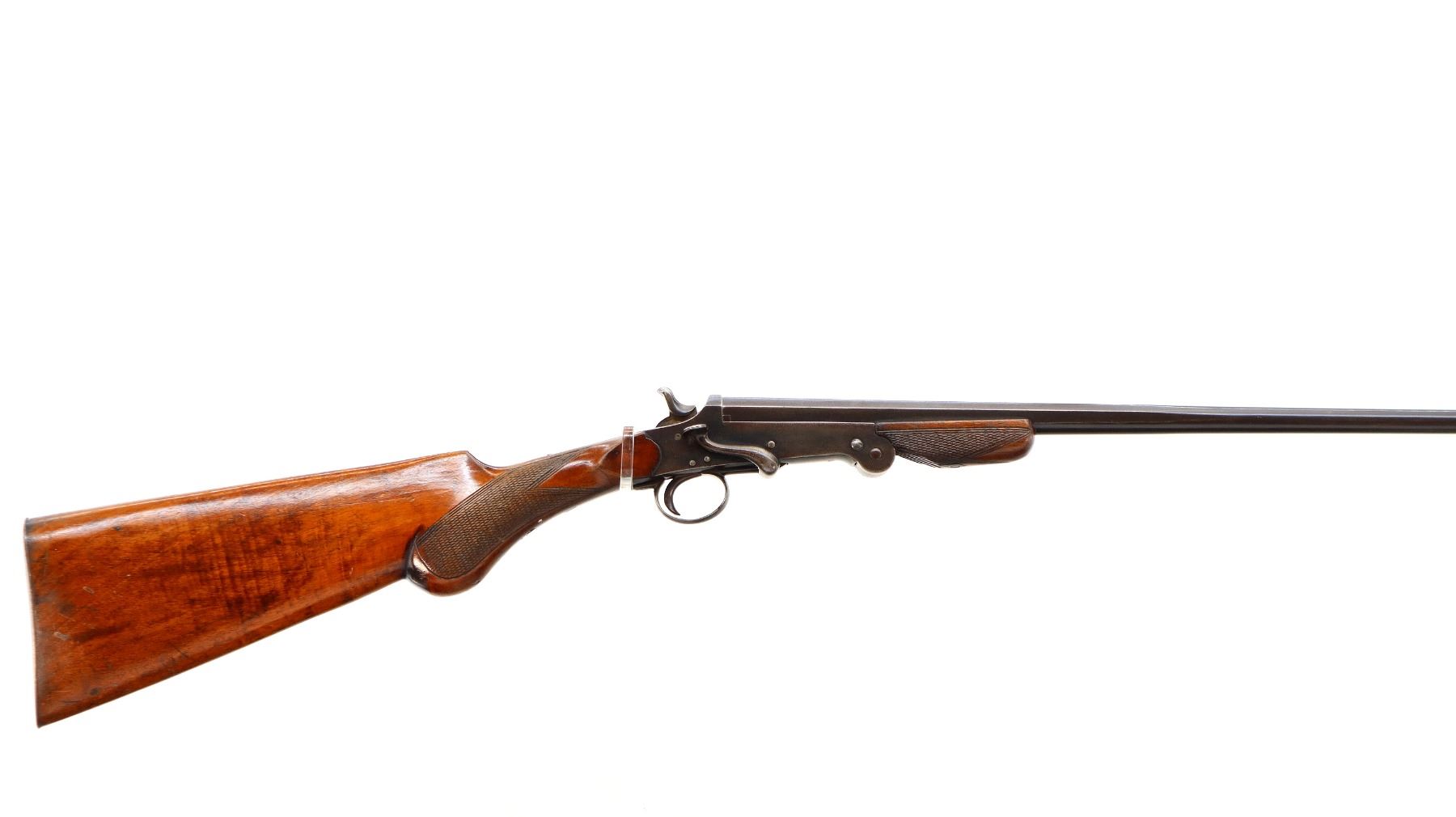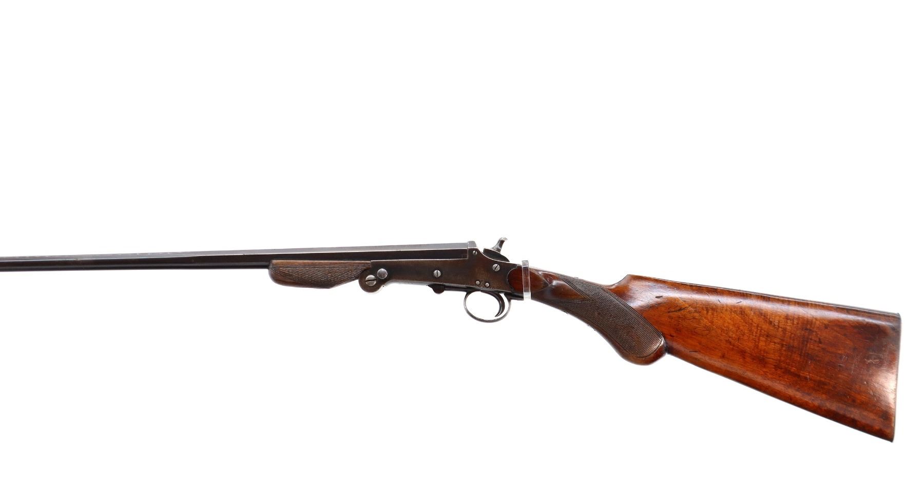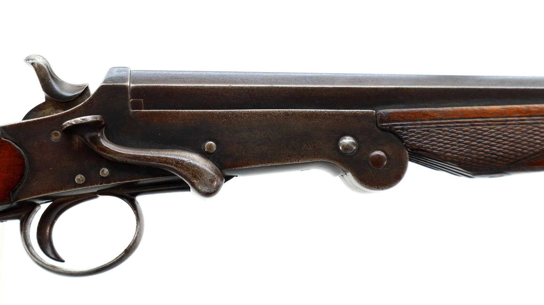 Main Description: Brass bead, blued finish, 1/3rd octagon 2/3rd round barrel which is loose on face, grooved spur hammer and opening lever, extractor. Two piece wood stocks, checkered forearm and pistol grip, smooth steel butt plate.