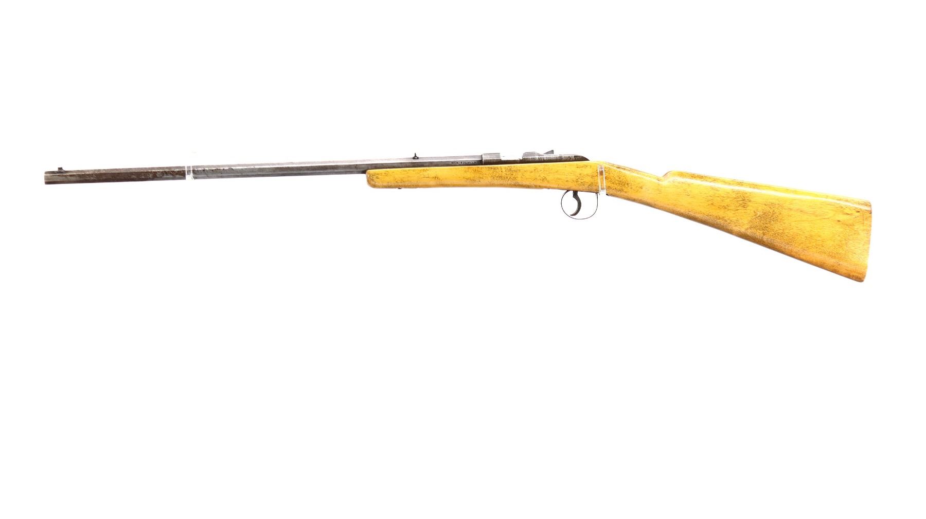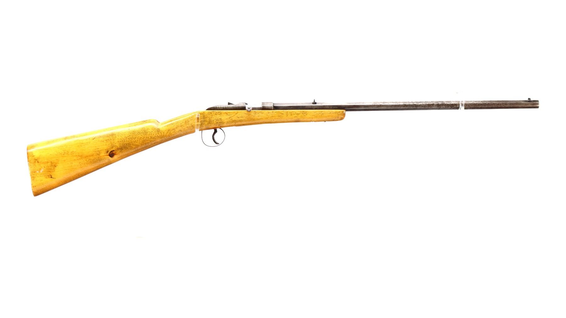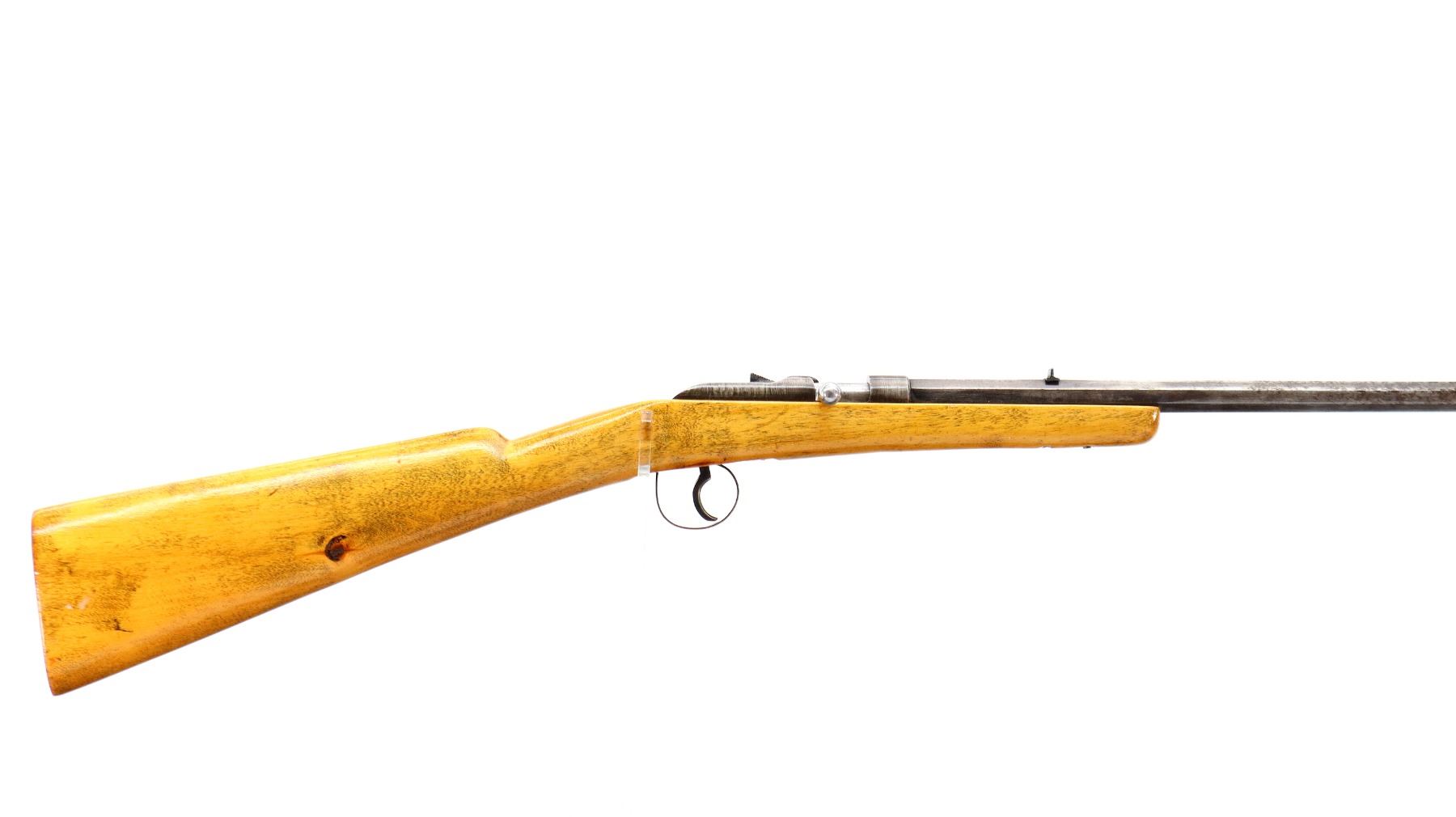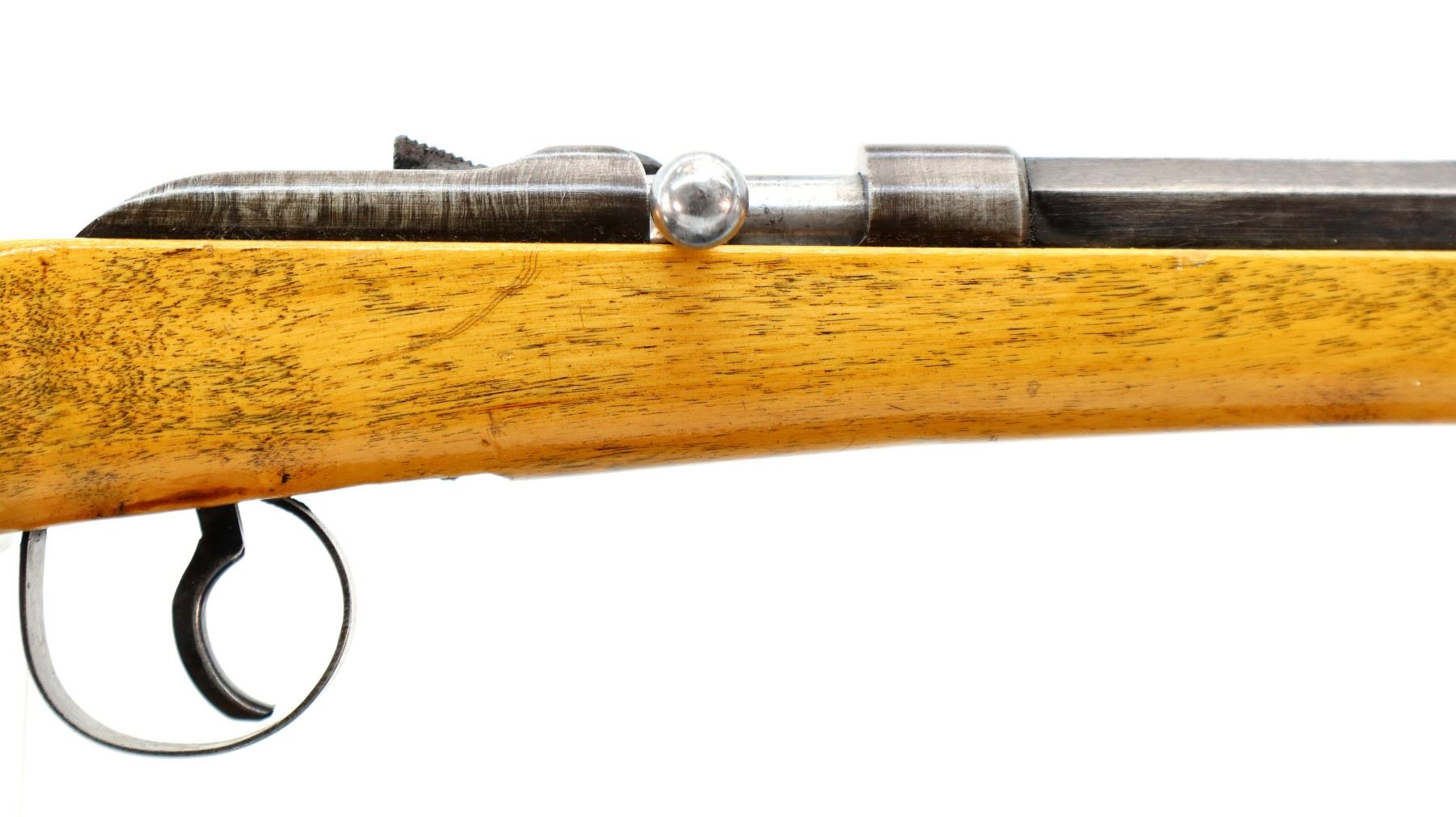 Main Description: Blade front sight, u notched rear sight, octagon barrel, straight bolt handle, extractor is present. One piece wood stock, straight grip, smooth butt