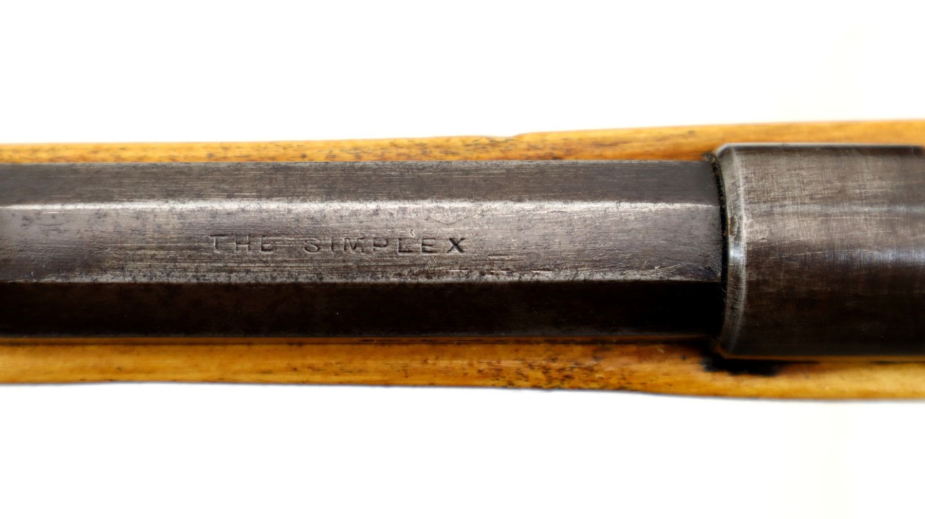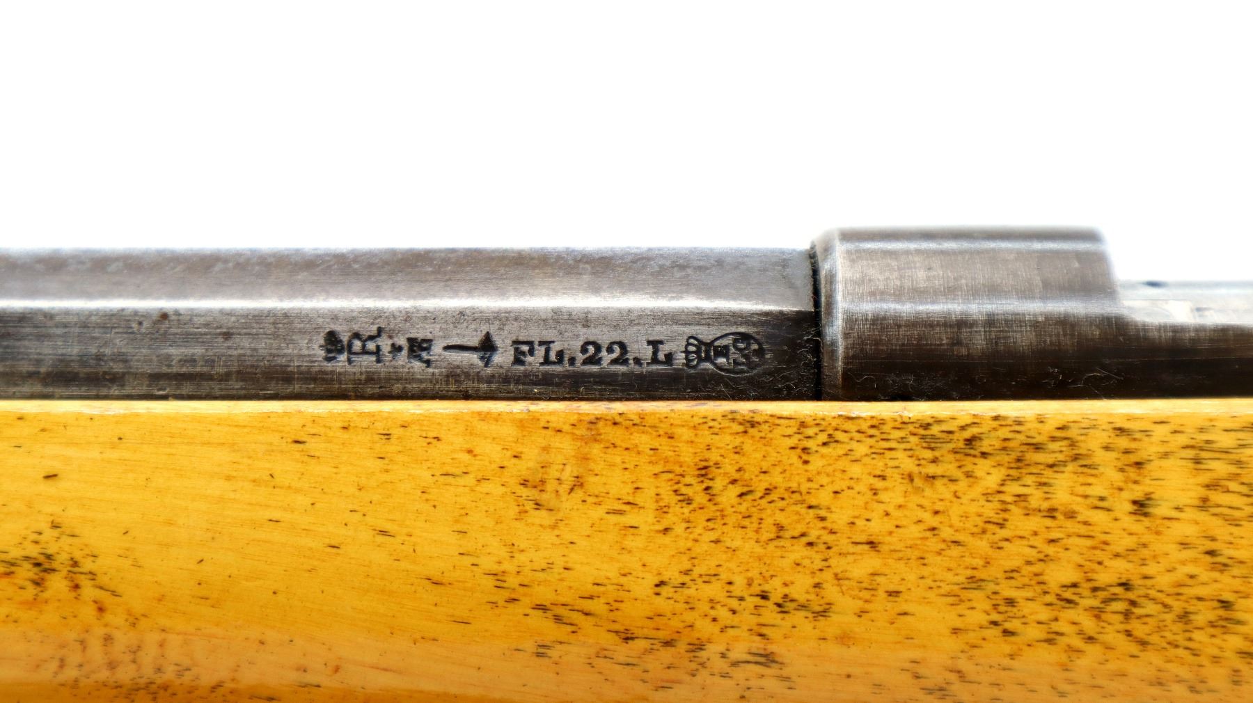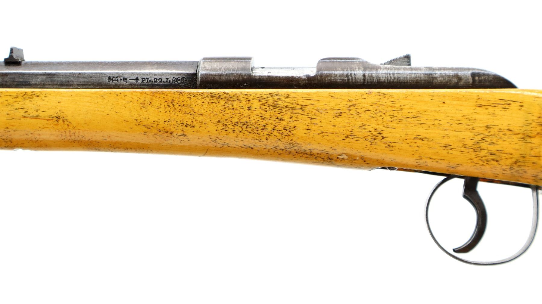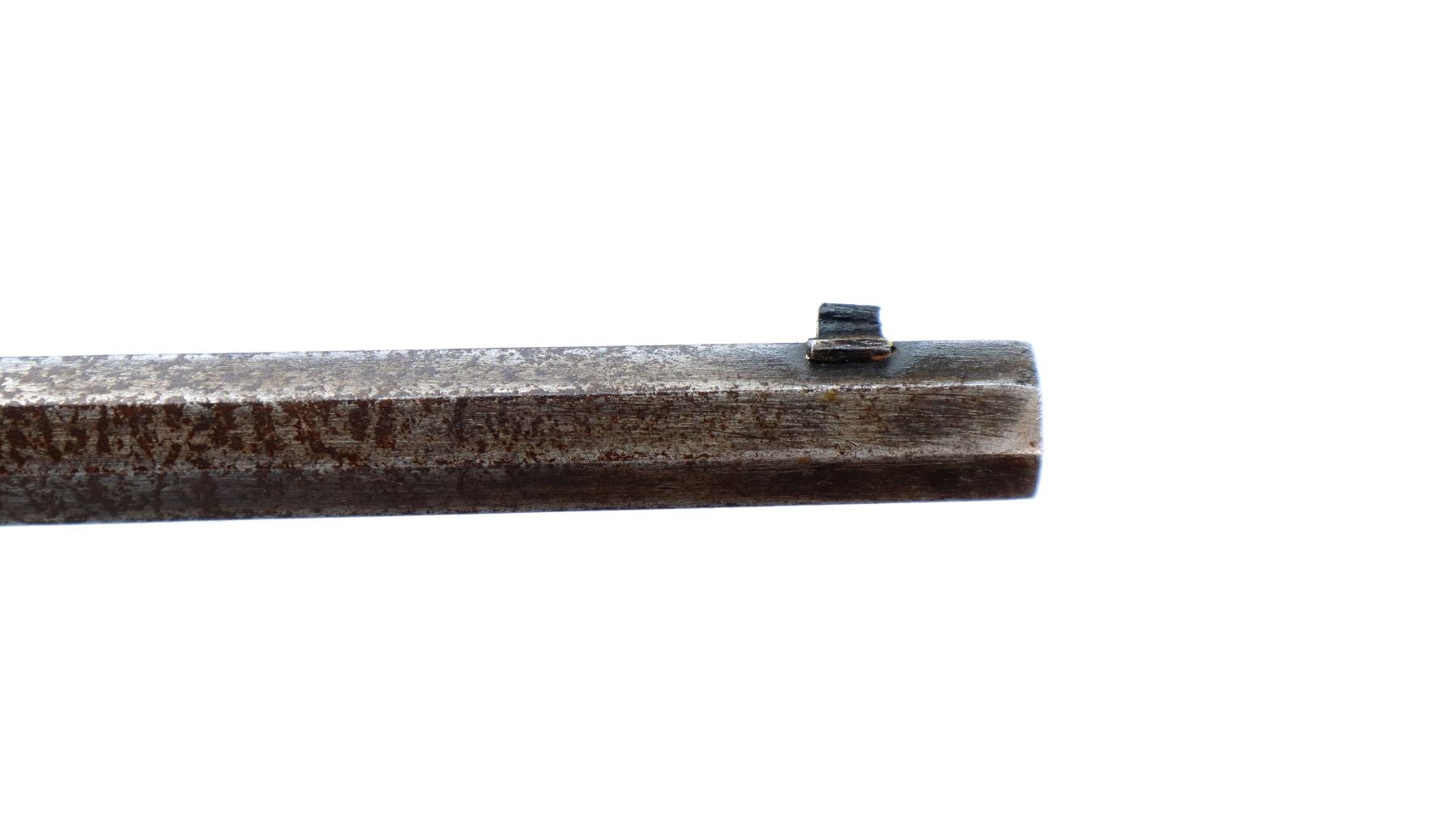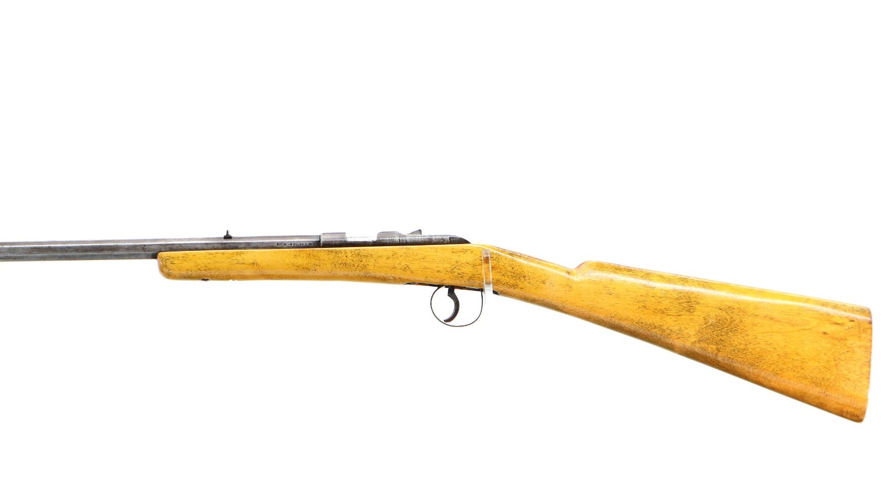 Main Description: Blade front sight, u notched rear sight, octagon barrel, straight bolt handle, extractor is present. One piece wood stock, straight grip, smooth butt