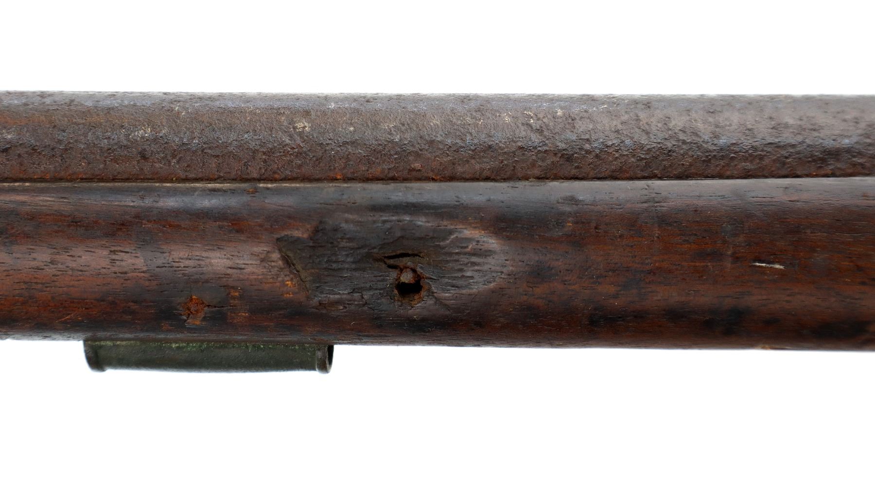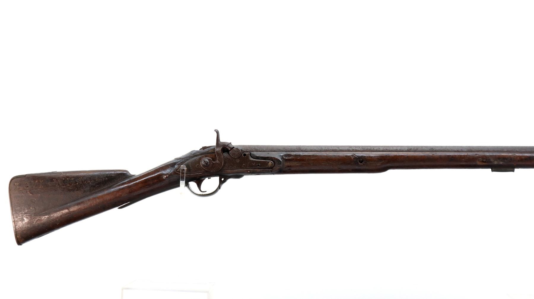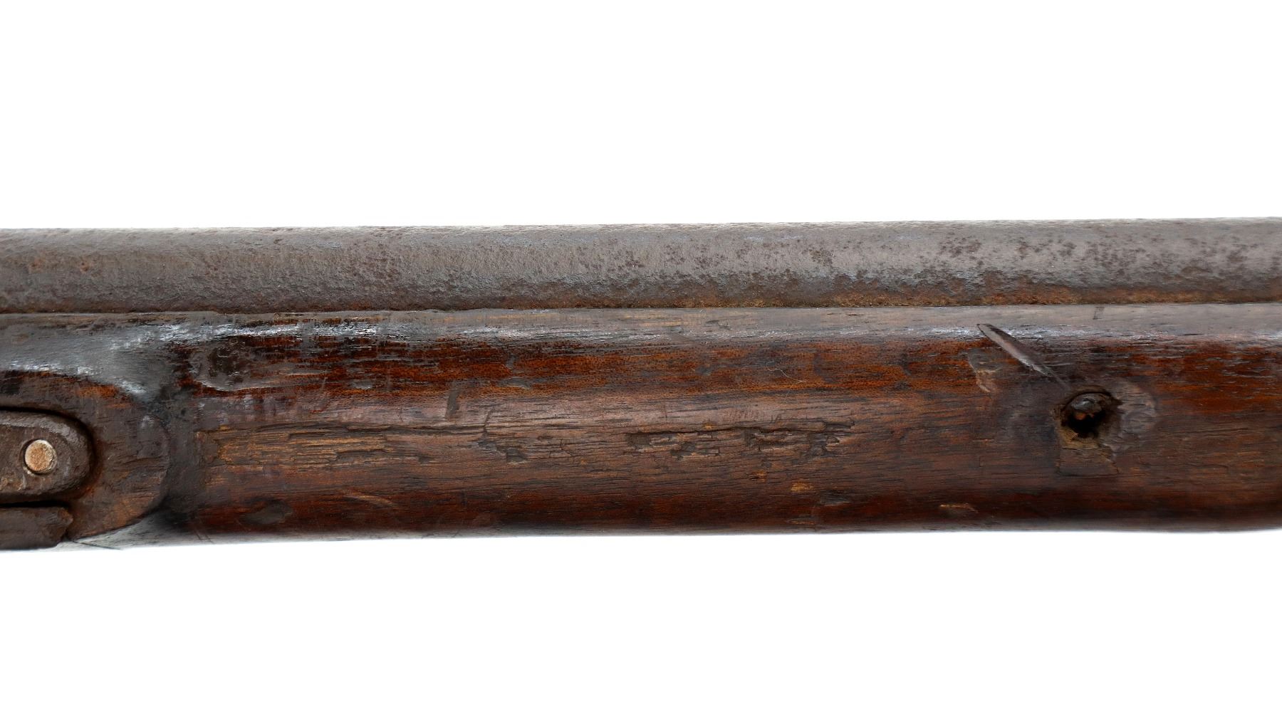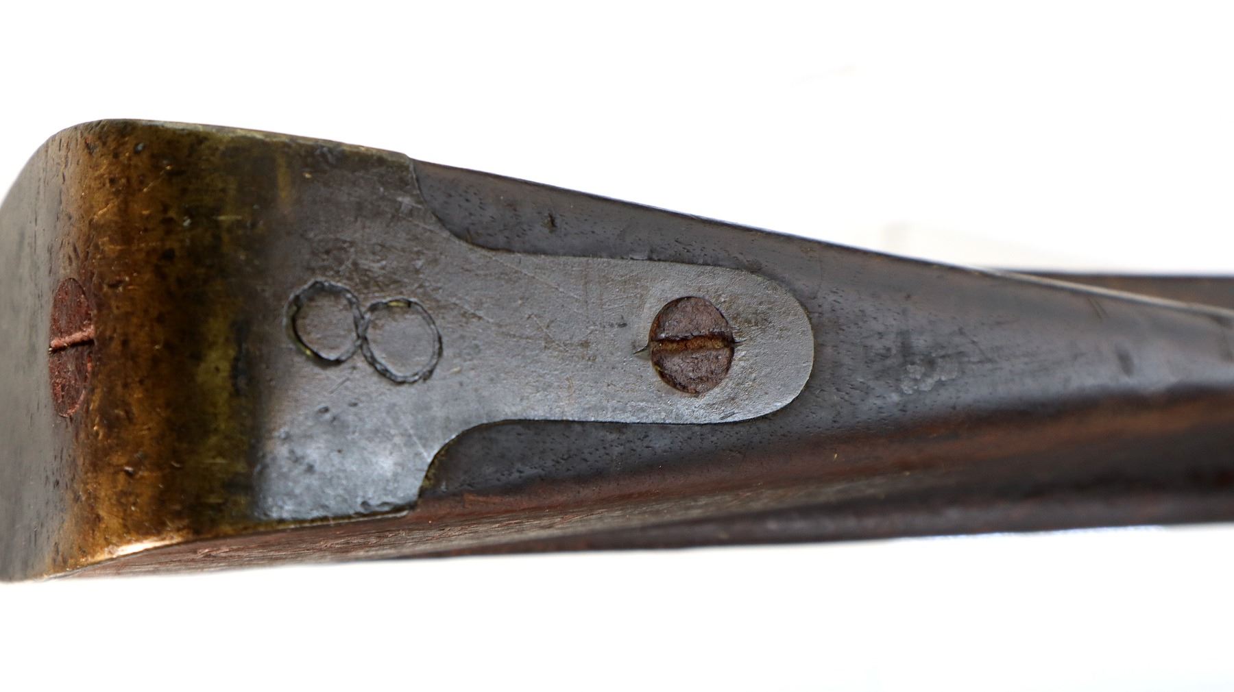 Main Description: Block front sight, tapered round barrel which has been shortened, lock marked Tower, converted from flint to percussion, hammer does not function, nipple damaged. One piece full military wood stock, forearm is chipped and cracked in various spots, straight grip, stock chipped and cracked around lock, barrel tang and in front of trigger guard, smooth brass butt plate, tang marked with number 8, right side of stock has Levi William carved into it. Brass trigger guard missing ramrod.