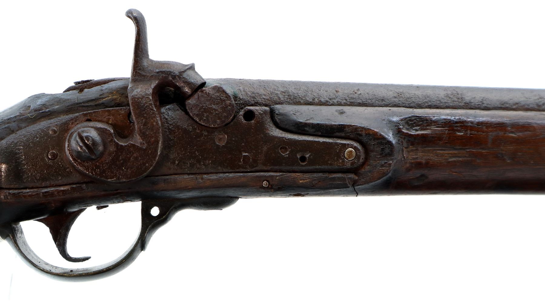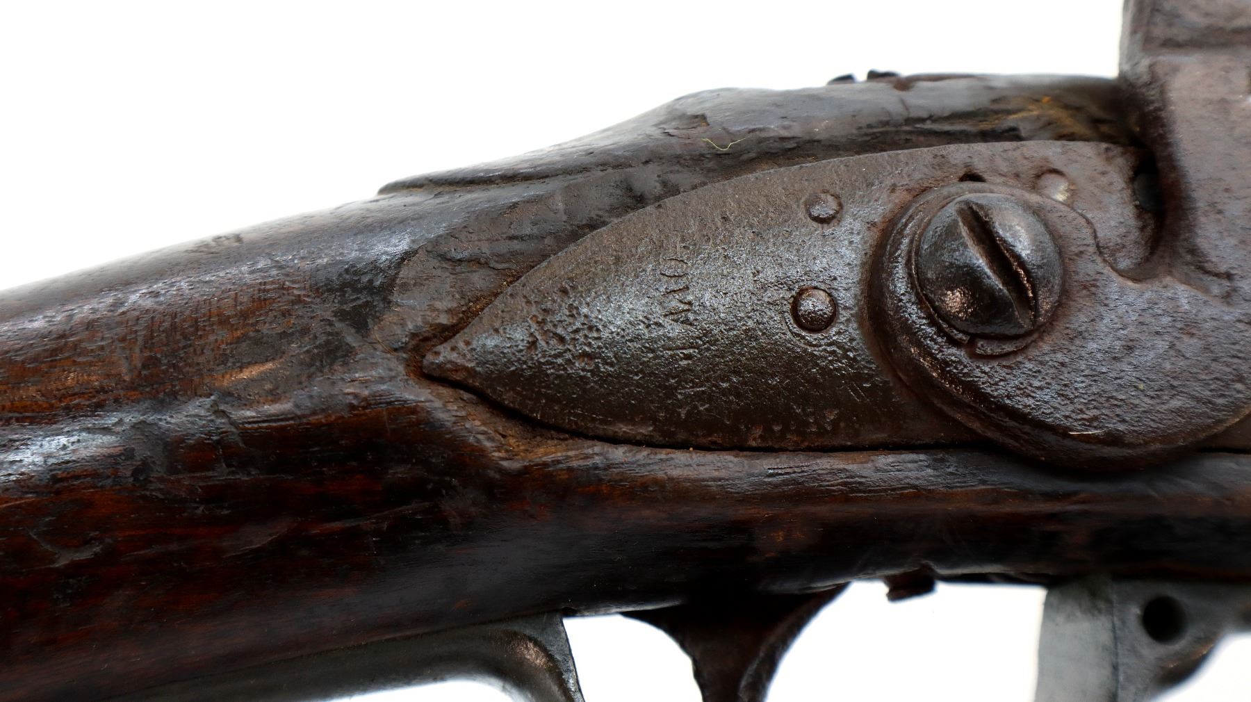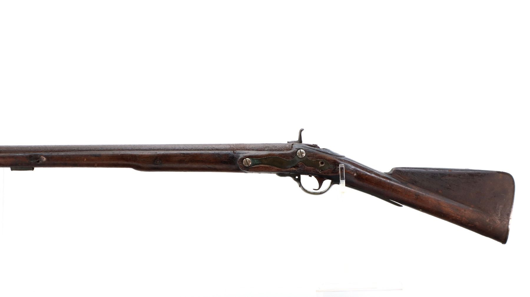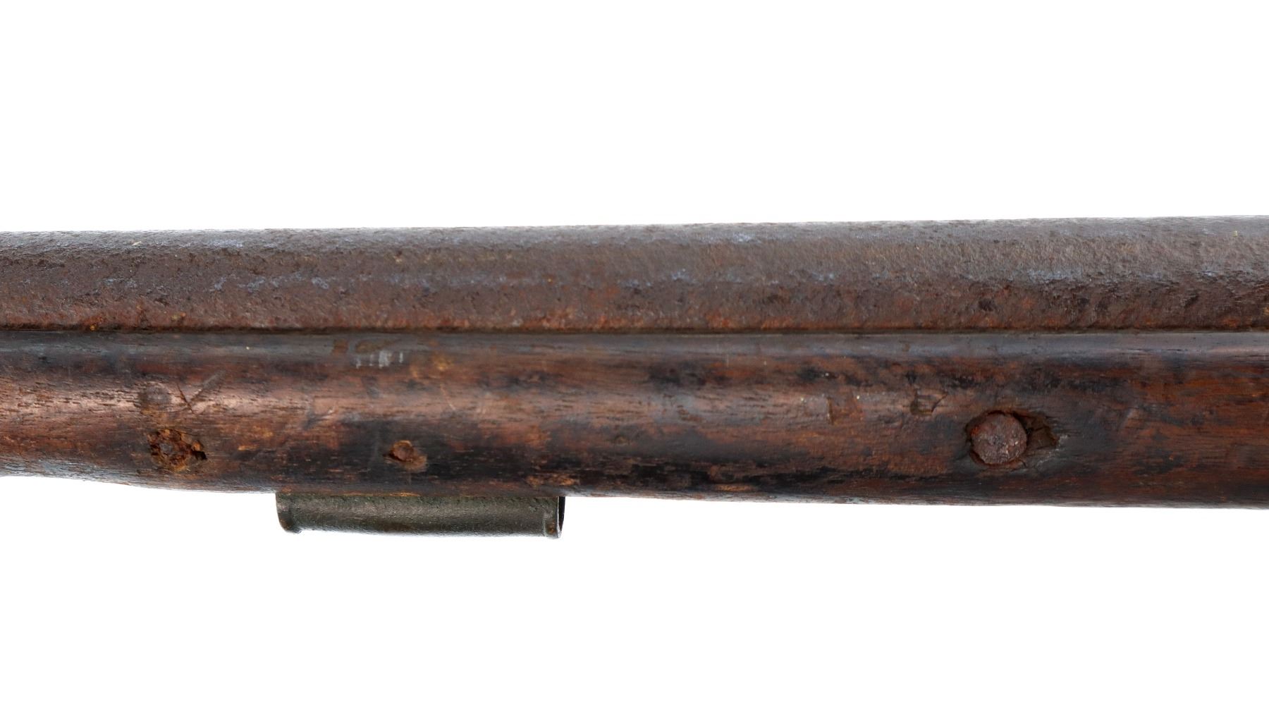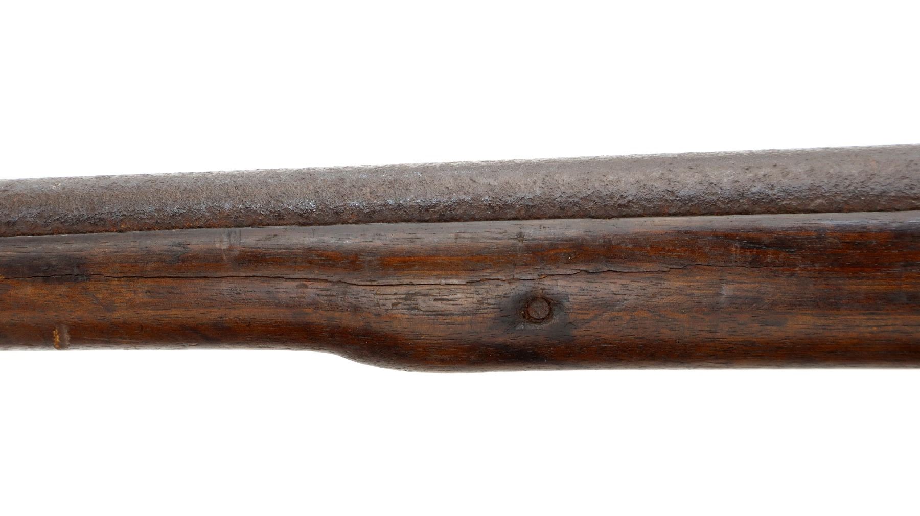 Main Description: Block front sight, tapered round barrel which has been shortened, lock marked Tower, converted from flint to percussion, hammer does not function, nipple damaged. One piece full military wood stock, forearm is chipped and cracked in various spots, straight grip, stock chipped and cracked around lock, barrel tang and in front of trigger guard, smooth brass butt plate, tang marked with number 8, right side of stock has Levi William carved into it. Brass trigger guard missing ramrod.