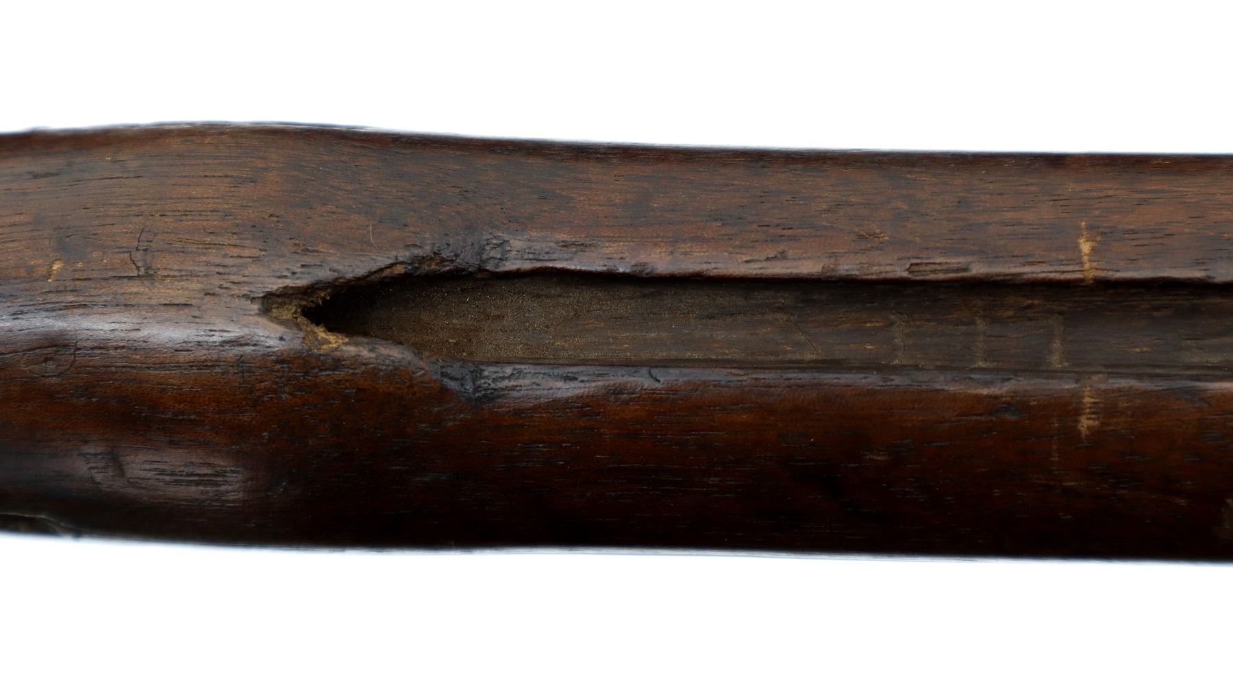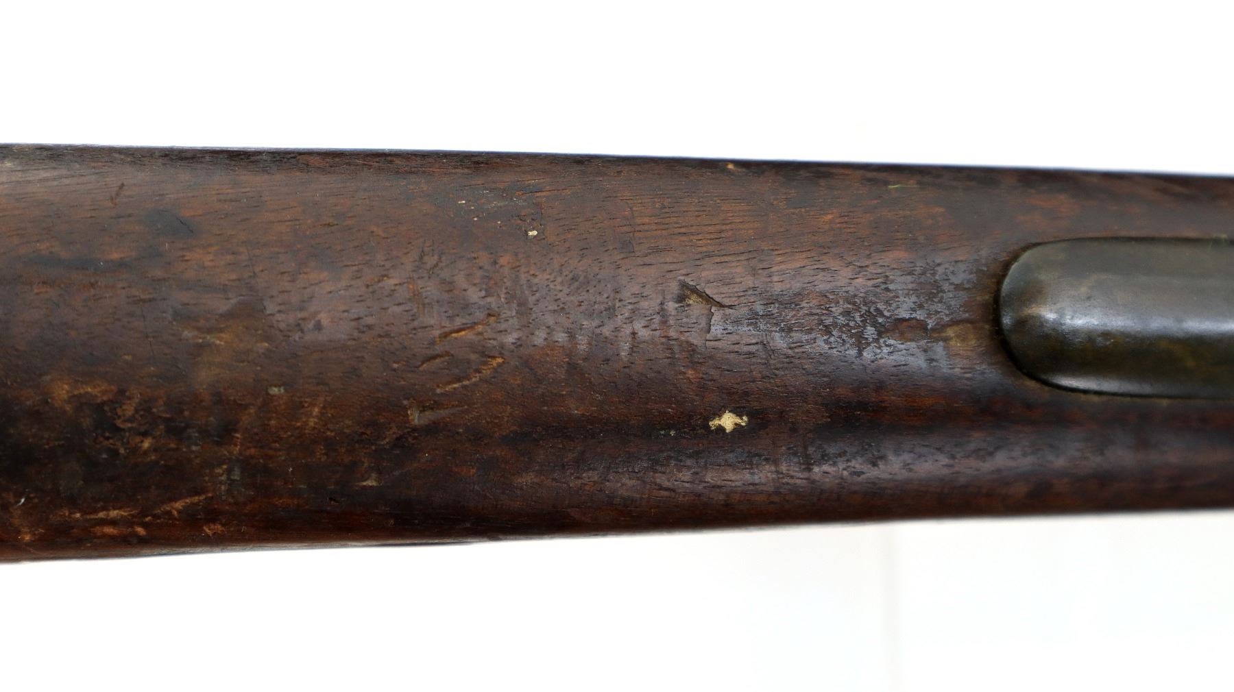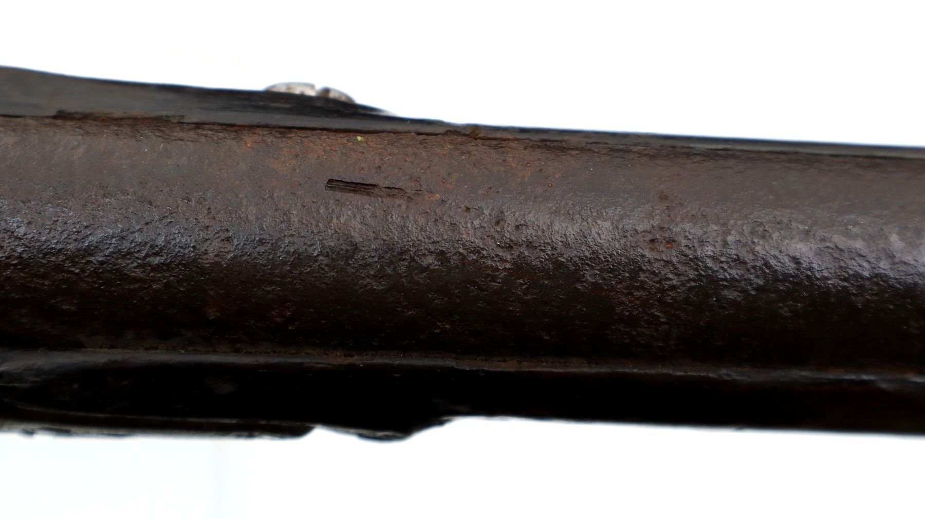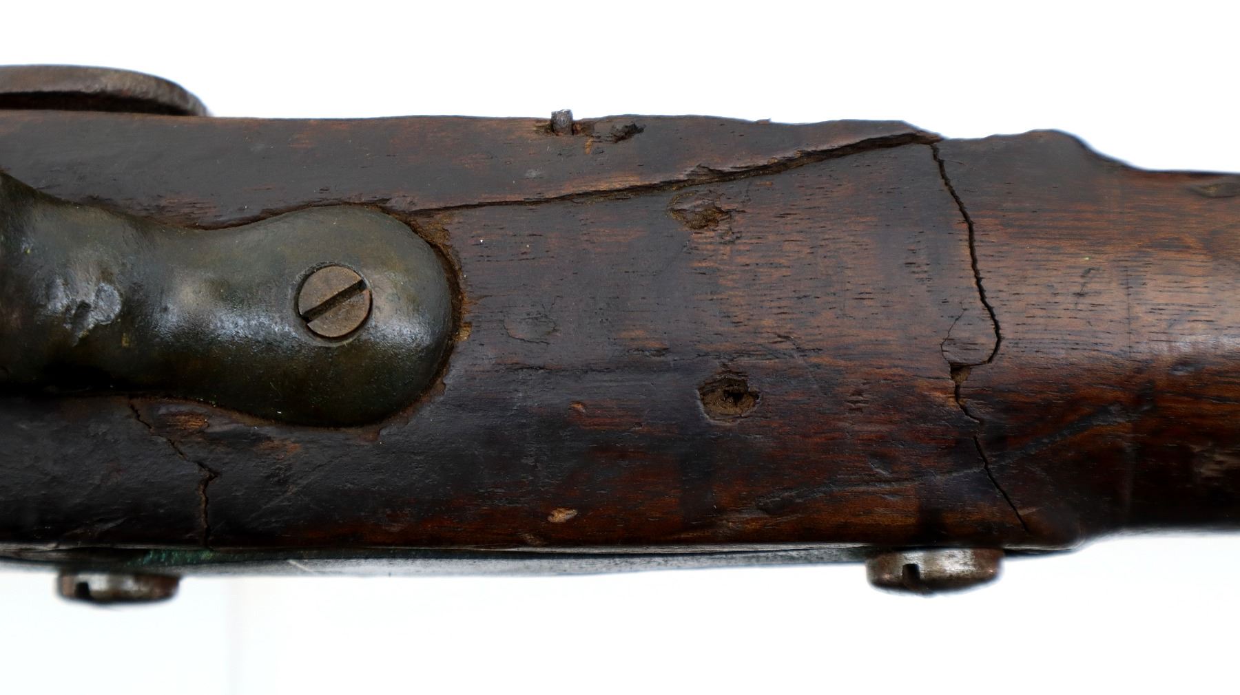 Main Description: Block front sight, tapered round barrel which has been shortened, lock marked Tower, converted from flint to percussion, hammer does not function, nipple damaged. One piece full military wood stock, forearm is chipped and cracked in various spots, straight grip, stock chipped and cracked around lock, barrel tang and in front of trigger guard, smooth brass butt plate, tang marked with number 8, right side of stock has Levi William carved into it. Brass trigger guard missing ramrod.