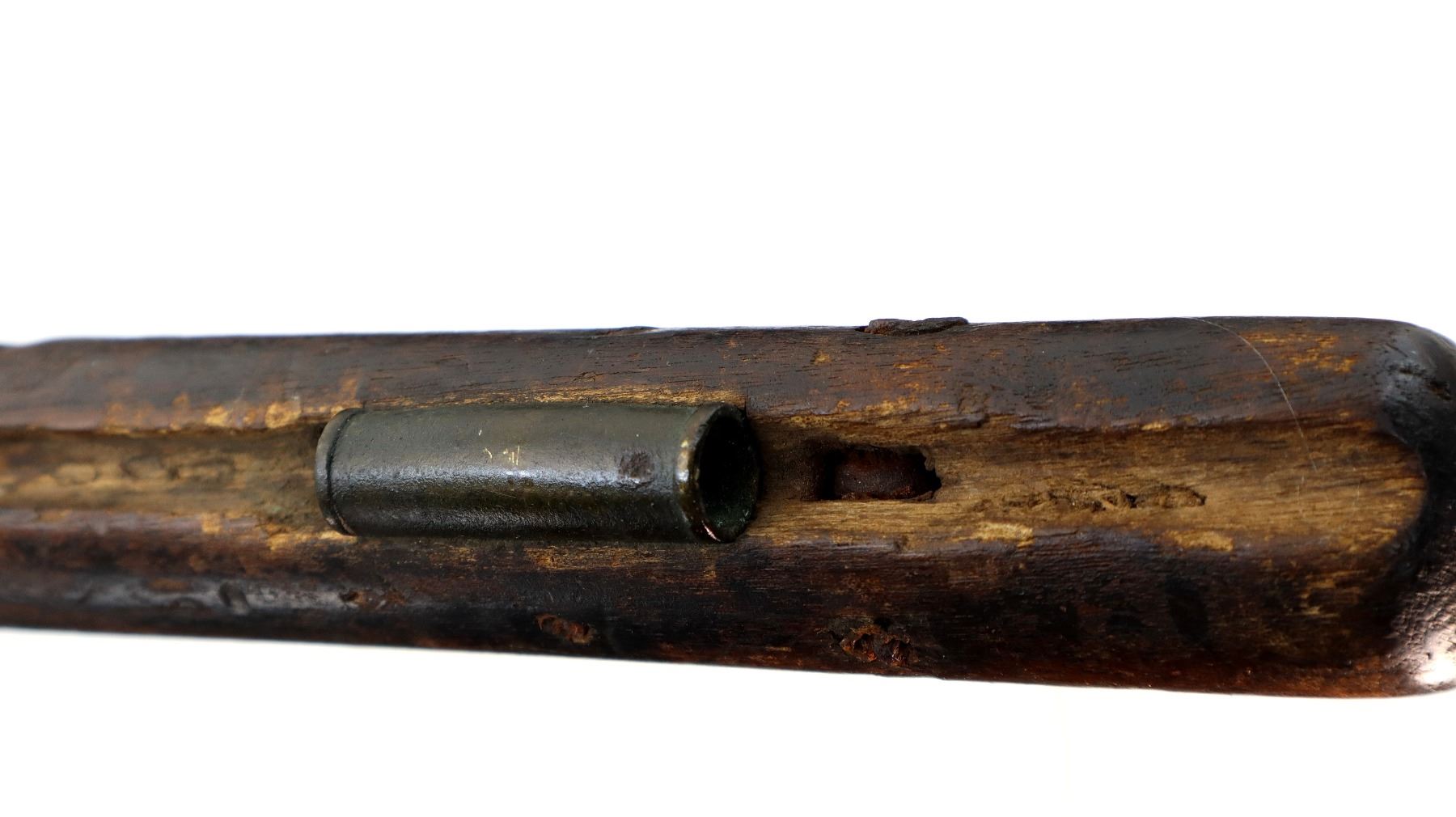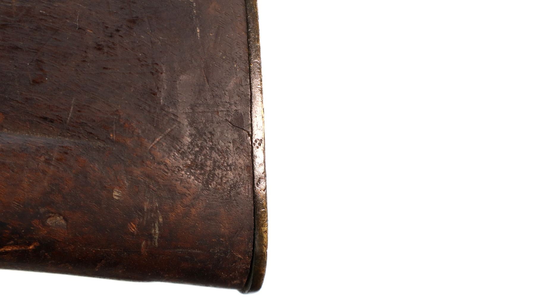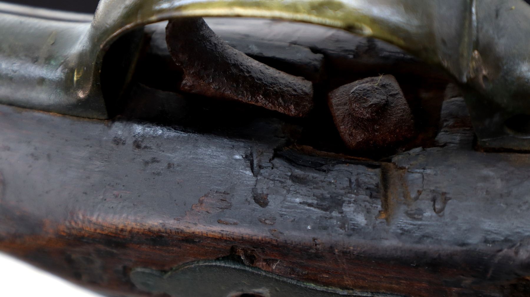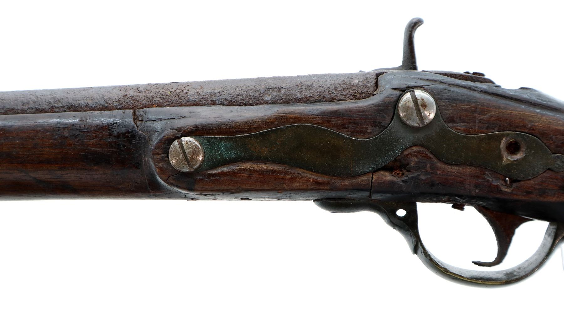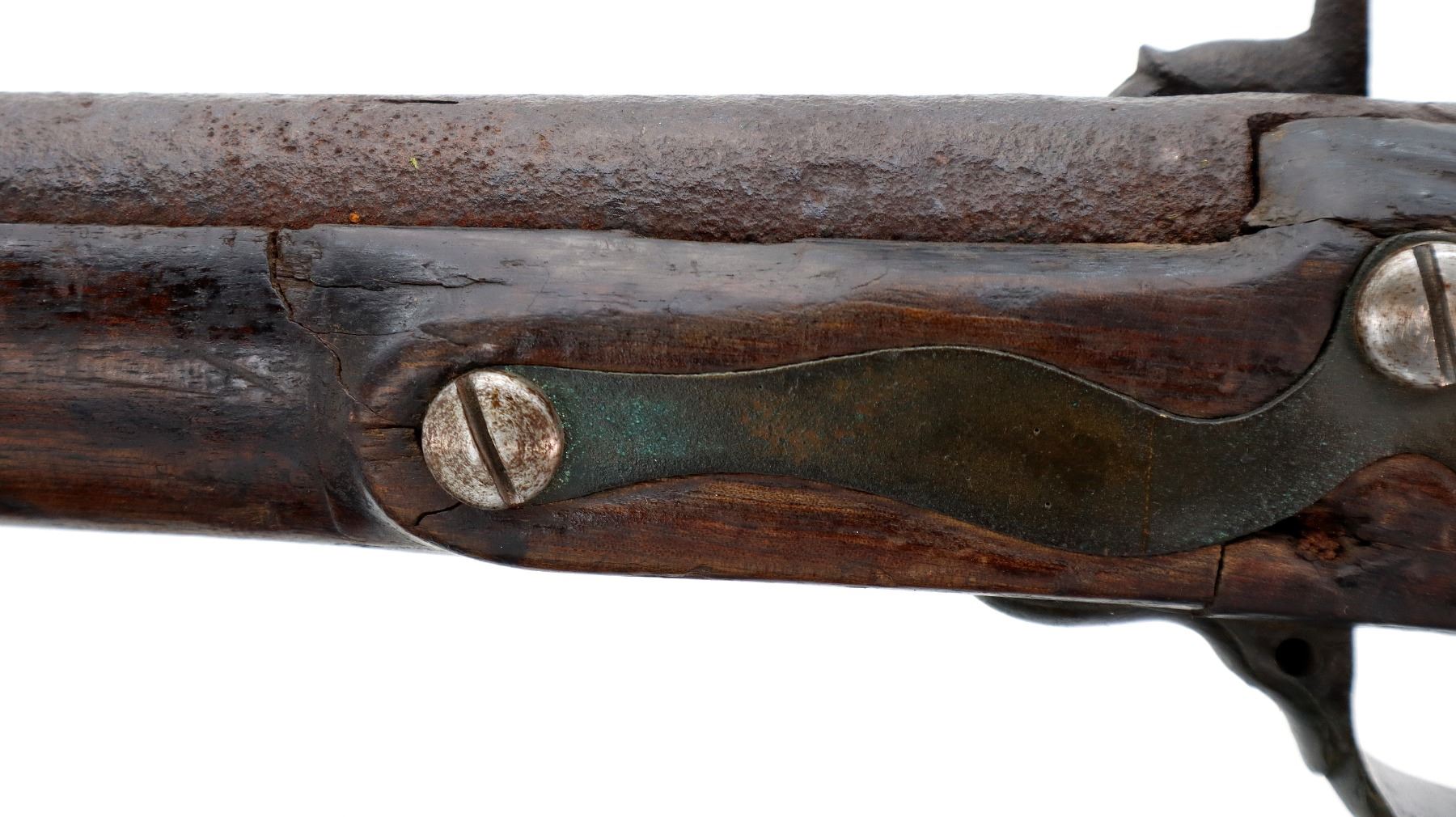Main Description: Block front sight, tapered round barrel which has been shortened, lock marked Tower, converted from flint to percussion, hammer does not function, nipple damaged. One piece full military wood stock, forearm is chipped and cracked in various spots, straight grip, stock chipped and cracked around lock, barrel tang and in front of trigger guard, smooth brass butt plate, tang marked with number 8, right side of stock has Levi William carved into it. Brass trigger guard missing ramrod.