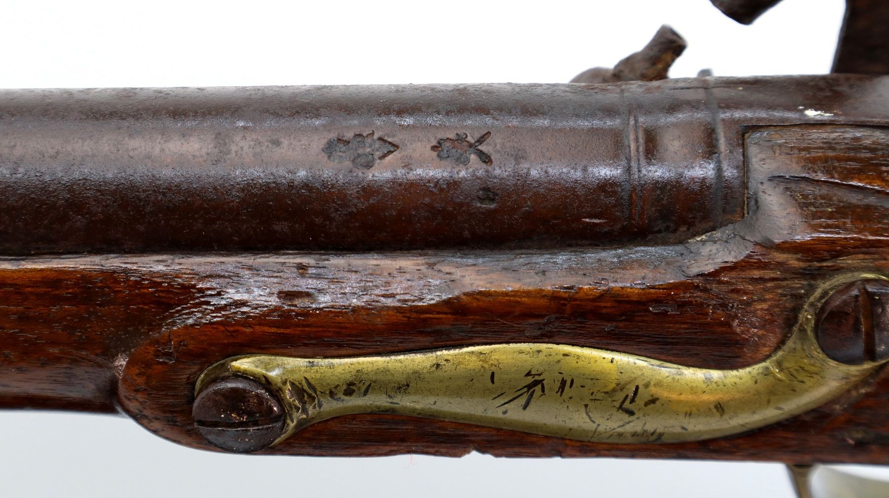 Main Description: Block front sight, tapered round barrel with British proof marks, lock marked Tower with Crown GR, smooth spur hammer that does not function. One piece shortened wood stock, forearm is chipped, cracked and broken, straight grip, chipped and cracked around lock, smooth brass butt plate, stock has partial name etched into it, trigger guard not secured to stock.