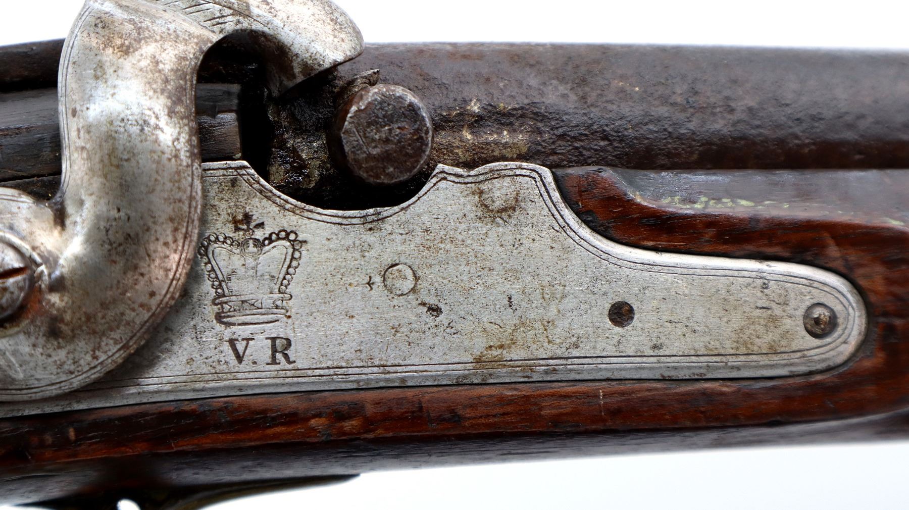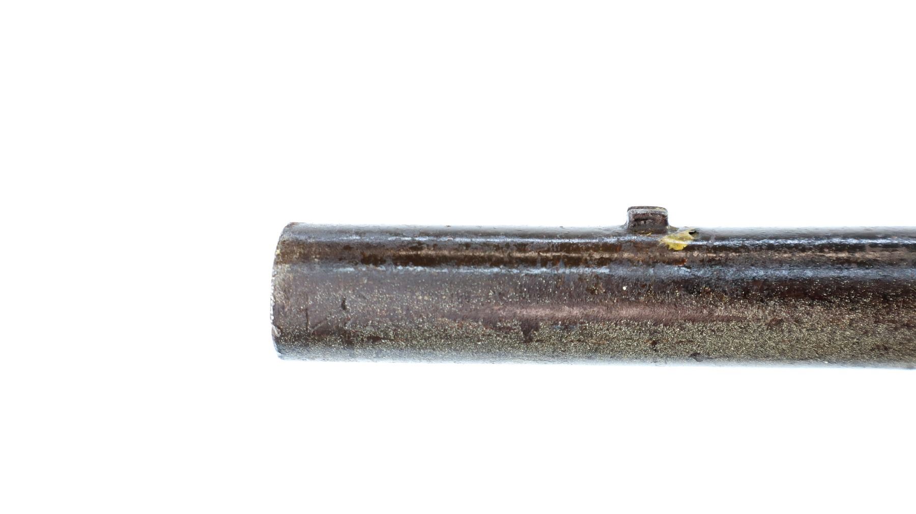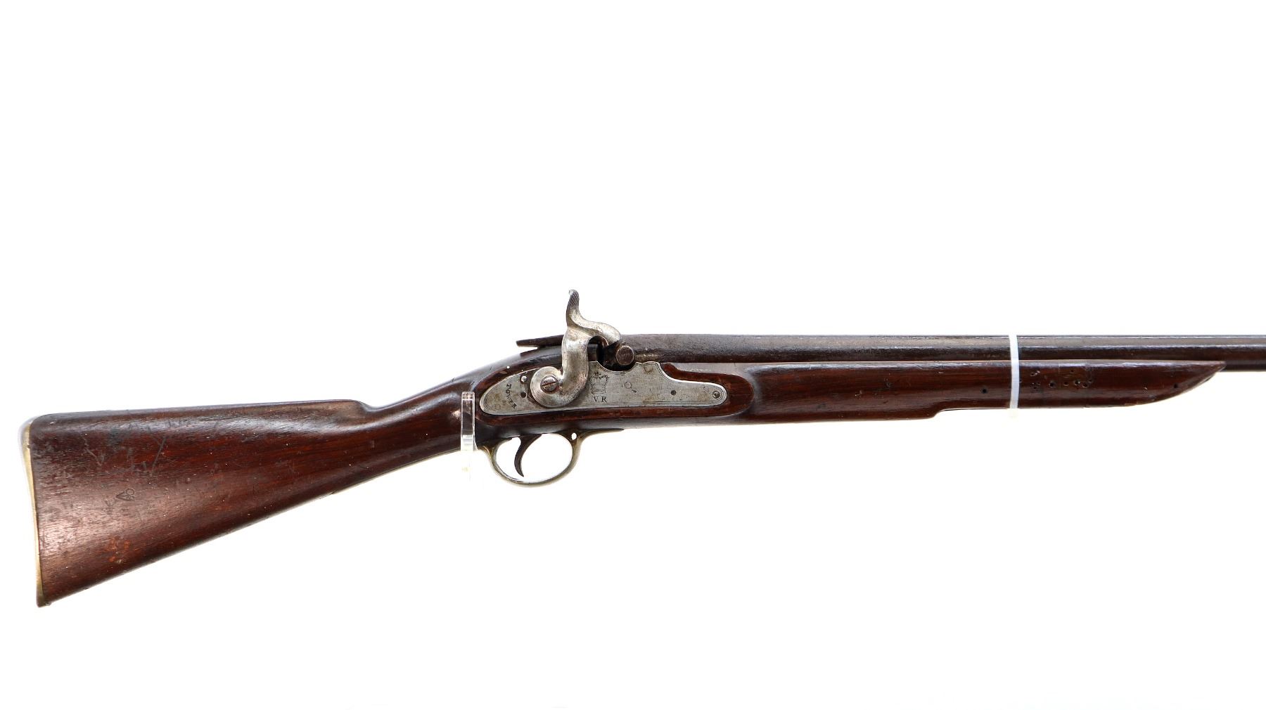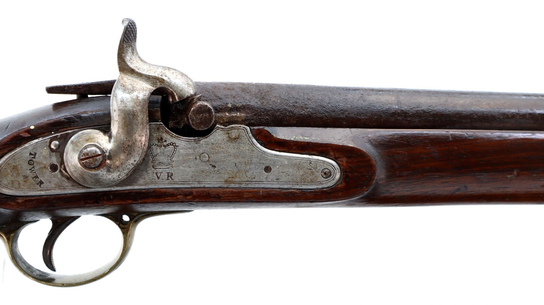 Main Description: Block front sight, tapered round barrel, lock marked Tower Crown VR with checkered spur hammer that functions, nipple is damaged. One piece shortened wood stock, forend is chipped, cracked and broken, straight grip, stock chipped and cracked behind tang barrel does not fit well, smooth brass butt plate and trigger guard.