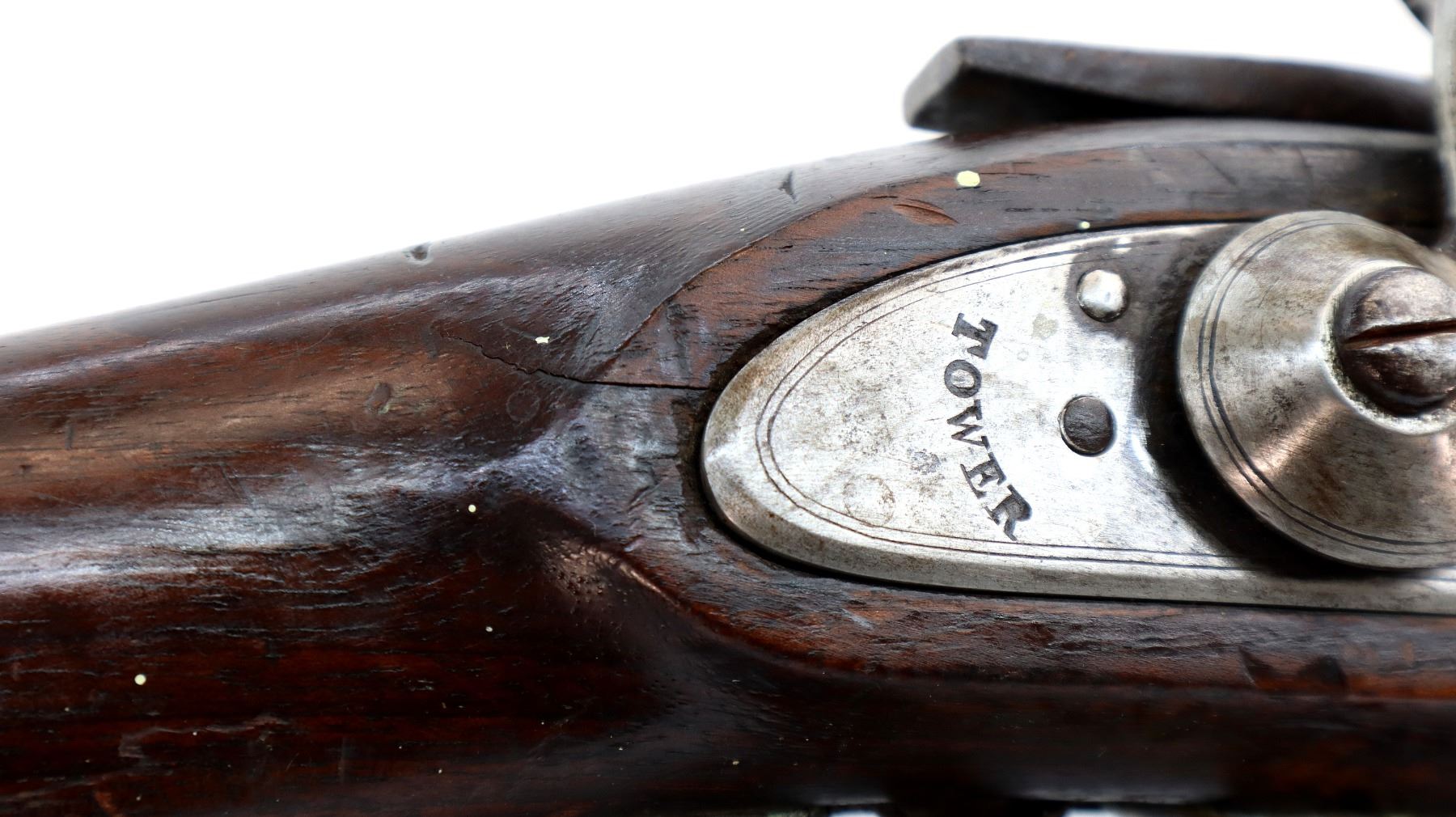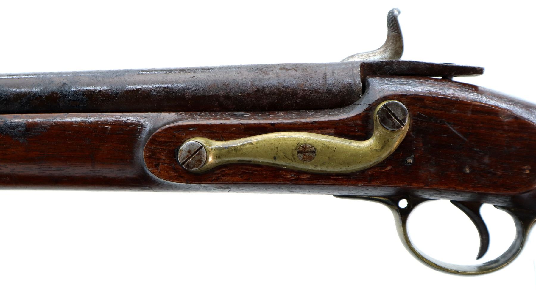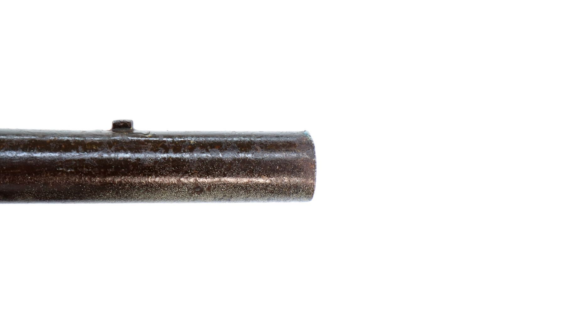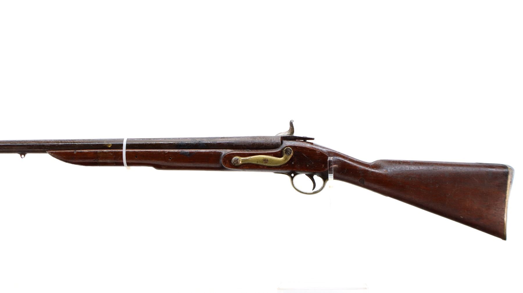 Main Description: Block front sight, tapered round barrel, lock marked Tower Crown VR with checkered spur hammer that functions, nipple is damaged. One piece shortened wood stock, forend is chipped, cracked and broken, straight grip, stock chipped and cracked behind tang barrel does not fit well, smooth brass butt plate and trigger guard.