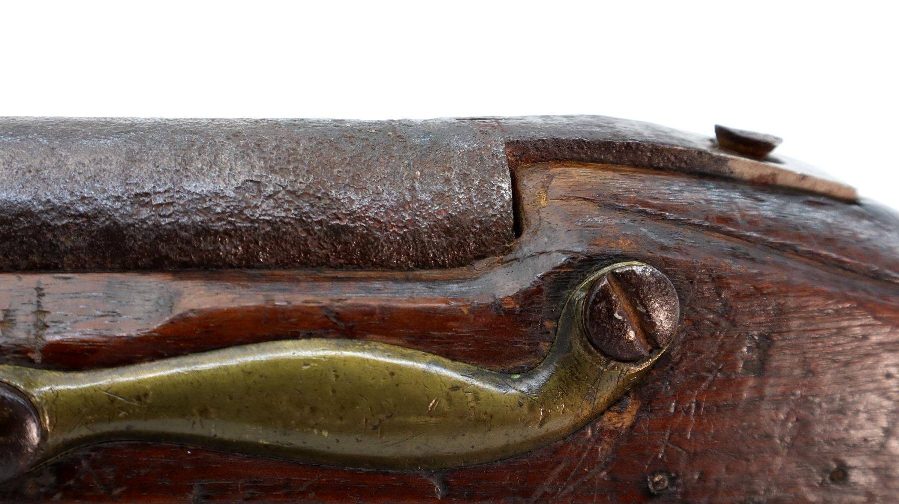 Main Description: Block front sight, tapered round barrel, lock marked Tower Crown GR, missing hammer frizzen and associated parts, flashole has been welded closed. One piece shortened wood stock, straight grip chipped and cracked around lock behind tang and trigger guard. Smooth brass butt plate and trigger guard, initials W.H on bottom of forearm.
