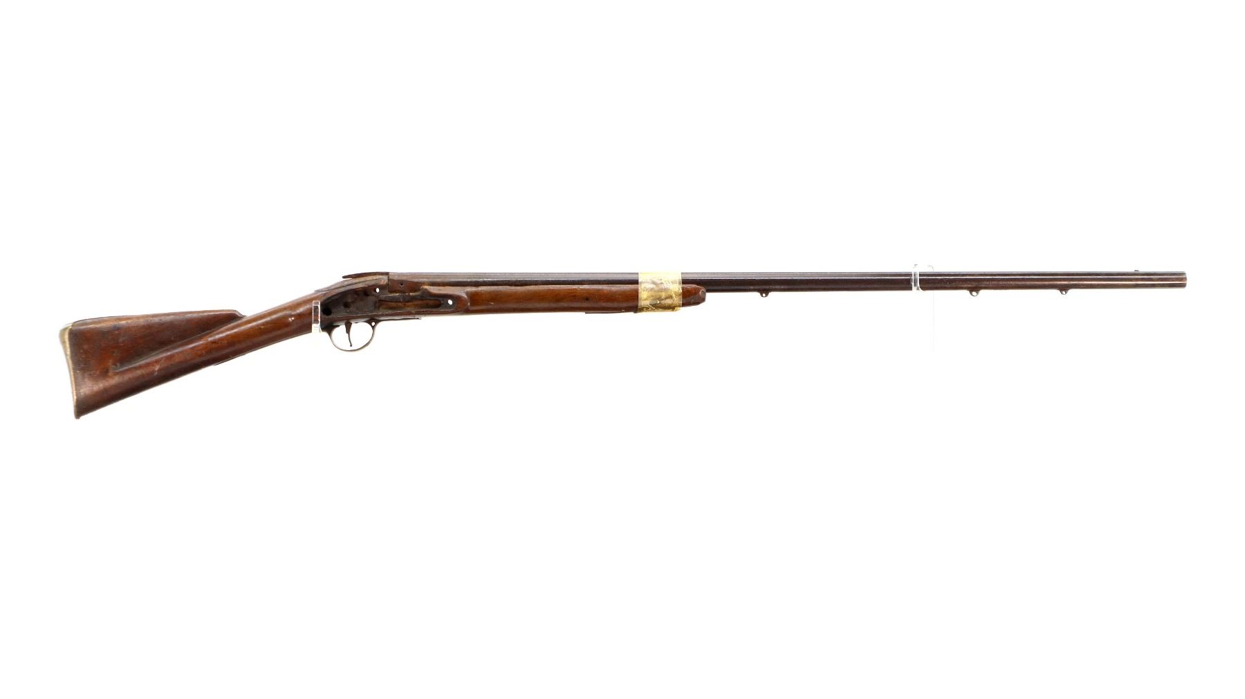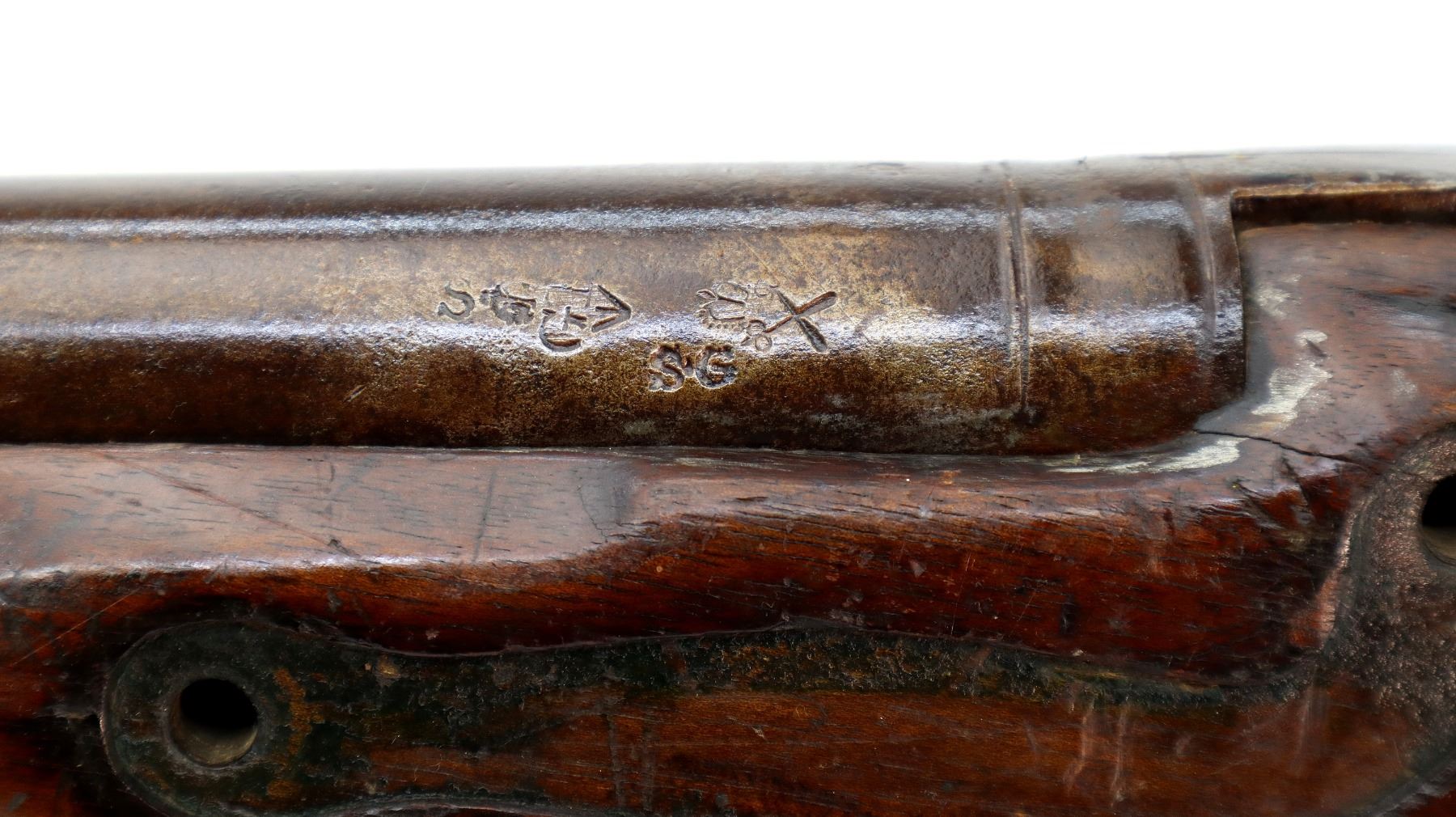 Main Description: Block front sight, tapered round barrel with British proof marks, missing complete lock, left side plate and various screws. Shortened One piece wood stock, straight grip chipped and cracked around lock area and barrel tang, smooth brass butt plate and trigger guard, missing complete ramrod and associated parts.