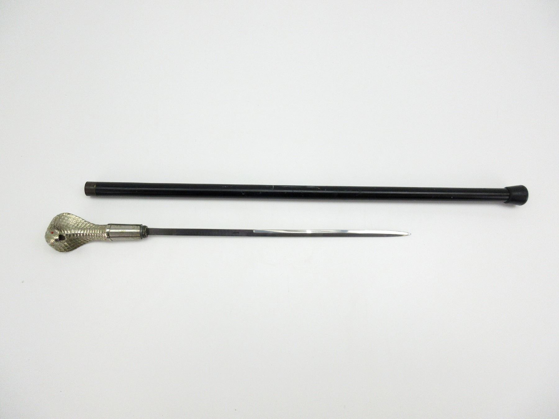 (1) STEEL BLADE, MARKED: "PAKISTAN", COBRA HEAD HANDLE, BLADE APPROX. 18 3/8", BLACK METAL & BRASS CANE, UNMARKED, OAL APPROX. 36.5". SEE PHOTOS.