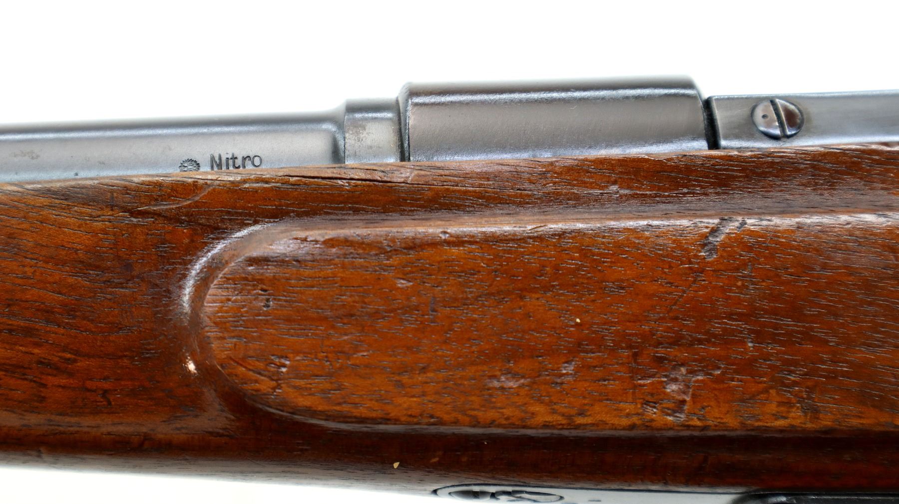 Main Description: Silver bead, blued finish, round barrel, extractor is present and turned down bolt handle. One piece wood stock, Schnabel forend tip, checkered pistol grip cracked behind receiver, smooth steel butt plate, stock has age cracks