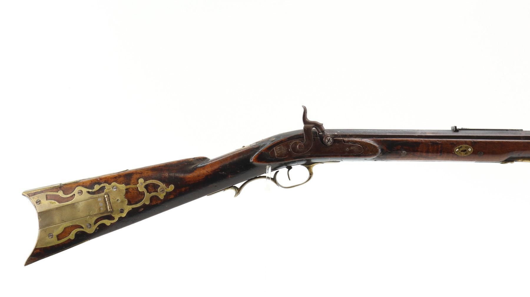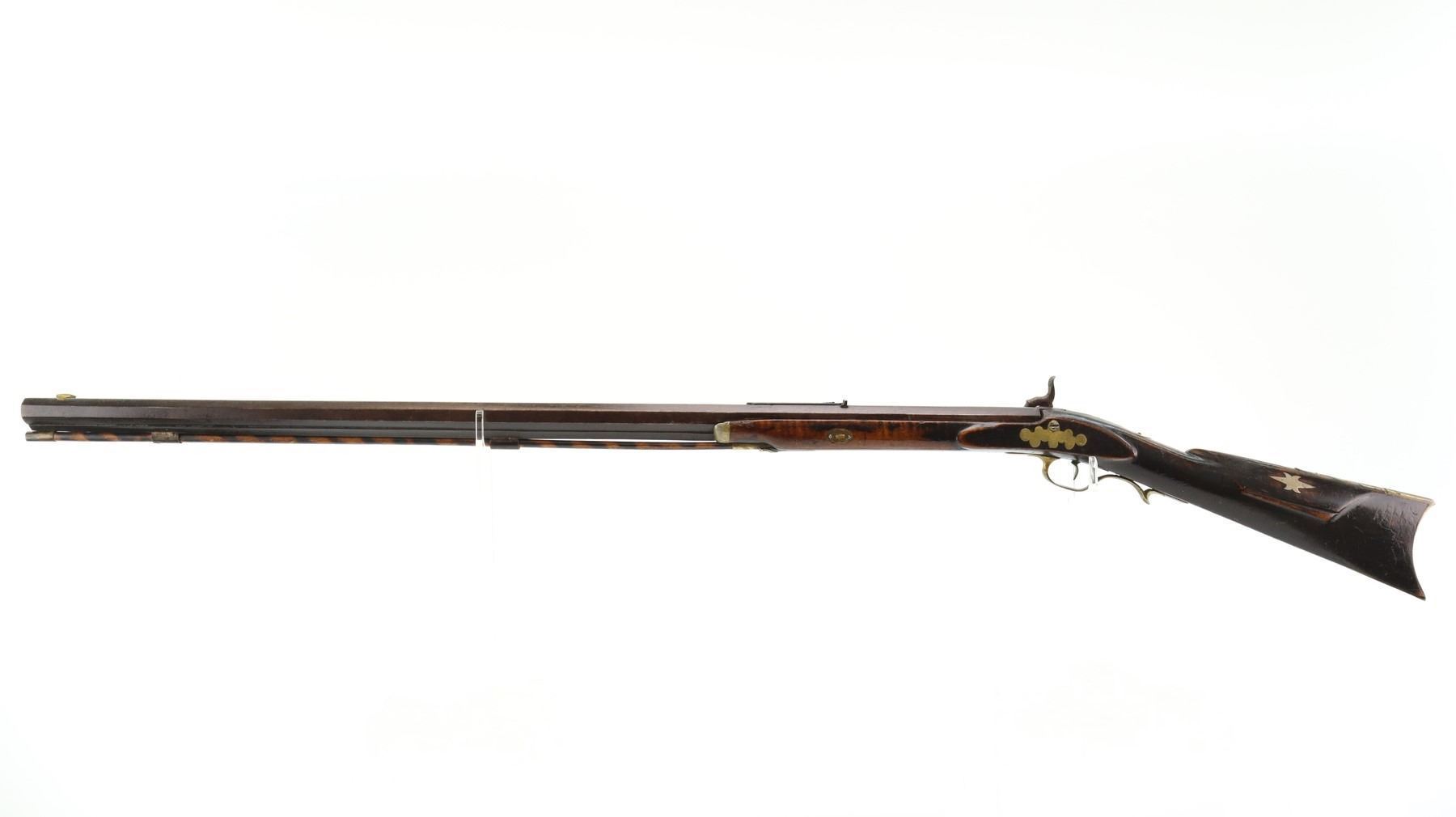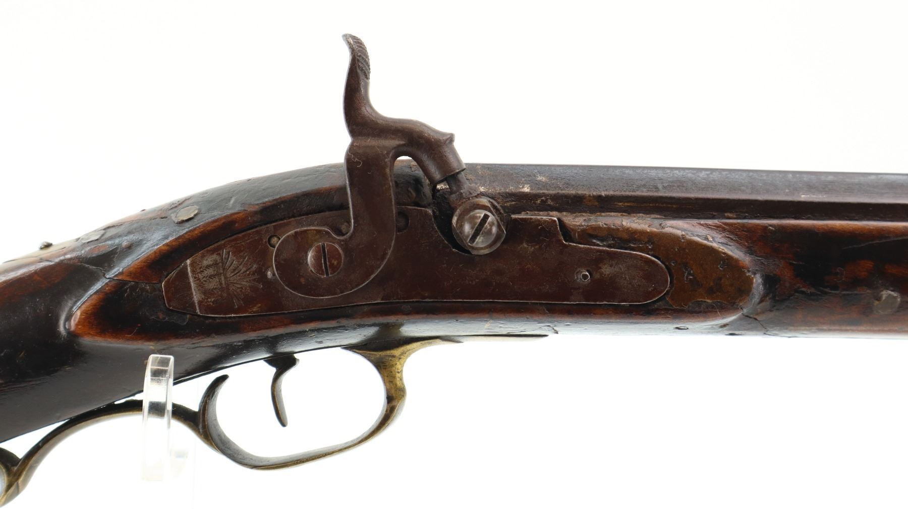NRA POOR. UNKNOWN MAKER. MODEL: KENTUCKY. CALIBER: .50 CAL. BORE IS POOR, DARK, PITTED. BLADE FRONT SIGHT, ADJUSTABLE U NOTCHED REAR SIGHT, HEAVY OCTAGON BARREL WITH DEEP RIFLING, REAR TANG IS BROKEN, ENGRAVED SIDELOCK WITH CHECKERED SPUR HAMMER THAT FUNCTIONS . ONE PIECE SMOOTH HALF LENGTH WOOD STOCK, FOREARM IS CRACKED WITH REPLACED WEDGE, BRASS SIDE PLATE, STOCK IS BROKEN REPAIRED AND LOOSE AROUND LOCK, STRAIGHT GRIP, SMOOTH BRASS BUTT PLATE, PATCHBOX, FINGER REST TRIGGER GUARD, REPLACED WOOD RAMROD. METAL FINISH SHOWS SOME LIGHT PITTING, RUST SPECKLES, SCRATCHES, HANDLING MARKS AND WEAR. STOCK SHOWS MARKS, SCRATCHES AND WEAR. ACTION: PERCUSSION RIFLE. BARREL LENGTH: 36.75". SERIAL # NA. CONDITION: NRA POOR. CLASS: CANADIAN ANTIQUE CLASS, NO LICENSE REQUIRED