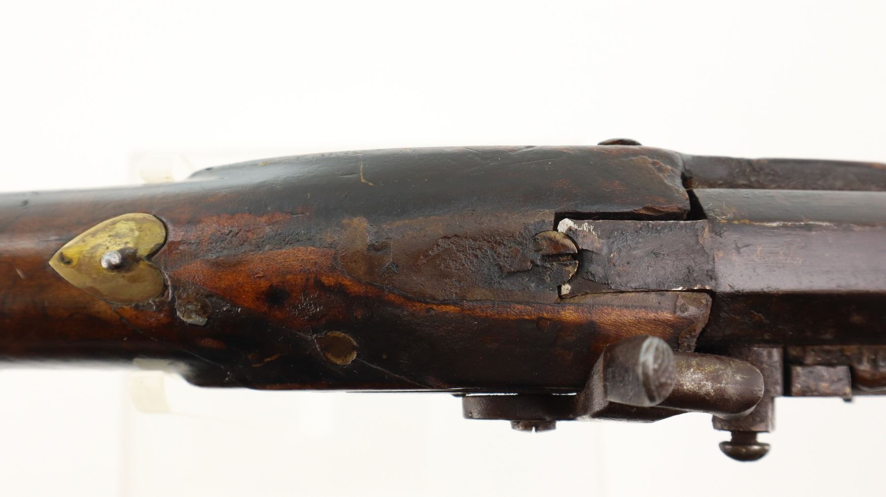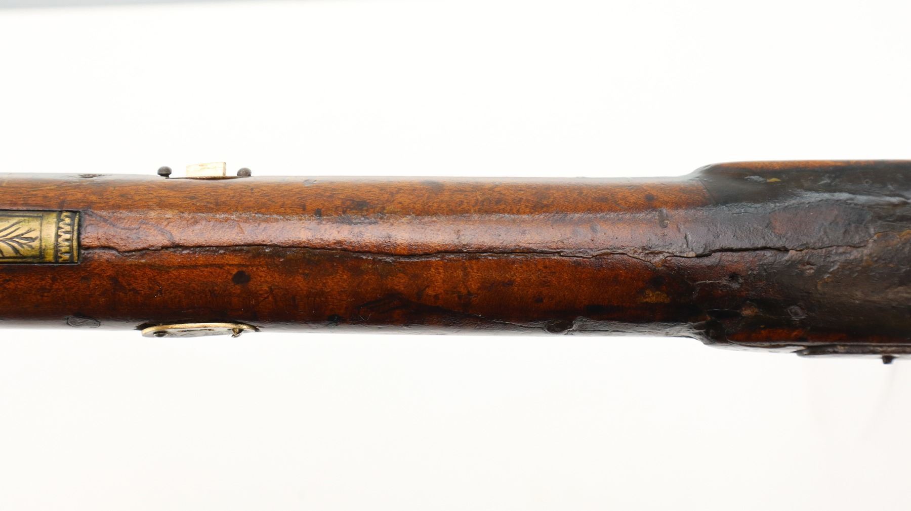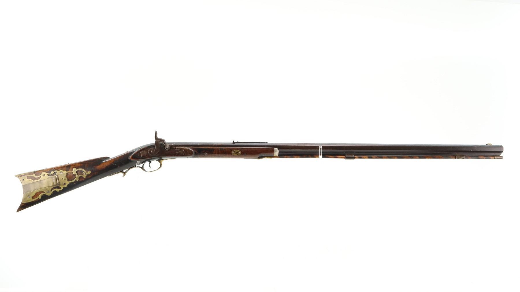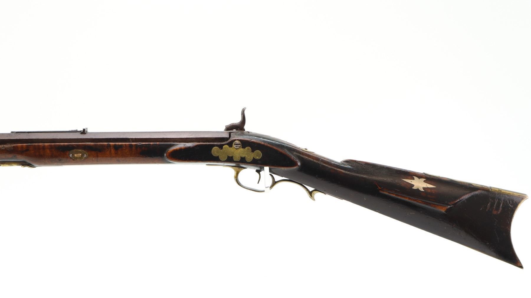 NRA POOR. UNKNOWN MAKER. MODEL: KENTUCKY. CALIBER: .50 CAL. BORE IS POOR, DARK, PITTED. BLADE FRONT SIGHT, ADJUSTABLE U NOTCHED REAR SIGHT, HEAVY OCTAGON BARREL WITH DEEP RIFLING, REAR TANG IS BROKEN, ENGRAVED SIDELOCK WITH CHECKERED SPUR HAMMER THAT FUNCTIONS . ONE PIECE SMOOTH HALF LENGTH WOOD STOCK, FOREARM IS CRACKED WITH REPLACED WEDGE, BRASS SIDE PLATE, STOCK IS BROKEN REPAIRED AND LOOSE AROUND LOCK, STRAIGHT GRIP, SMOOTH BRASS BUTT PLATE, PATCHBOX, FINGER REST TRIGGER GUARD, REPLACED WOOD RAMROD. METAL FINISH SHOWS SOME LIGHT PITTING, RUST SPECKLES, SCRATCHES, HANDLING MARKS AND WEAR. STOCK SHOWS MARKS, SCRATCHES AND WEAR. ACTION: PERCUSSION RIFLE. BARREL LENGTH: 36.75". SERIAL # NA. CONDITION: NRA POOR. CLASS: CANADIAN ANTIQUE CLASS, NO LICENSE REQUIRED
