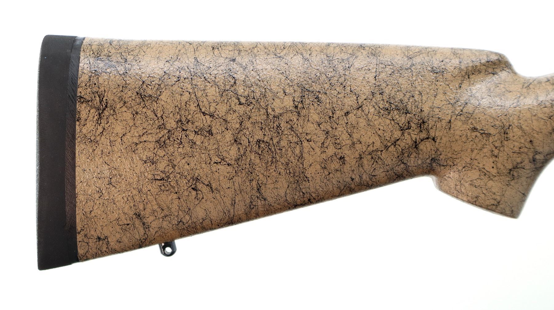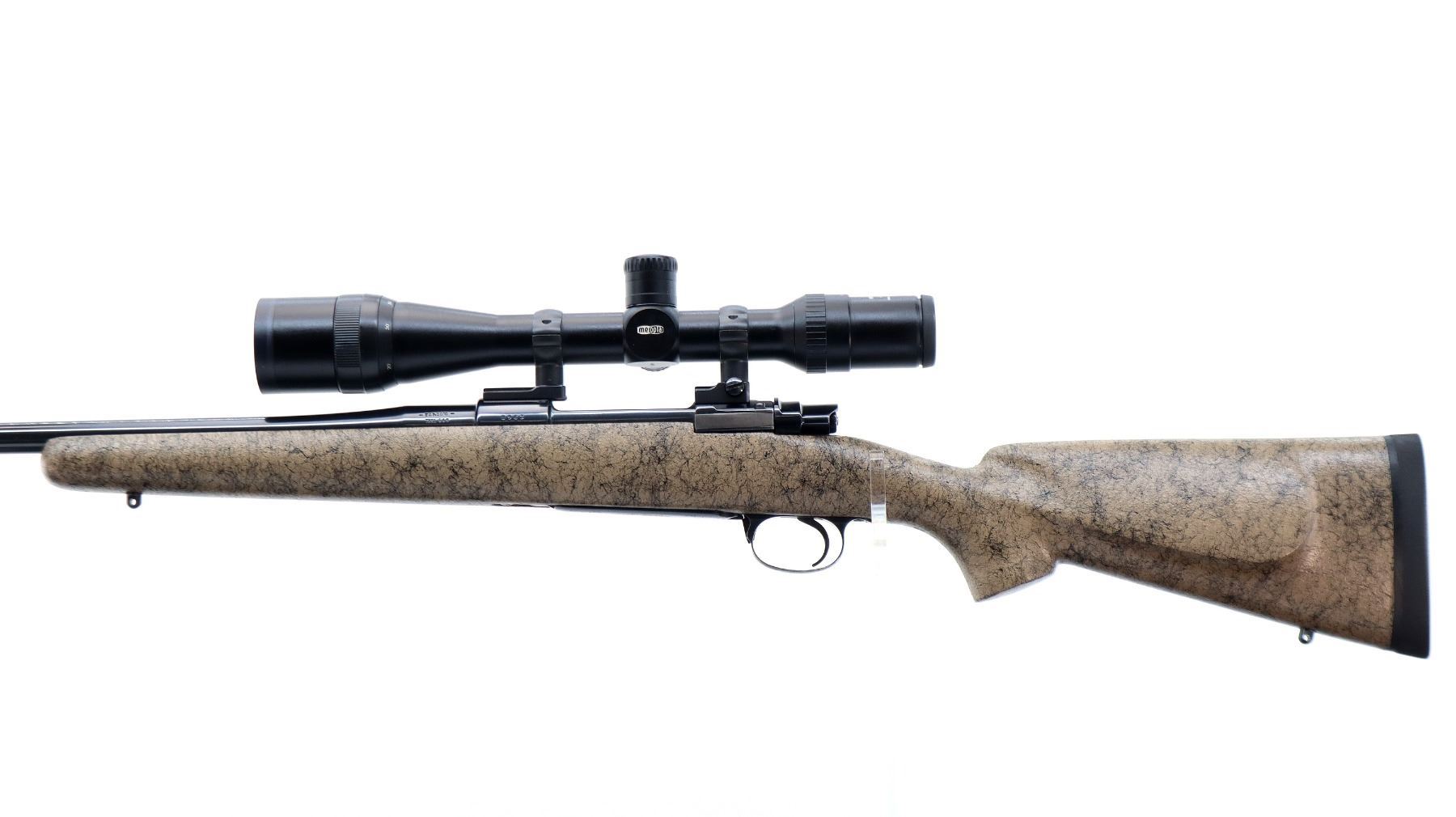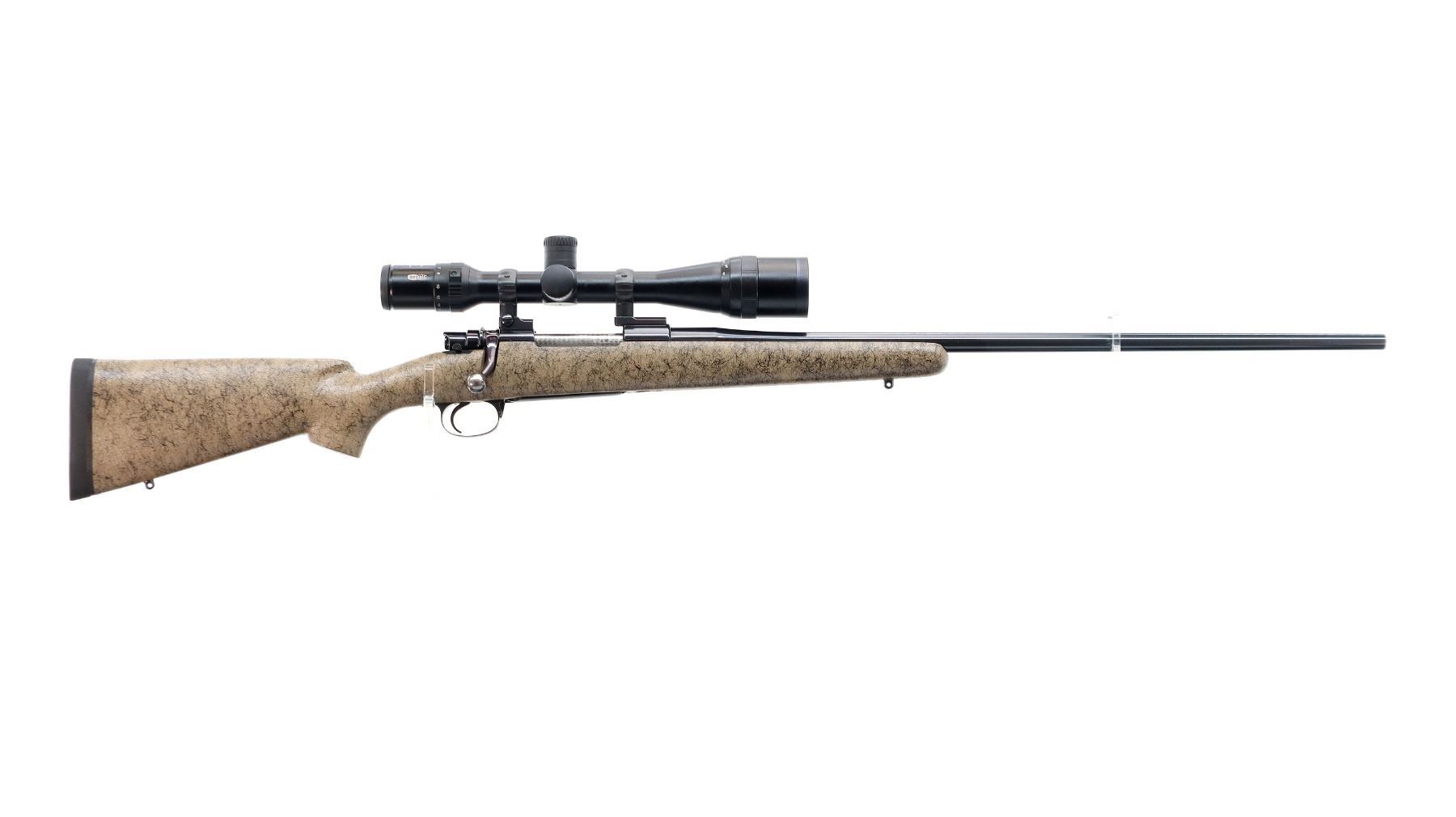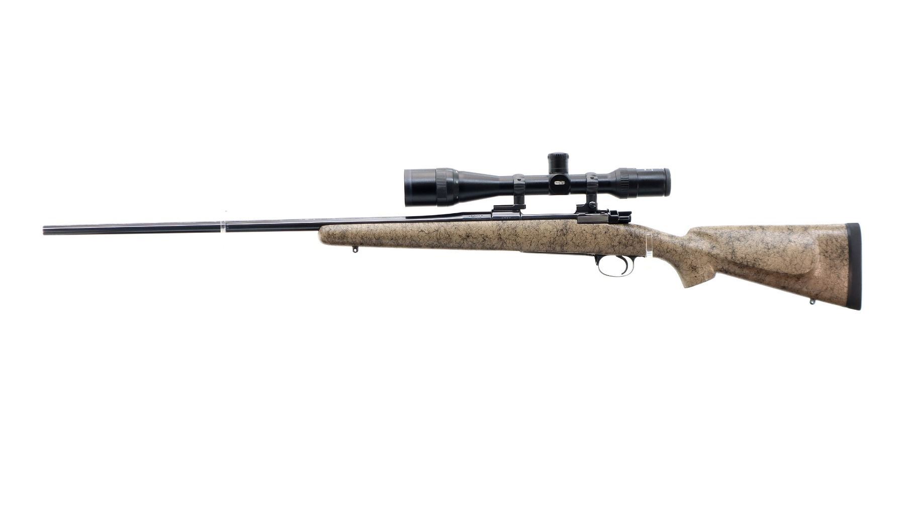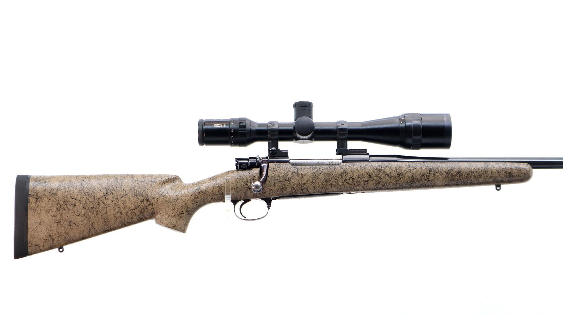 Main Description: No sights, polish blued finish, receiver drilled and tapped with Meopta Meostar R1 4-16x44 AO Scope installed, clear optics with duplex crosshair. Jewelled bolt with low scope handle and checkered flat bottom knob. One piece tan/black spiderweb fiber glass stock, cheek rest, black rubber recoil pad, engraved trigger guard and hinged floor plate, adjustable Timney trigger, swivel studs.