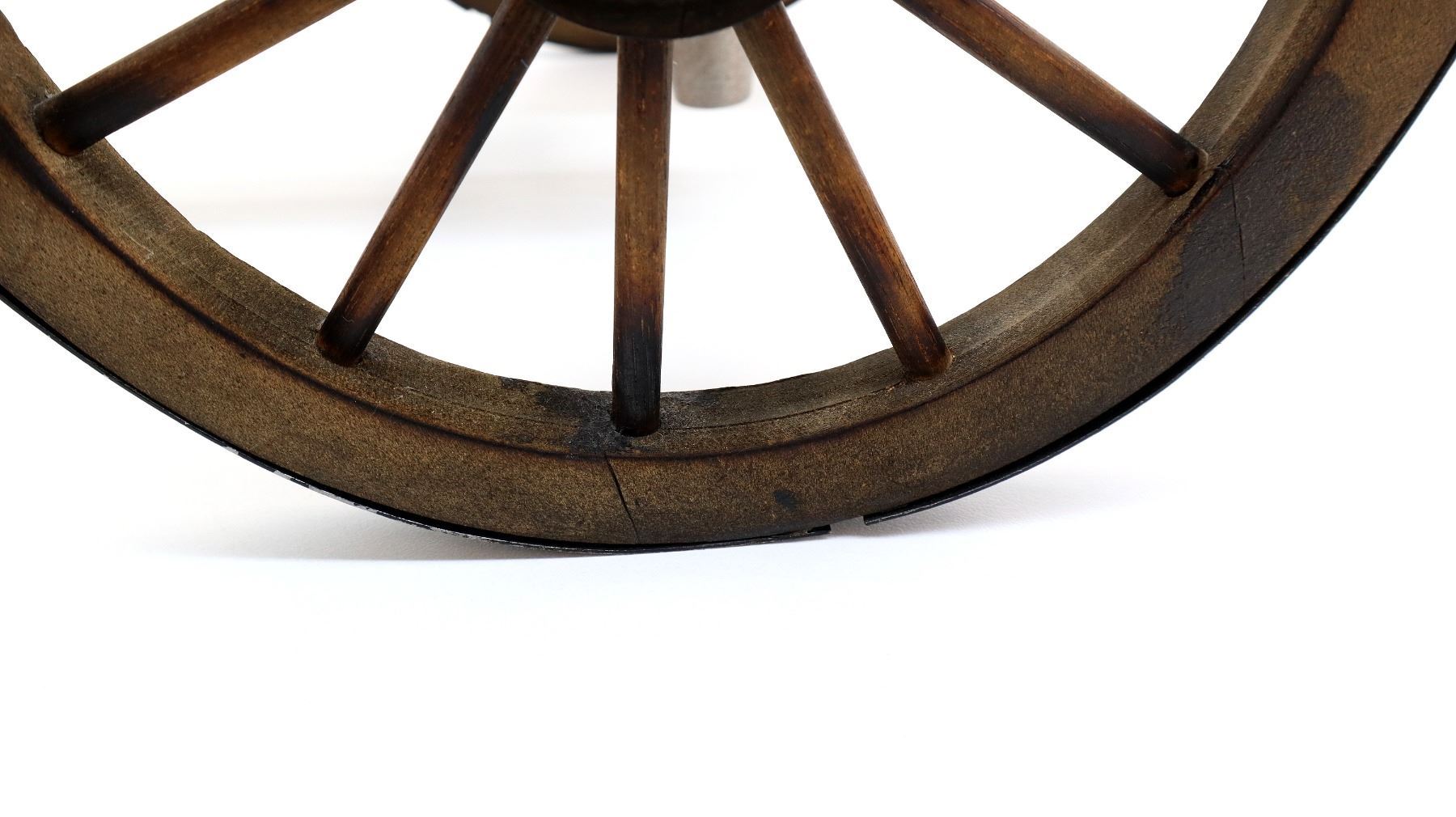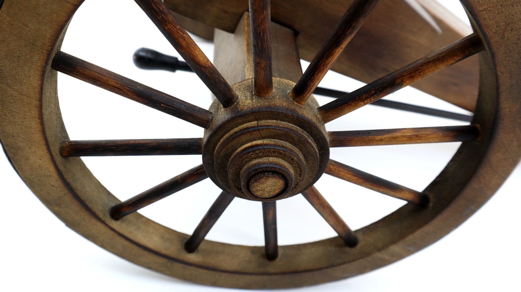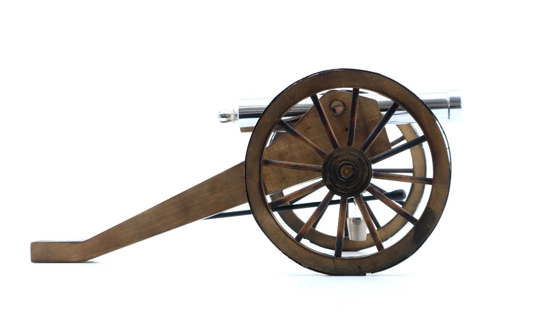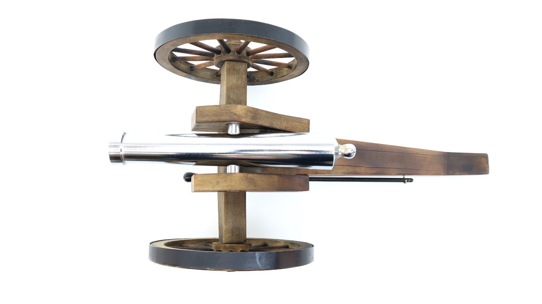 Main Description: This replica field cannon has a half inch bore only drilled 2.5" in depth no flashole, non firing. No sights, chrome plated barrel with trunnions. Wood field type carriage with metal wrapped wood spoked wheels, has ramrod and small bucket attached. OAL length approx. 18", OAL Height Approx. 7", OAL Width approx. 10.5".