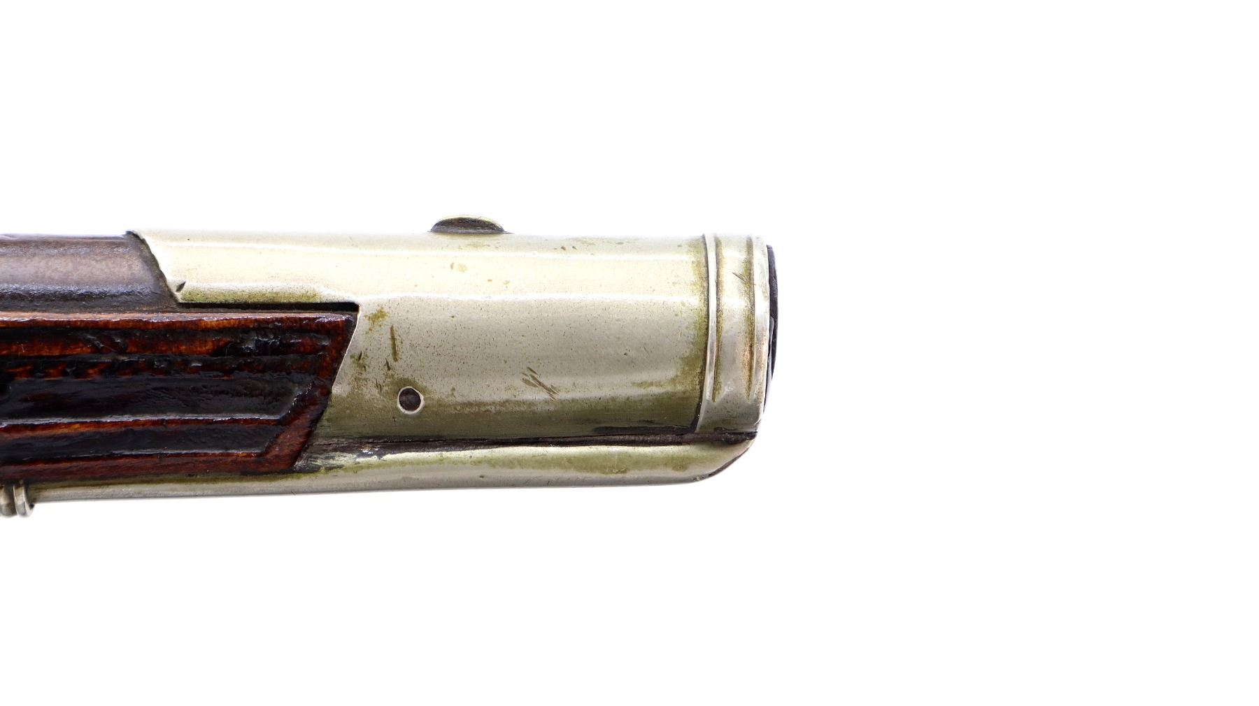 Main Description: Blade front sight, fixed u notched rear sight, engraved steel barrel and lock with brass hammer that does not function, nipple is intact. One piece carved wood grip which is cracked and chipped, repair on right side behind lock, silver pommel cap with chips and cracks, vanity plate, engraved trigger guard which has been repaired, silver nose cap.