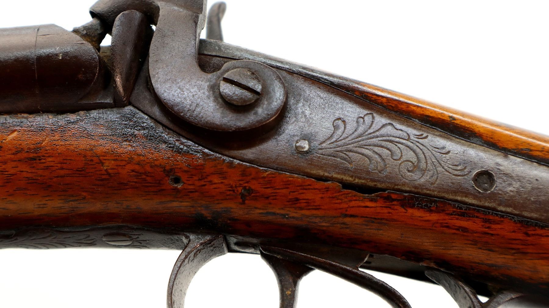 Main Description: Brass bead, Damascus barrels with smooth rib, engraved back action locks with checkered spur hammers that function. One piece half length wood stock, forearm wedge is damaged, checkered straight grip, chipped behind tang and around locks, smooth steel butt plate, engraved steel trigger guard, replaced wood ramrod.