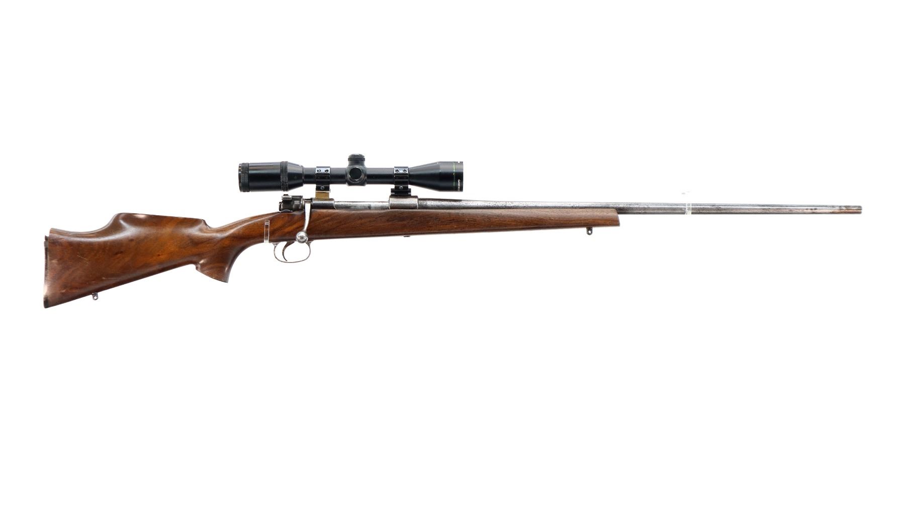 Main Description: No sights, tapered round barrel, receiver drilled and tapped with Pentax Gameseeker 4-12x40 scope installed, clear optics with range finding reticle, note: magnification ring does not turn. Modified bolt handle. One piece wood stock, pistol grip, cheek rest, grooved black polymer butt plate chipped and cracked at heel, stock cracked at heel, swivel studs.