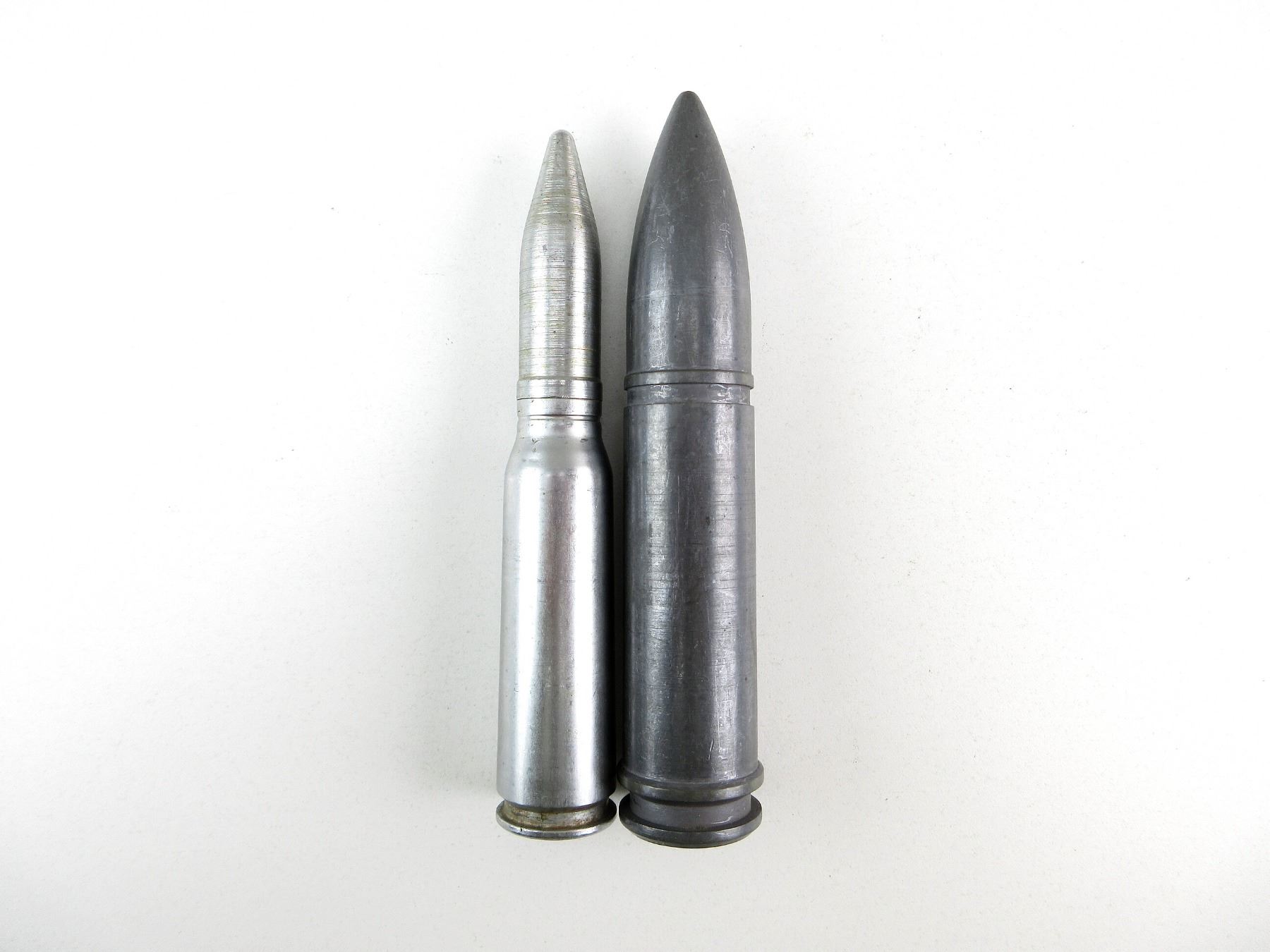 LOT INCLUDES; (1) 30MM X 100MM METAL DUMMY ROUND, 1-PIECE, VARIOUS HAND-WRITTEN MARKINGS ON CASING BODY, BOTTOM MARKED: "DUMMY CARTRIDGE 30MM", APPROX. 1.5" DIA., OAL APPROX. 7" & (1) 20MM X 102MM STEEL DUMMY ROUND, NO PRIMER, NO VISIBLE MARKINGS, APPROX. 1 1/8" DIA. & OAL APPROX. 6 5/8". SEE PHOTOS.
