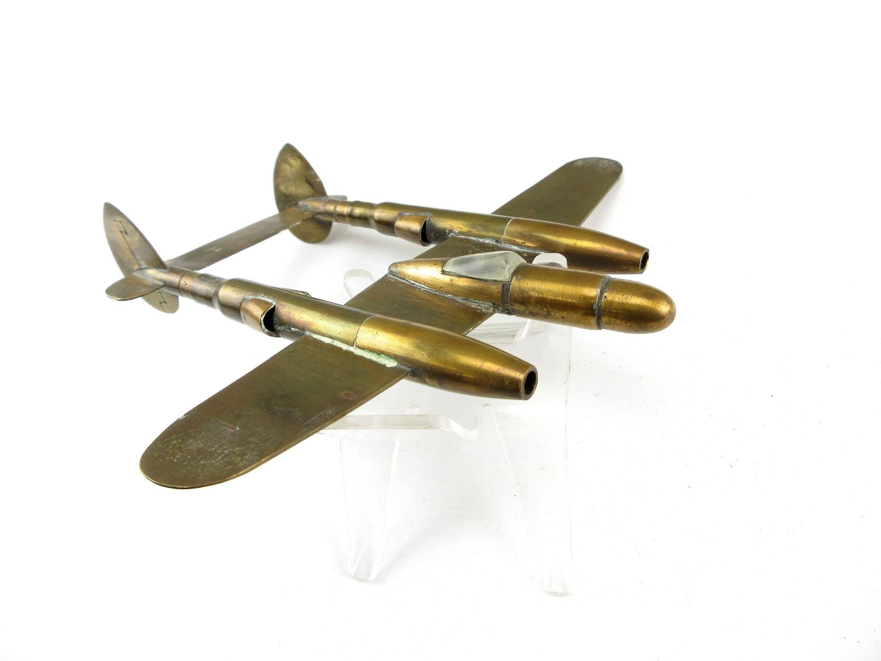 (1) BRASS / COPPER CONSTRUCTED TRENCH ART PLANE, VARIOUS UNKNOWN CASINGS CUT / BUILT INTO PLANE, NO VISIBLE MARKINGS, APPROX. 6.25" X 7". SEE PHOTOS.
